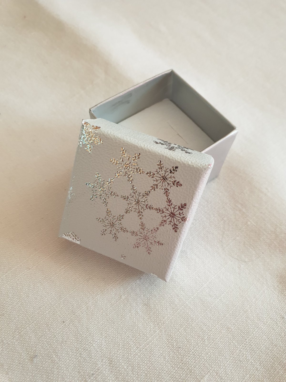 Papírová dárková krabička s vánočním motivem a bílou poduškou uvnitř. Rozměry: 40x40x30 mm. Vhodná pro soupravu - prsten, řetízek nebo náušnice, řetízek.