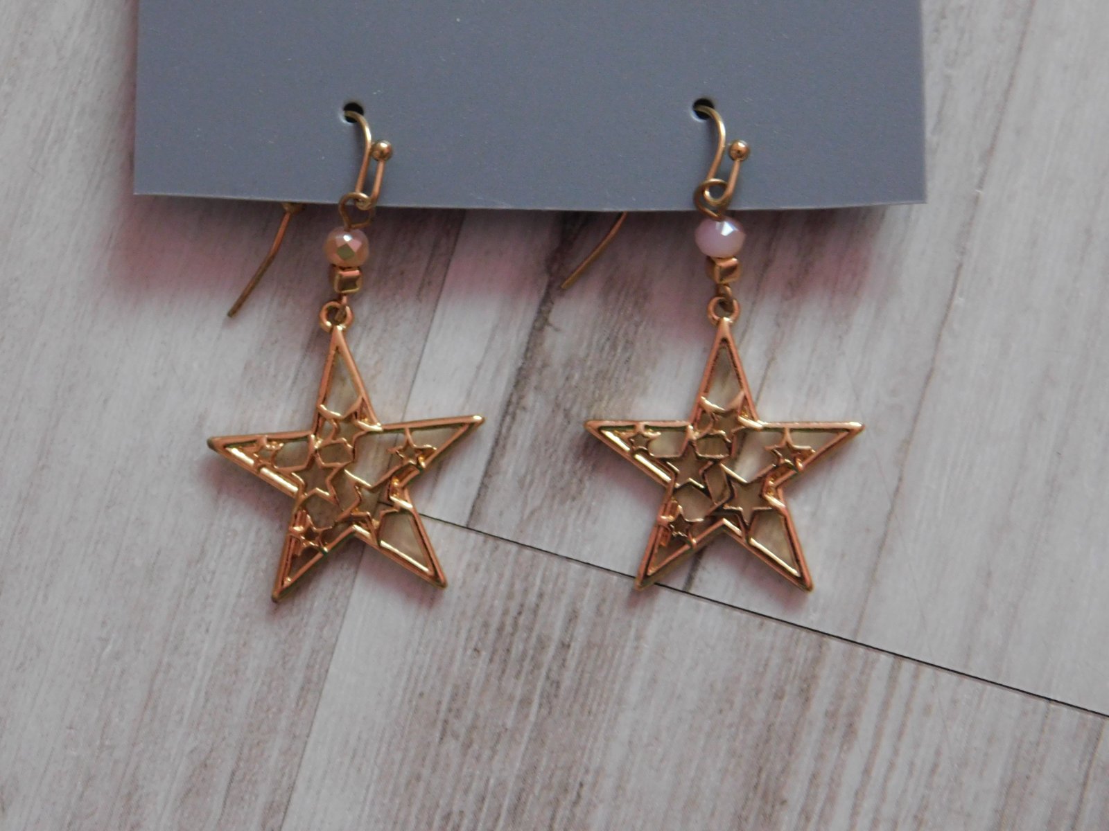 jednoduché velké kruhy ve zlatém odstínu, lesklý a hladký povrch. zapínání je na francouzský zámek, u kterého se pohyblivá vlnka zacvakne do protilehlé vidlice. Průměr: 45 mm. bižuterie