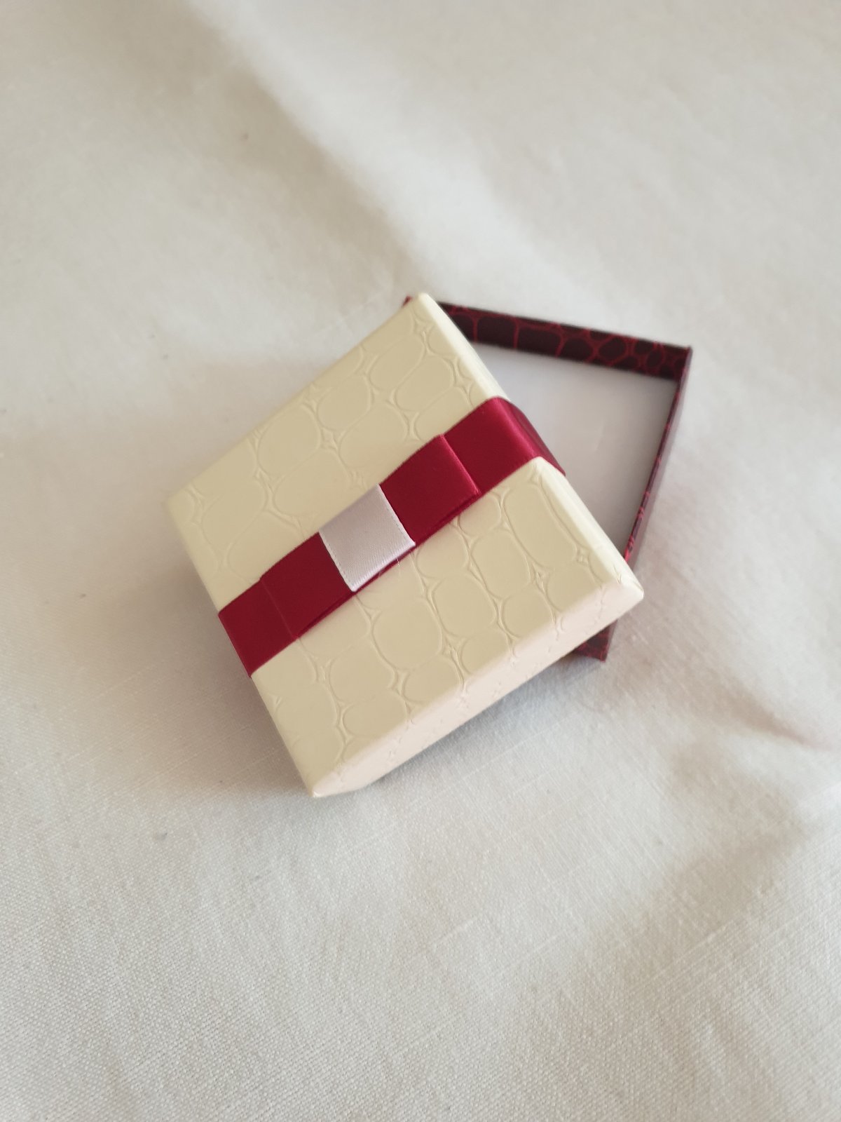 Papírová dárková krabička s červenou mašlí a bílou poduškou uvnitř. Rozměry: 60x60x25 mm. Vhodná pro soupravu - prsten, řetízek, náušnice pecky.