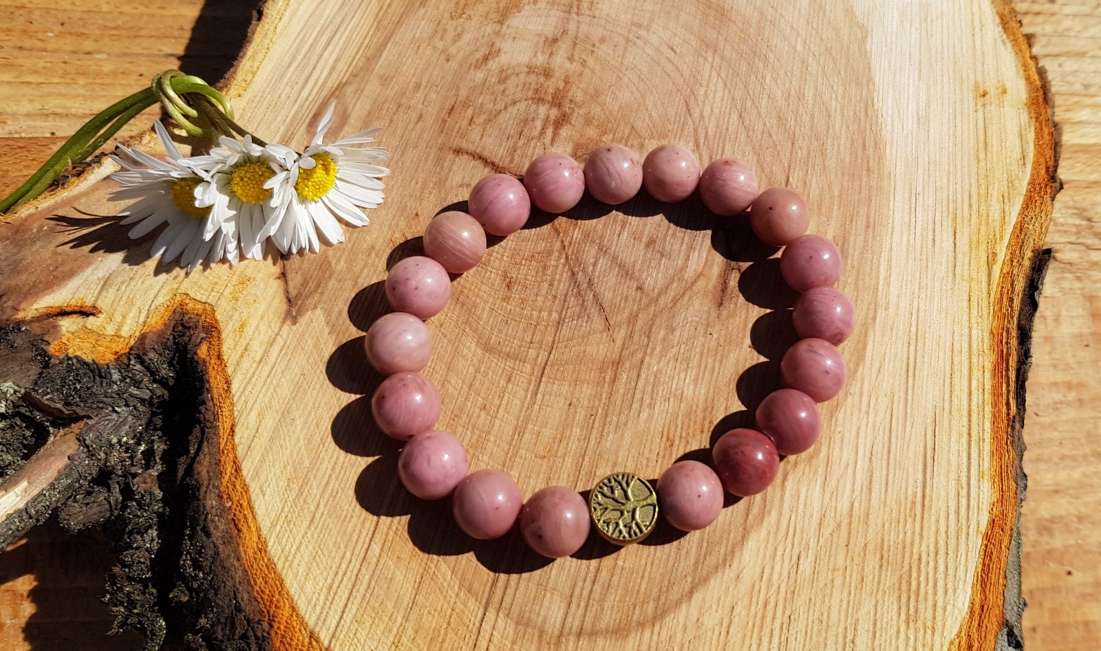 Růžový náramek pro milovanou osobu z korálků Rodonitu. Romantický náramek se symbolem stromu.
