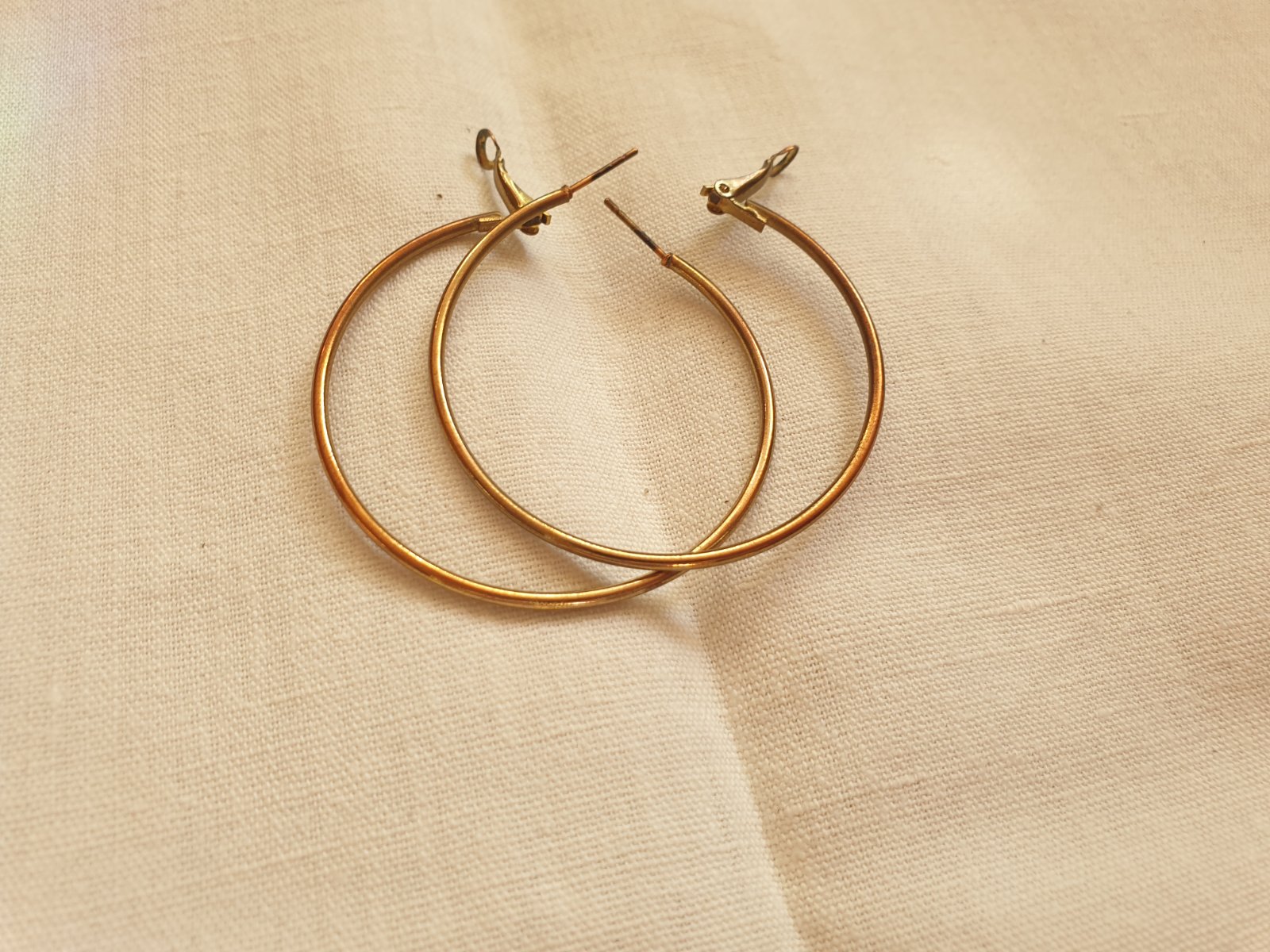 jednoduché velké kruhy ve zlatém odstínu, lesklý a hladký povrch. zapínání je na francouzský zámek, u kterého se pohyblivá vlnka zacvakne do protilehlé vidlice.