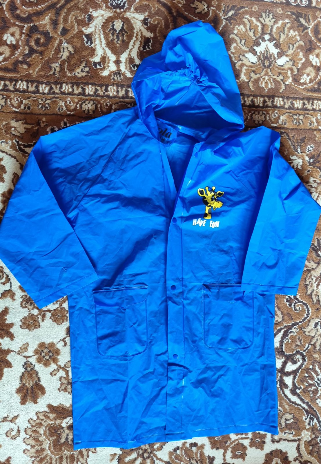 Nepromokavá bunda, uvedená velikost je 123-140. Nenošená, jen jsme měli s sebou složenou v batohu. Na předním díle je kapsa, do které se celá bunda složí.