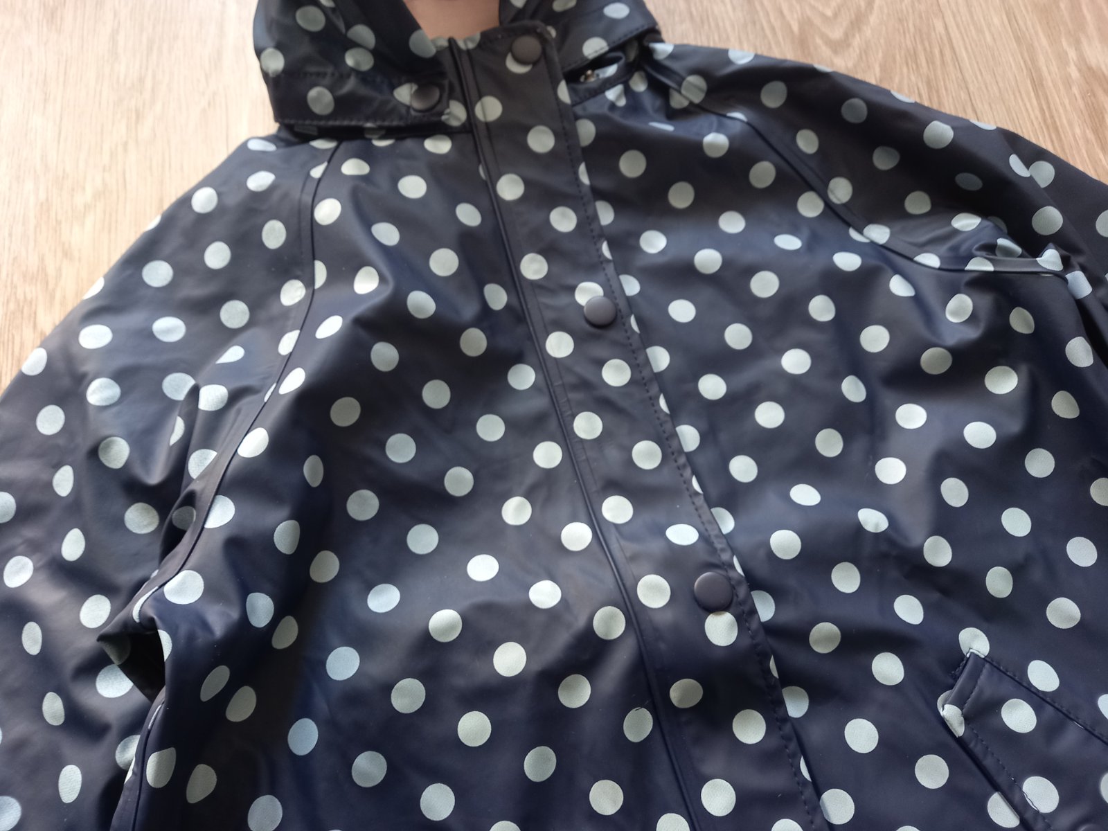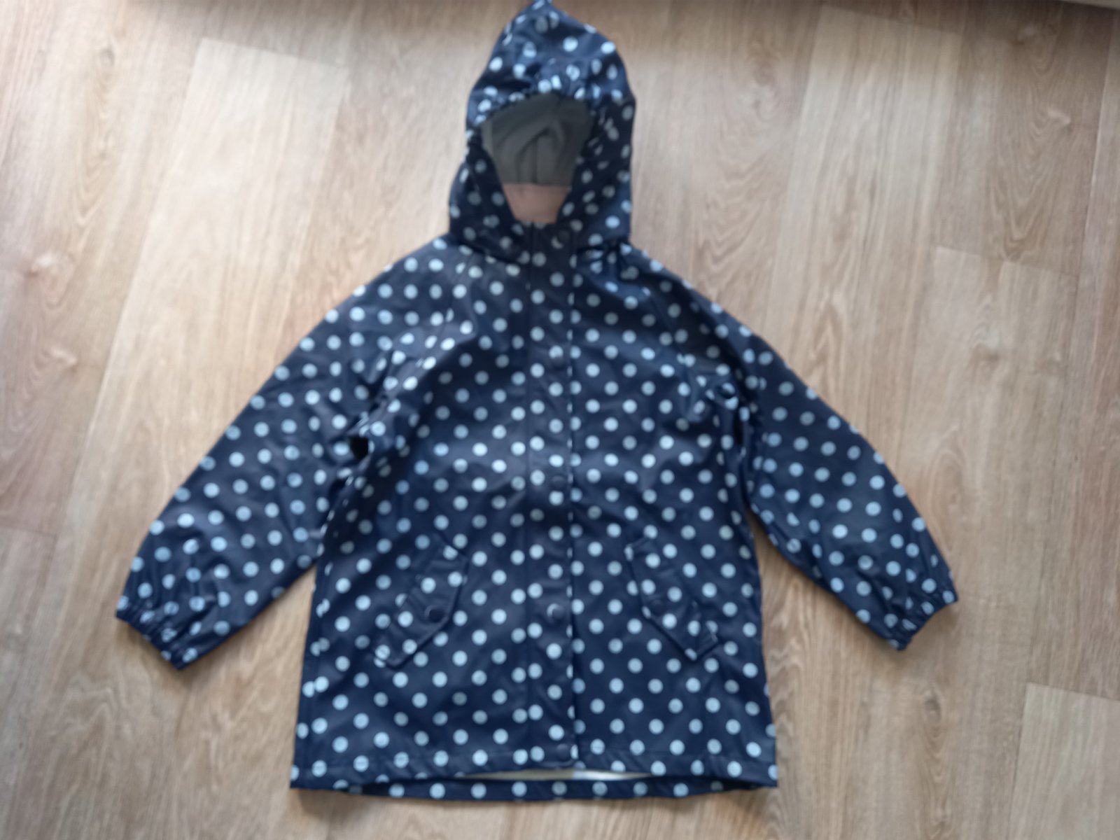 Nepromokavá bunda, lepené švy. Top stav, 2x na sobě. Bez podšívky, kapuce oddělovací na druky, zapínání na kostěný zip a druky. Vel. 122/128.