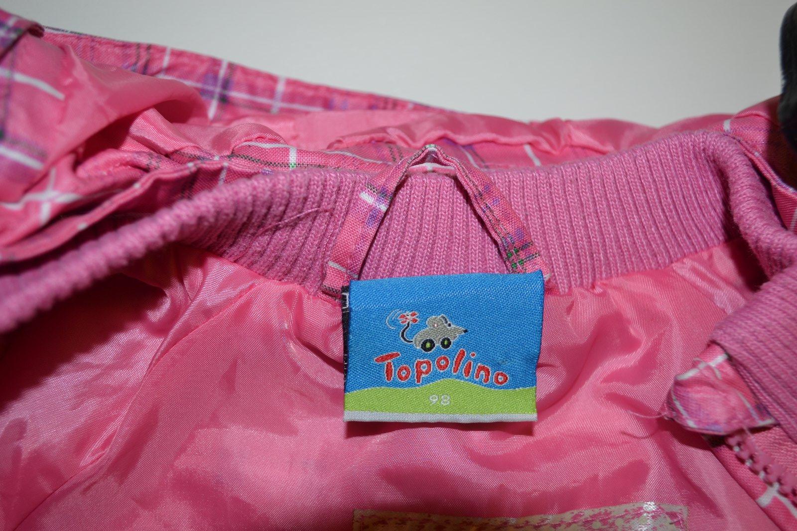 Nabízím nošenou bundu zn. Topolino vel. 98. Délka 38 cm, šířka v průramcích 2×33 cm, rukáv od krku 41 cm. Odepínací kapuce. Bez zateplení.