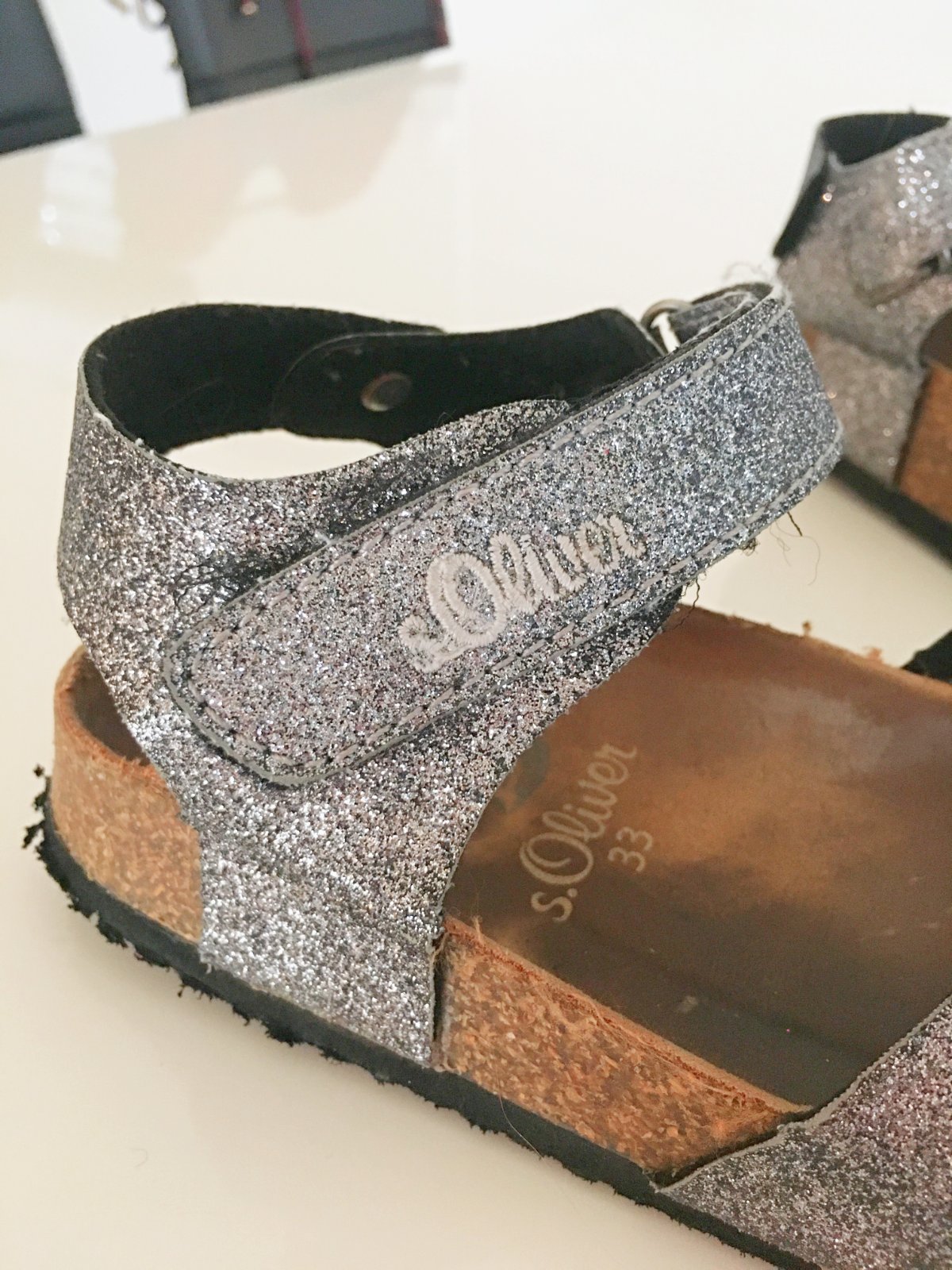 Stříbrné třpytivé sandálky na suchý zip s anatomicky tvarovanou stélkou (na levé vnitřní botce a na špičkách je shrnutá), korková podešev je v pořádku.