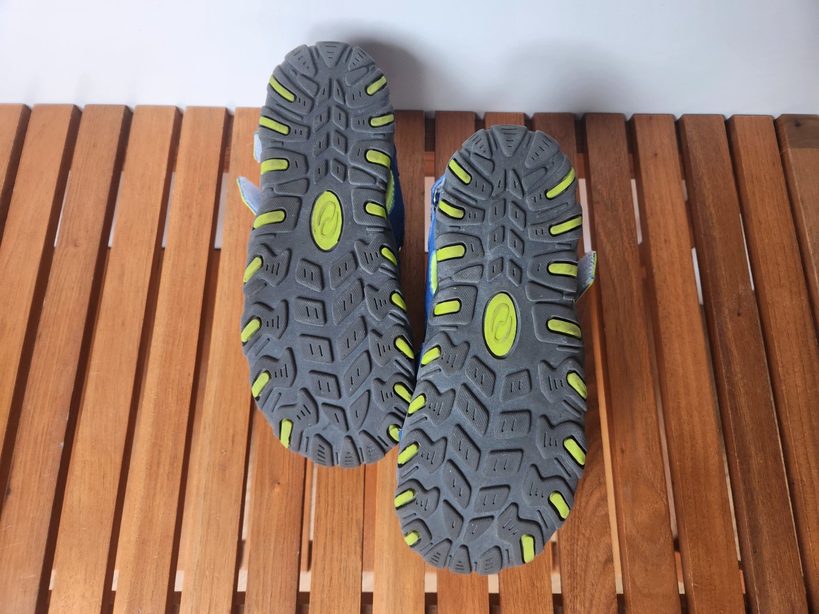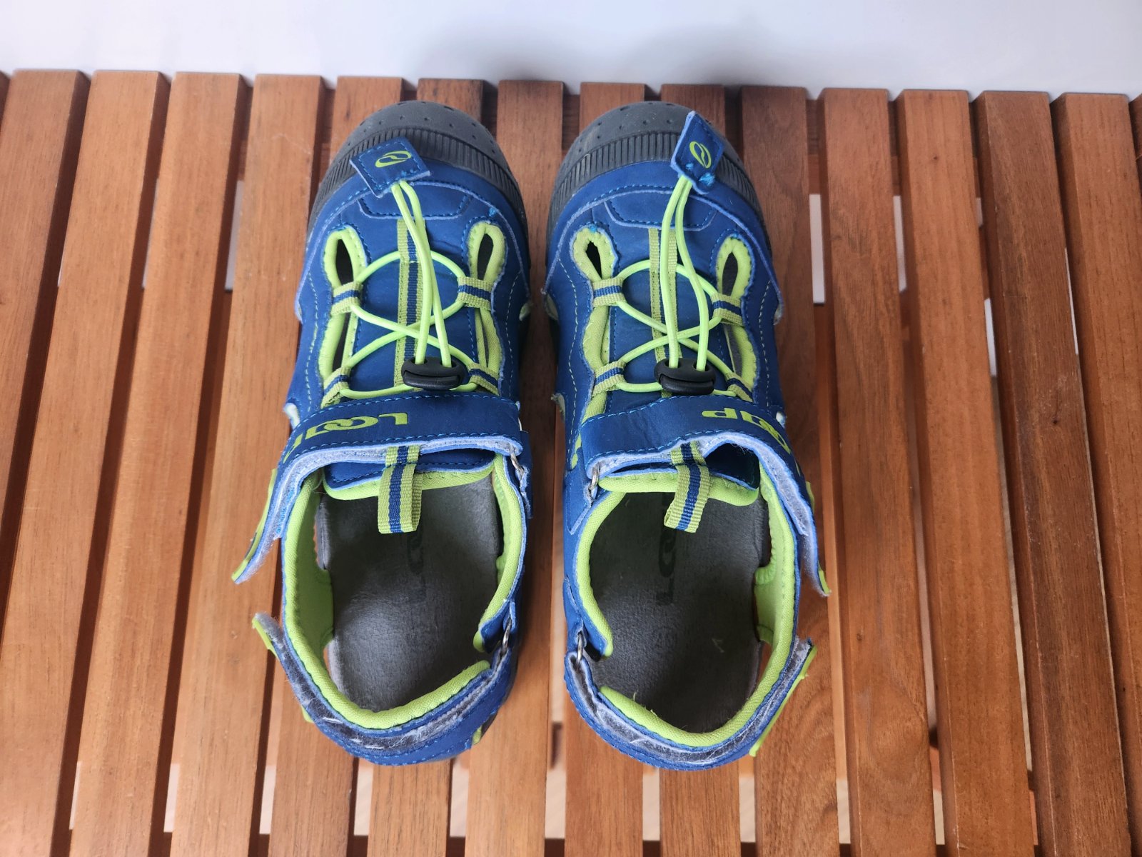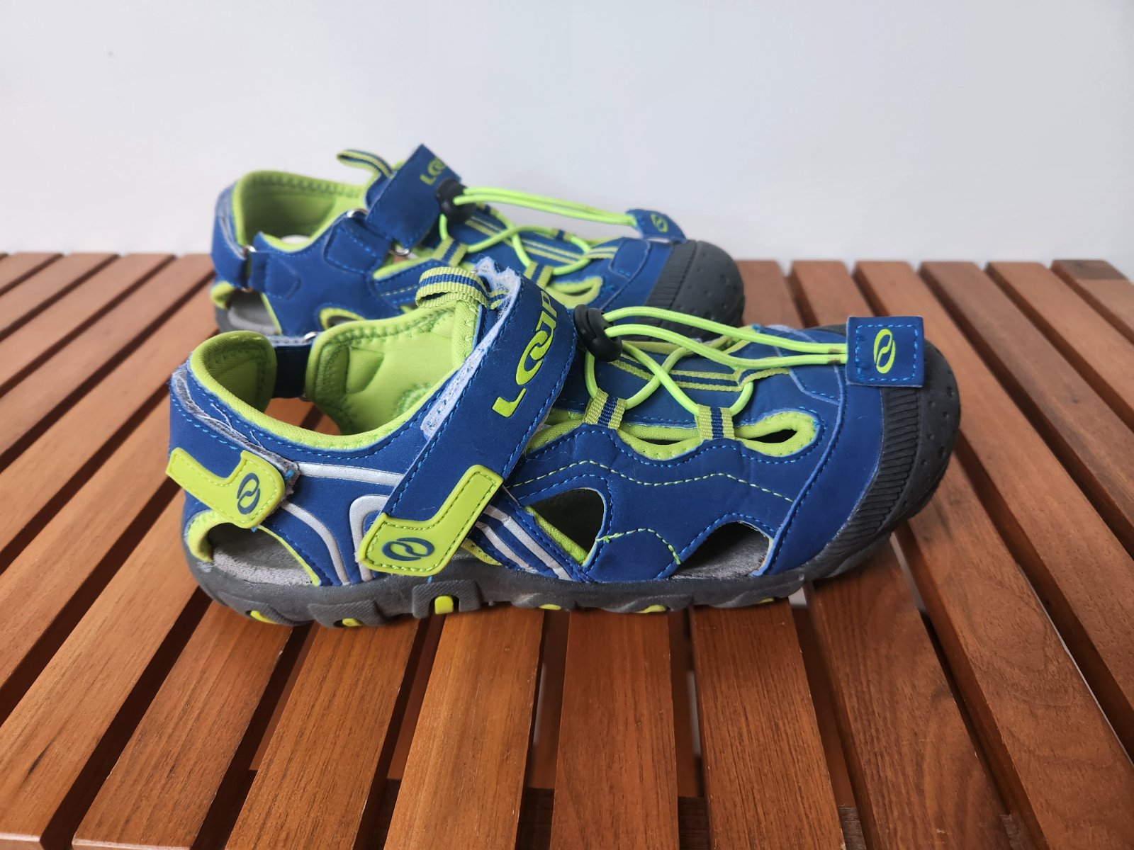 Modré sportovní sandály zn. LOAP, neonově zelené doplňky, plná špička, pásky na suchý zip, stahovací gumička.