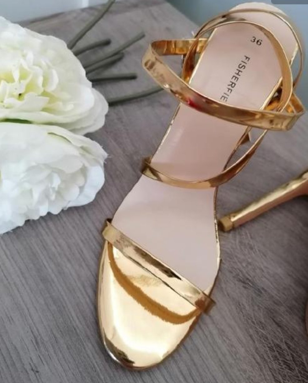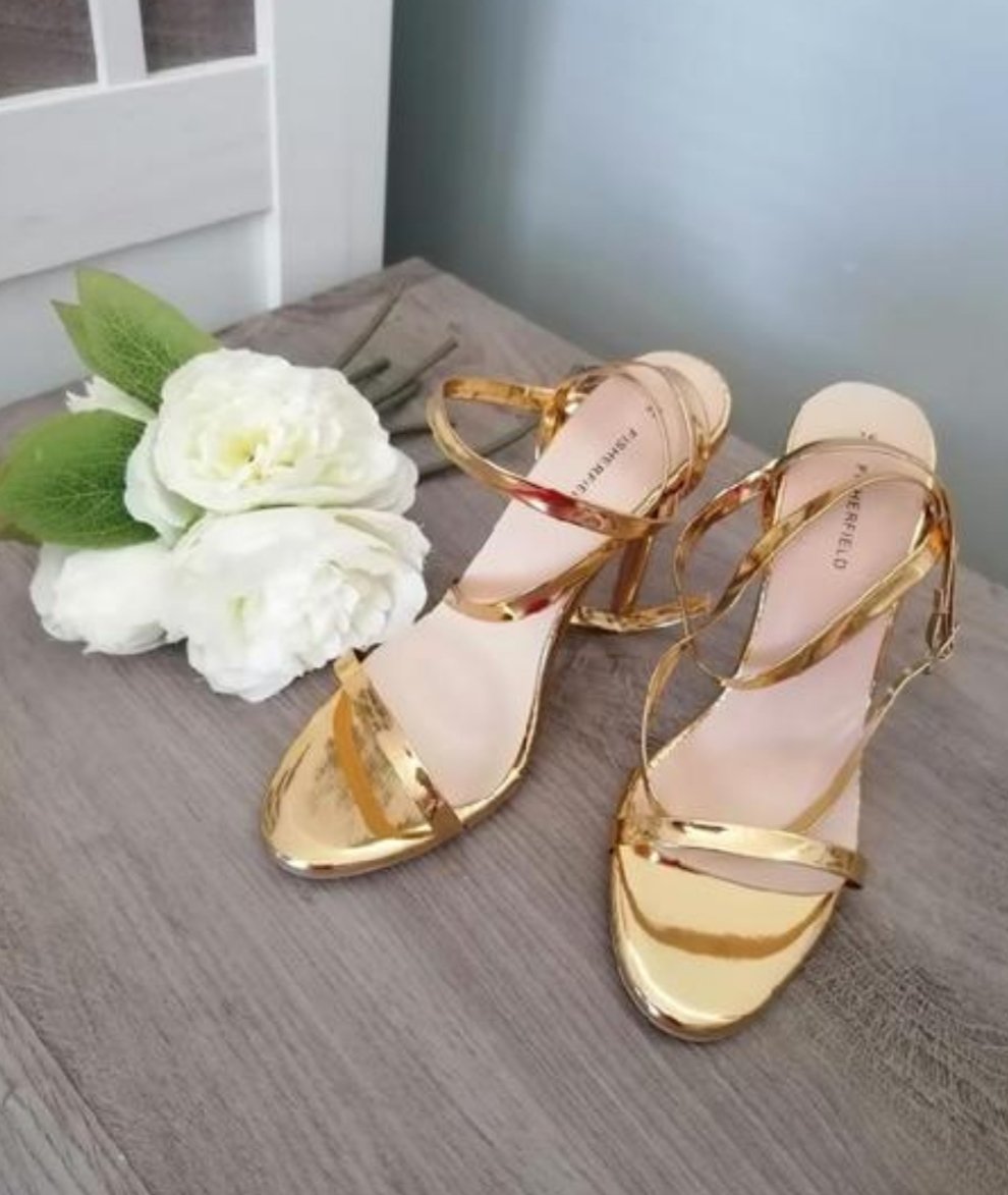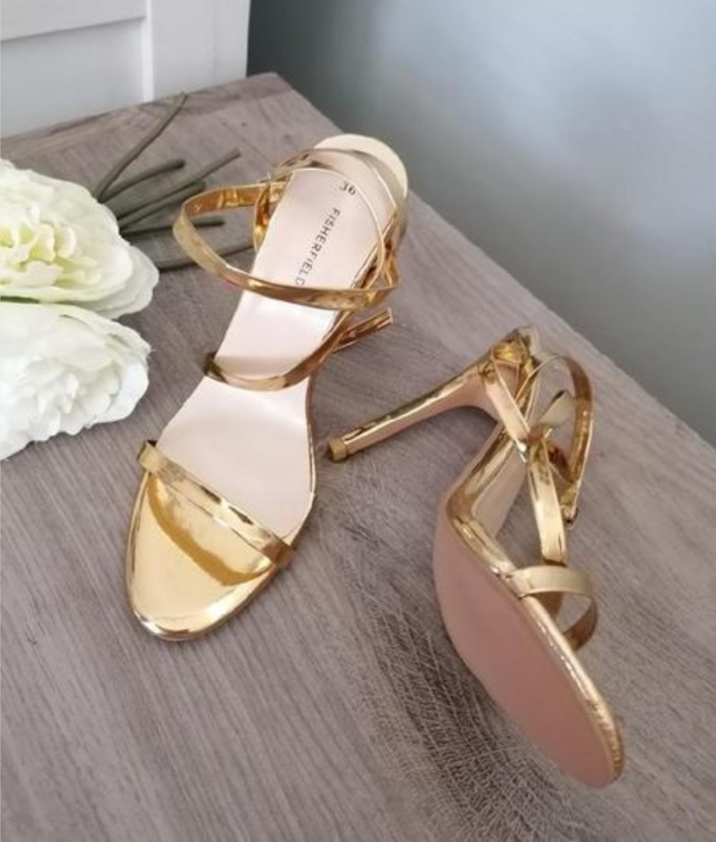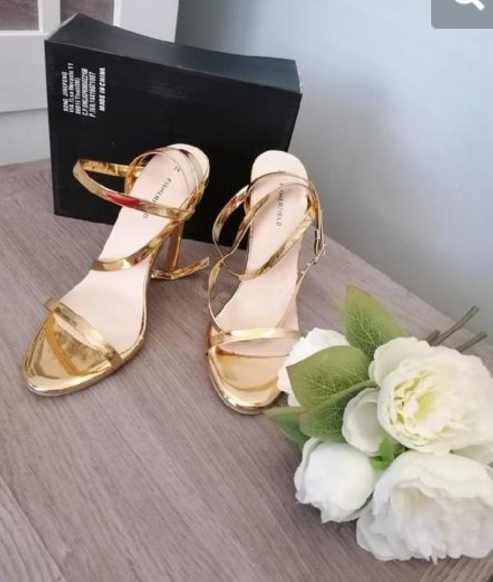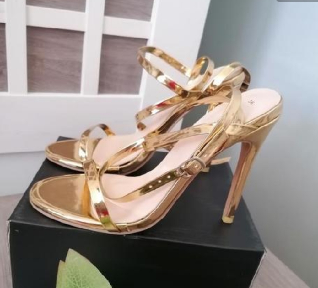 Krásné zlaté sandálky....Měla jsem je jen jednou na noze při focení v místnosti....Zaručuji perfektní stav! Délka stélky je 23 cm, výška podpatku je 11 cm....Poštovné - balíkovna 85 Kč nebo zásilkovna za 90 Kč.
