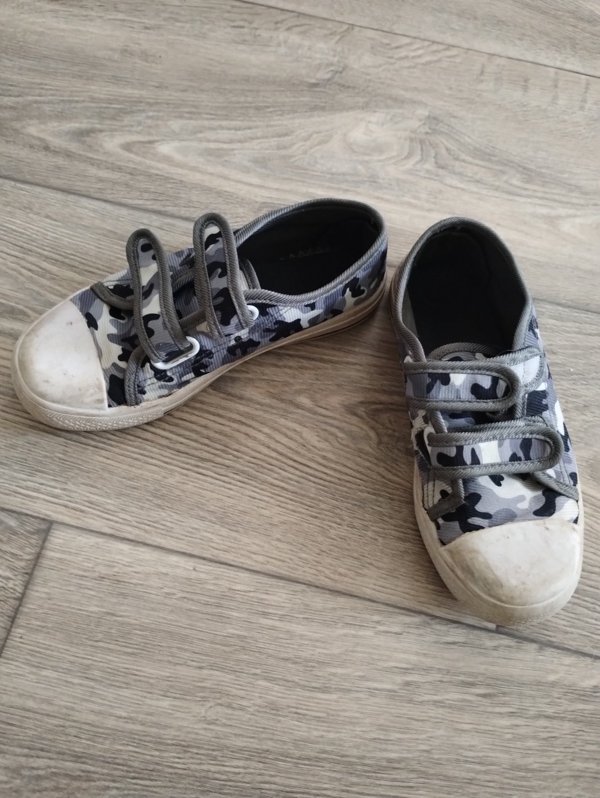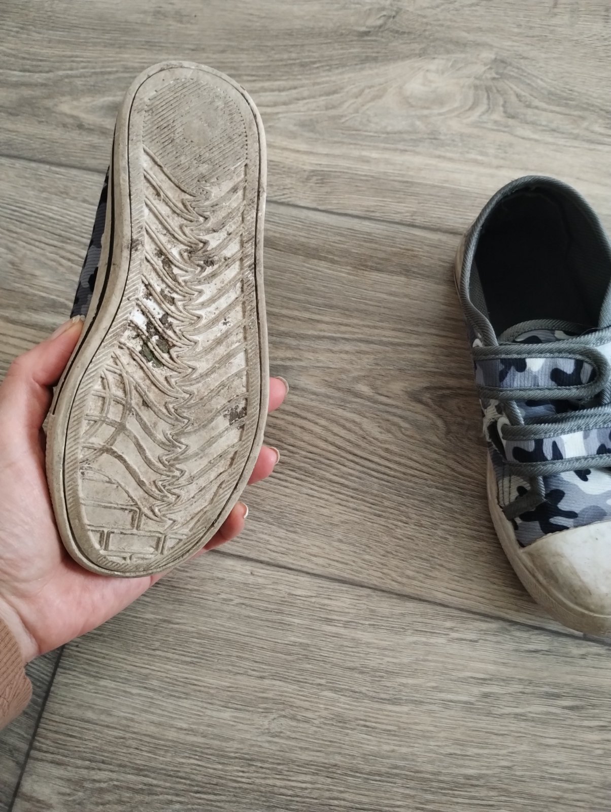 Tenisky nošené, na špičkách je guma trošku ohlodaná, je potřeba přilepit gumu po stranách tenisek, odstává, službu ještě udělají dobrou. Stelka cca 20 cm. M.