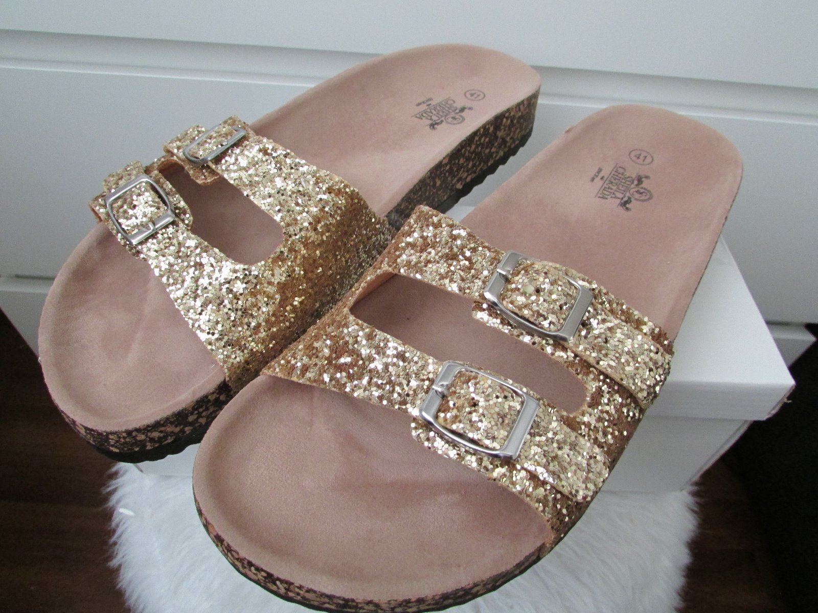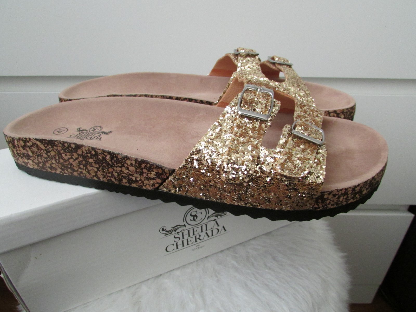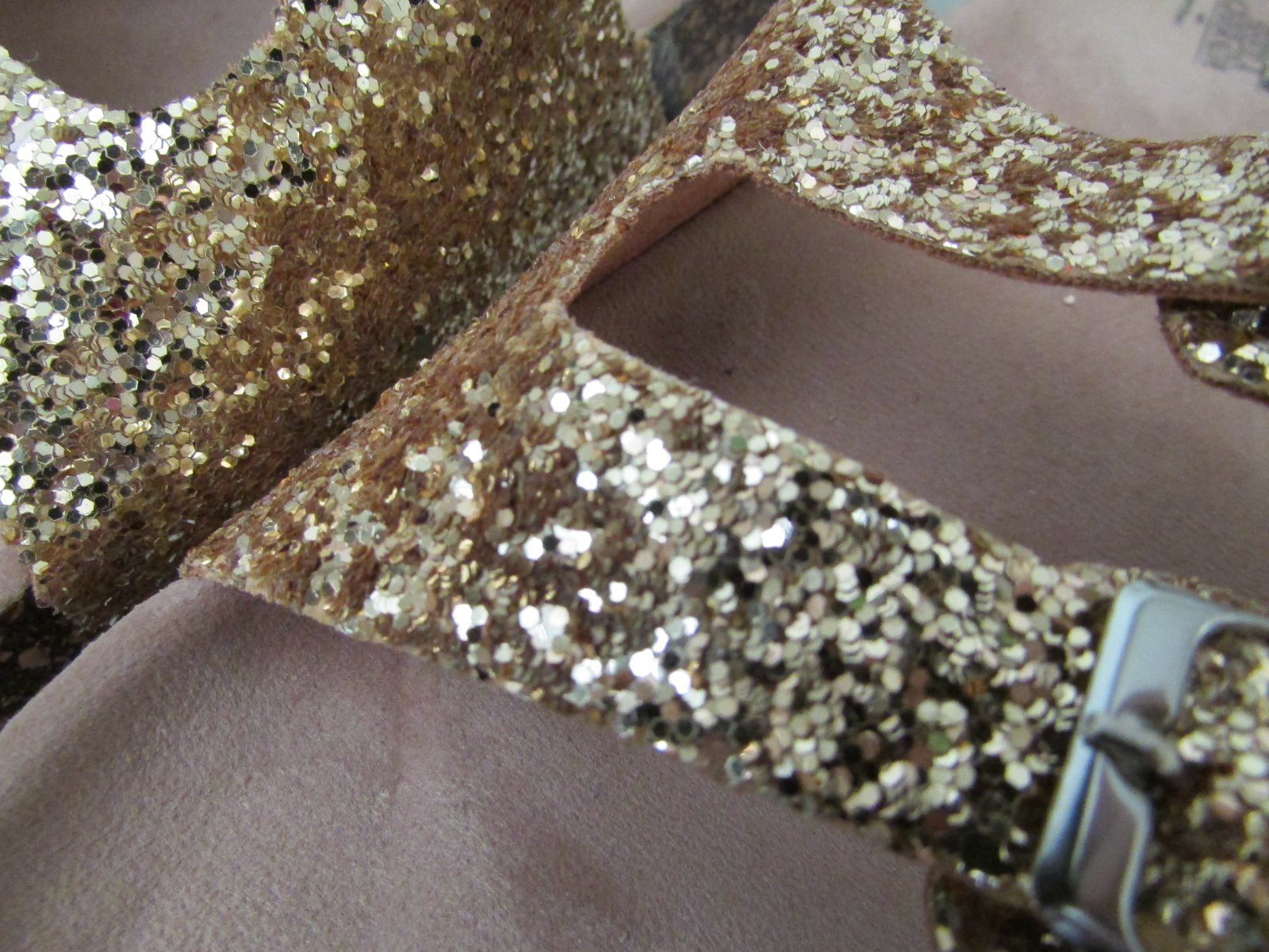 Korkové nazouváky na 2 nastavitelné pásky, zlaté třpytky, měkká, hebká stélka.