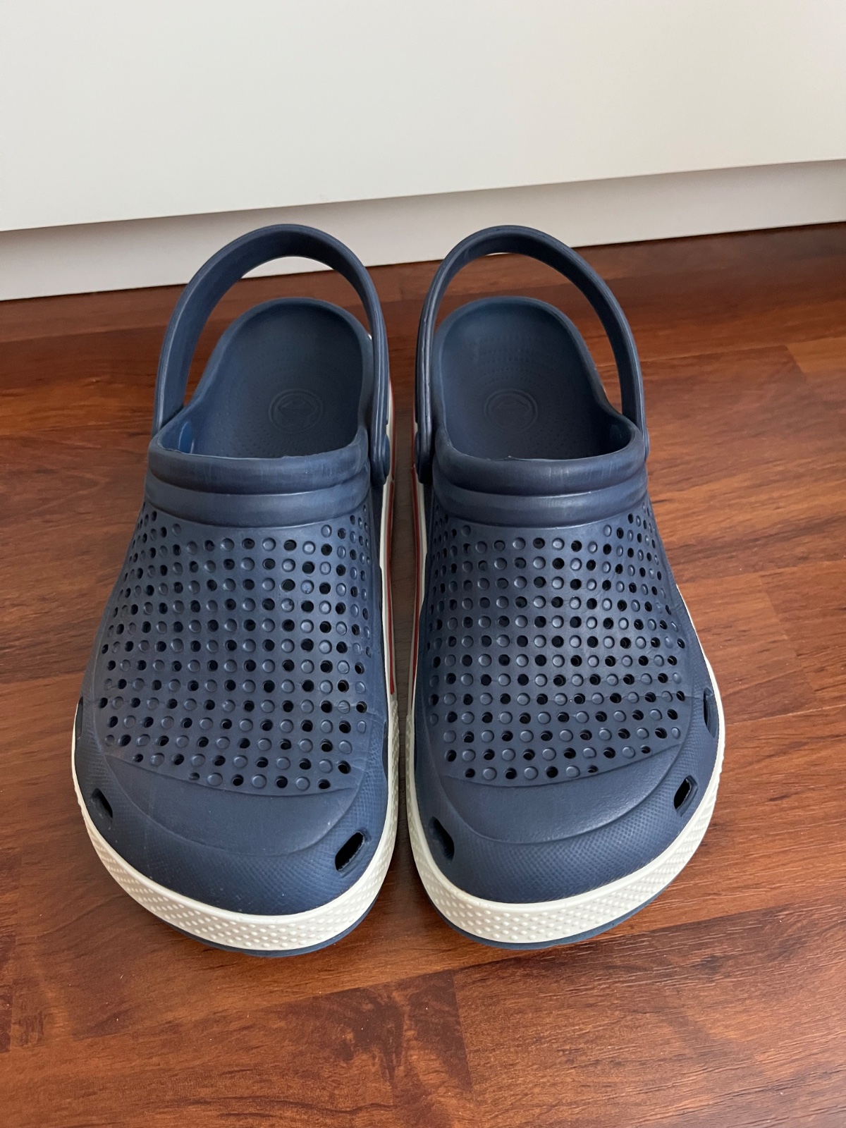 Tmavě modré barvy s bílou a červenou.
