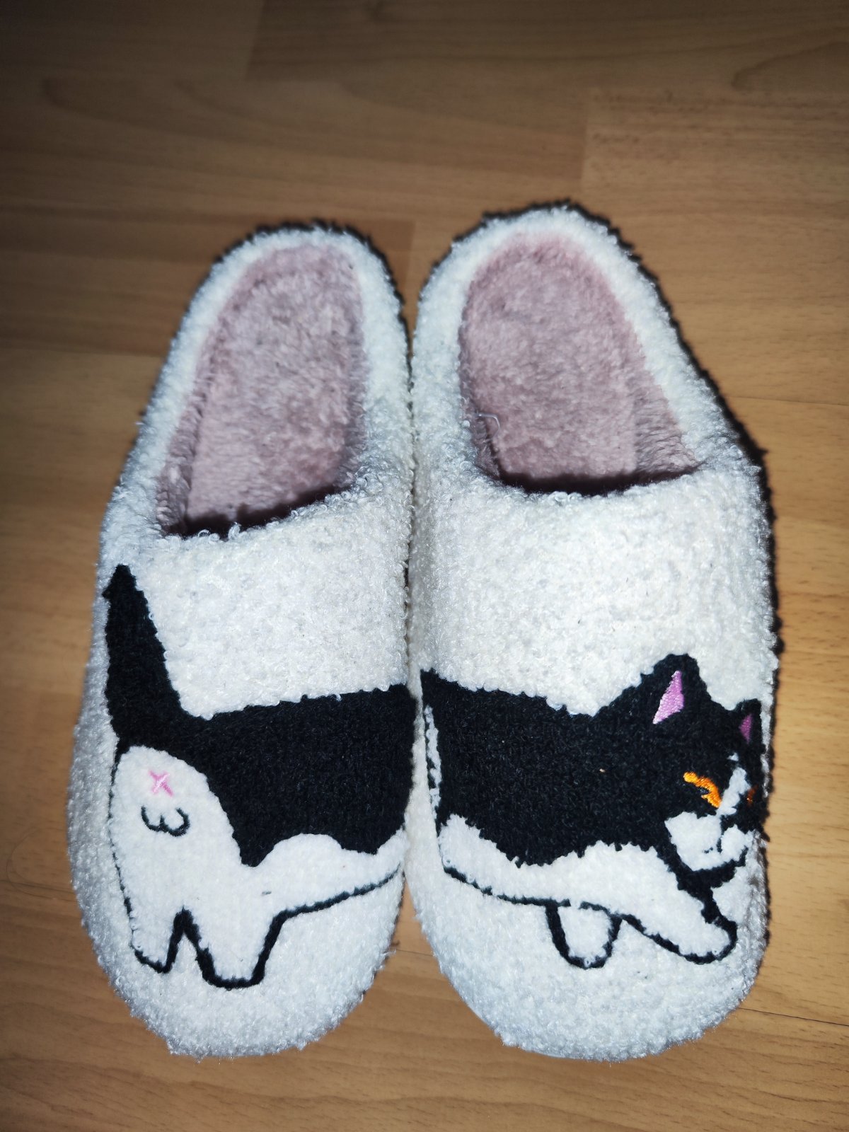 Prodám domácí bačkůrky s kočkou a měkkou výstelkou, uvedená velikost 38-39, délku stélky jsem naměřila 23, takže velikost spíš 37-38. Měkké, pohodlné a s dávkou humoru. Každá bačkorka nese část kreslené kočky – jedna předek, druhá zadeček. Když je dáte vedle sebe vznikne celá chlupatá potvůrka, připravená zahřát vám nohy i náladu. Podrážka je protiskluzová, s decentním vzorem. Minimálně nošené, mrkněte na foto. Cena 130 Kč, v Brně možné osobní předání.
