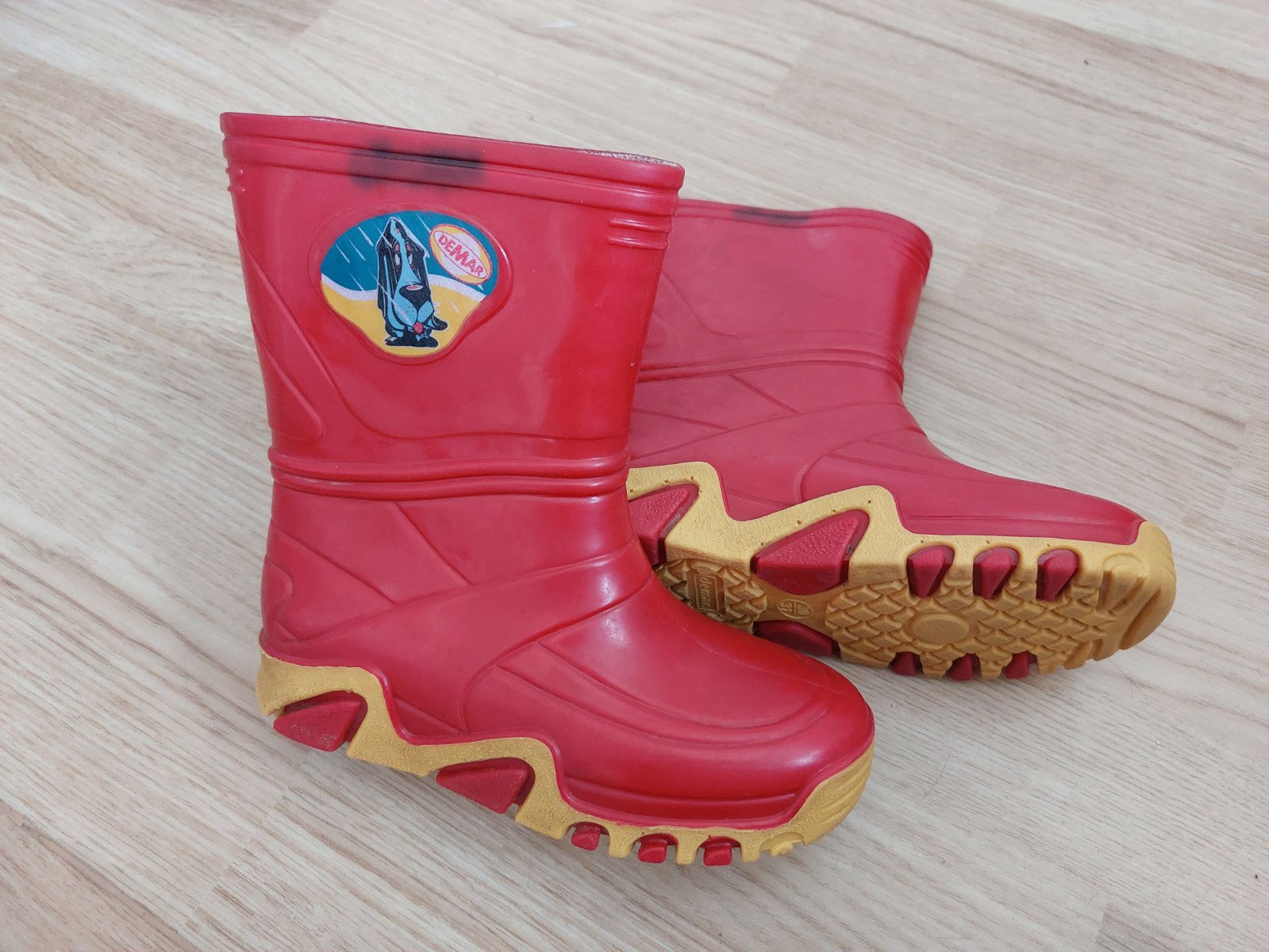 Gumovky Demar vel. 30/31, vepředu z boku poškrábané, viz fotky. Vnitřní vložky poničené. Délka stélky 19,5 cm, měřeno z vnější strany.
