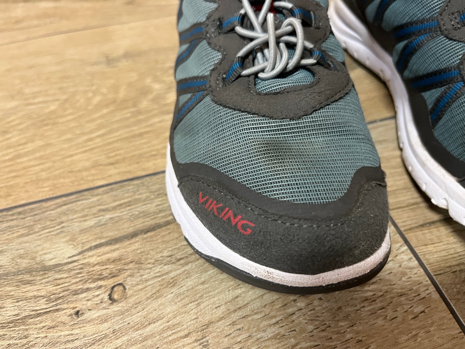 Tenisky jsou více nošené. Mají kulatou špičku a pro děti jsou velmi pohodlné. Na teniskách je několik fleků viz foto, nezkoušela jsem je prát. Na podrážce je vidět častější nošení. Zavazováni je nepoškozeno, dcera ho nepoužívala. Určitě tenisky ještě někdo na doma donosí. Roztrhlé ani zničené nejsou.