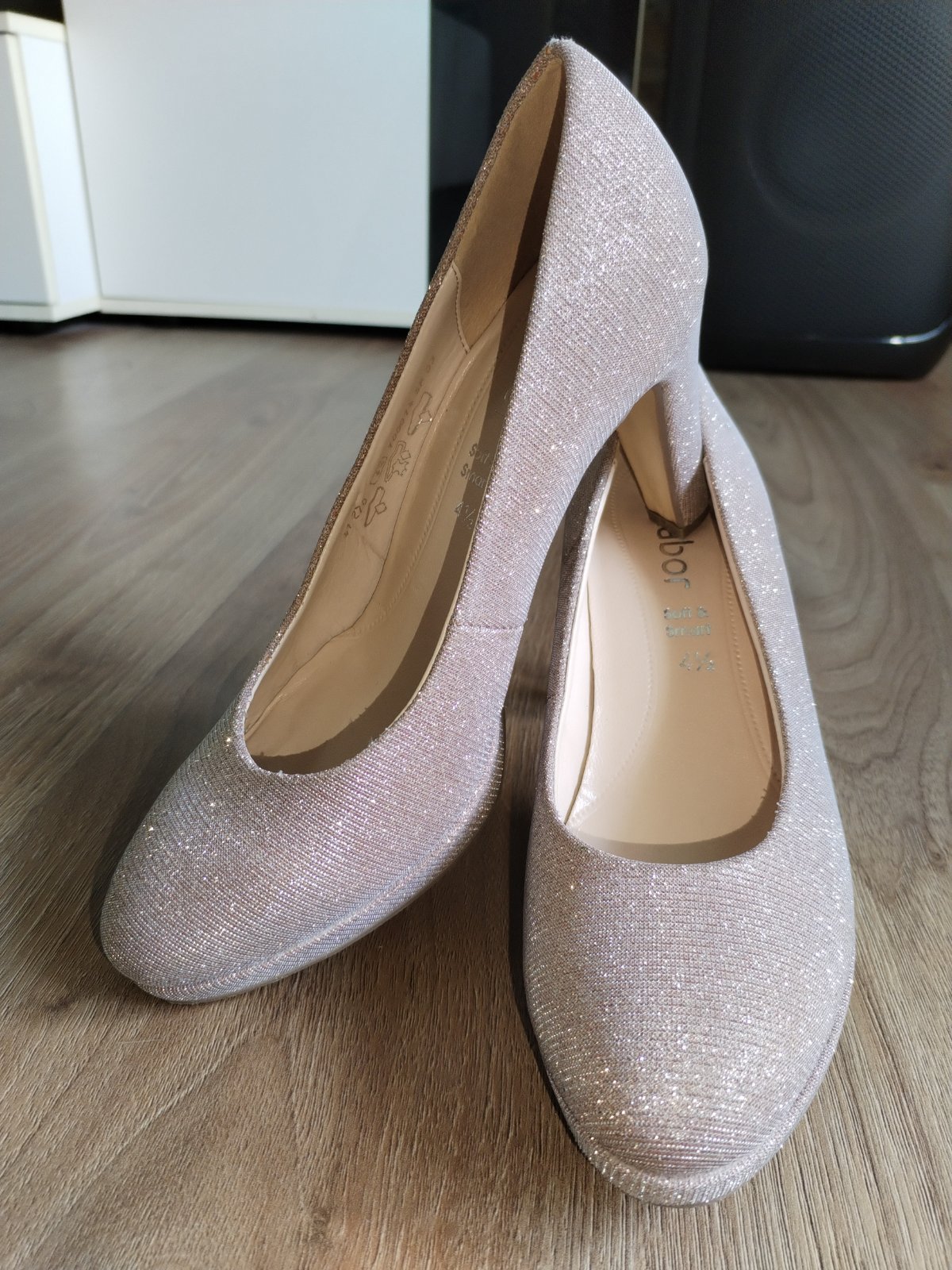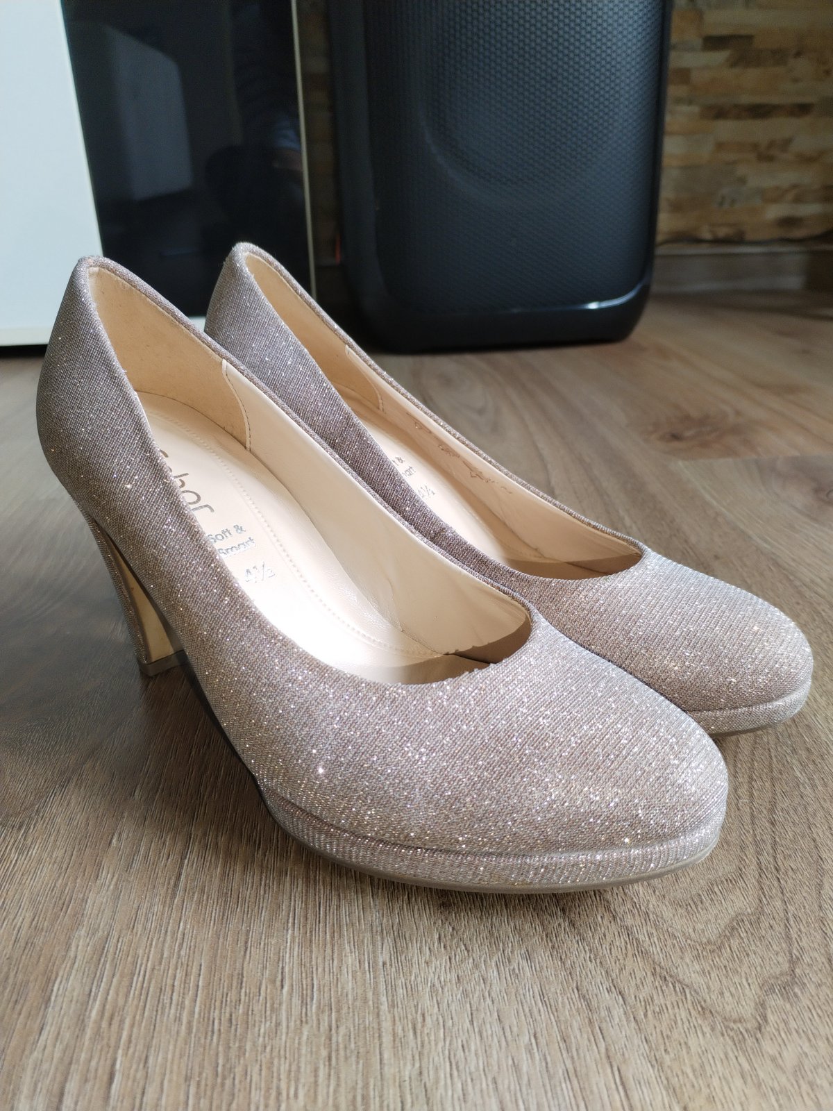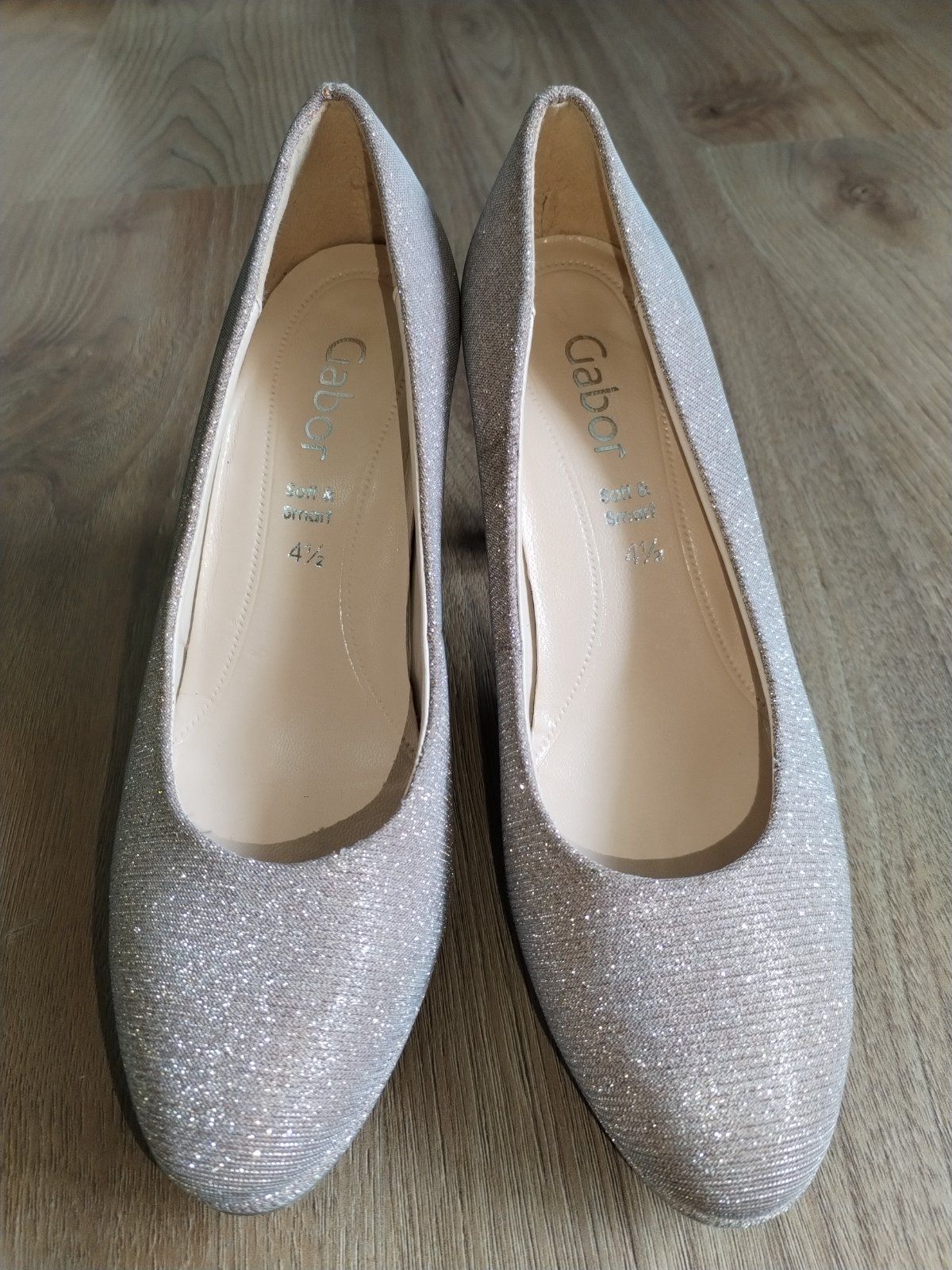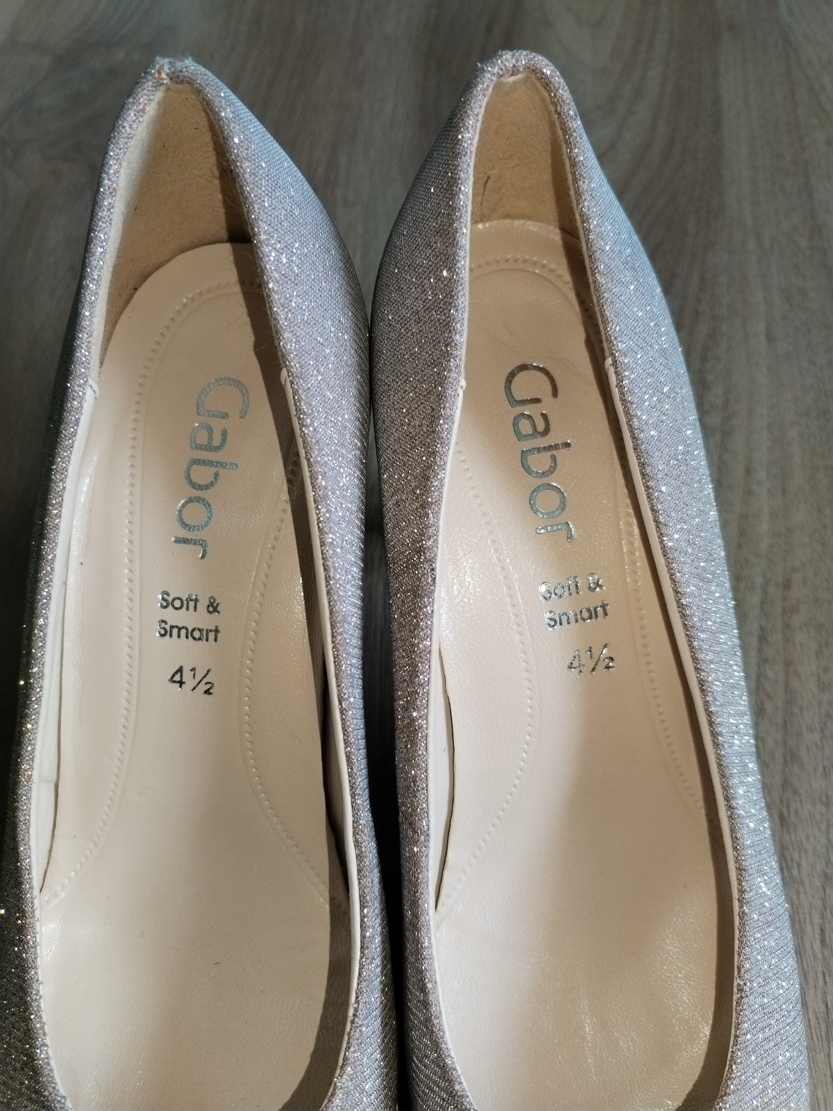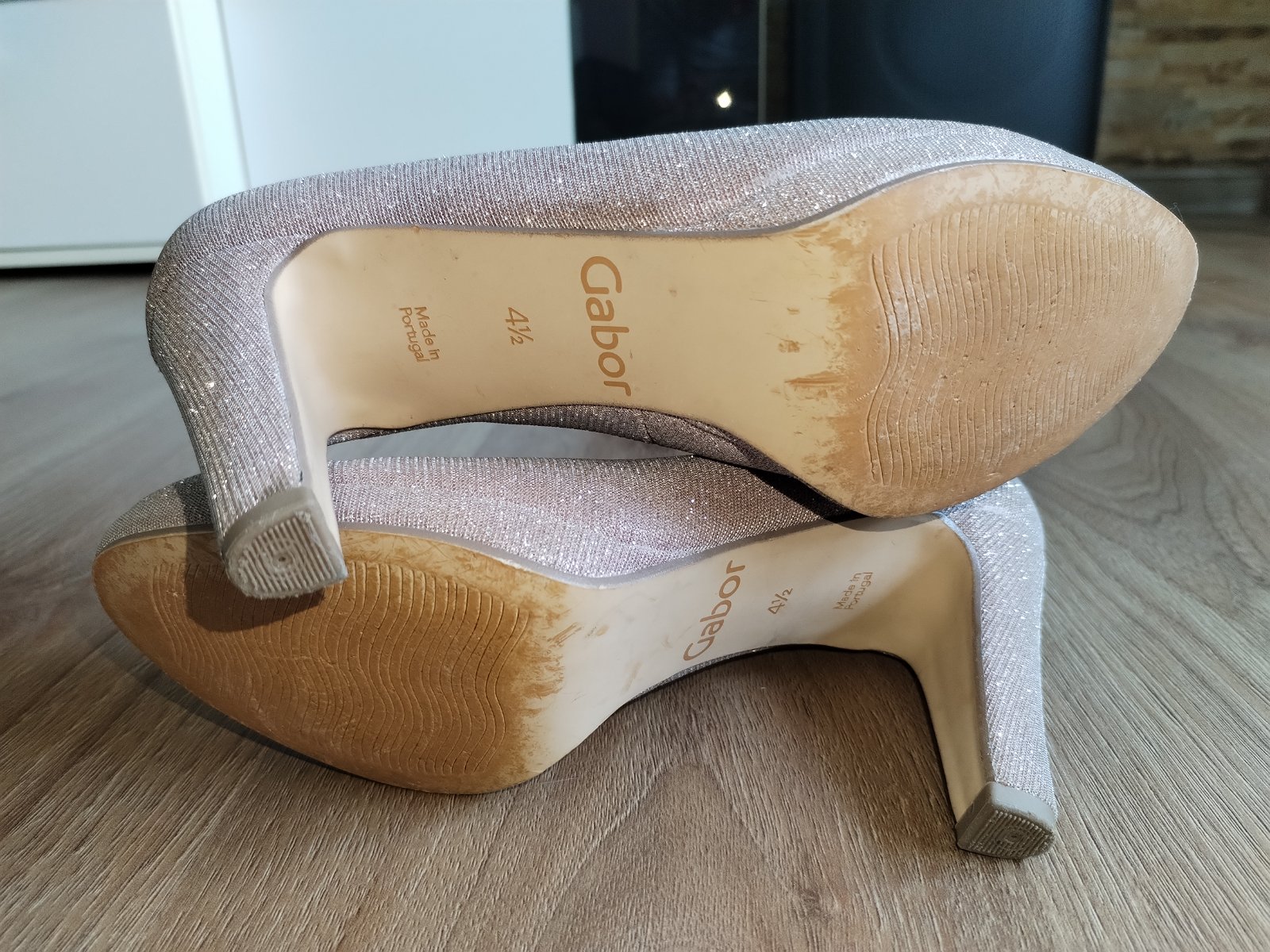 Krásné dámské kvalitní střevíčky – lodičky značky Gabor, ve velikosti 4 1/2 odpovídá velikosti 38, délka vnitřní stélky 23,5 cm, ve starorůžové barvě se stříbrným nitkováním – hází krásné odlesky, na podpatku 8,5 cm, soft and smart- velmi příjemná měkčená vložka, s uzavřenou pevnou špičkou, velmi slušivé a příjemné, na fotce tolik nevyzní, moc pěkné, klasické známky používání, neponičené, vyšší cena původní, nyní cena 350 Kč