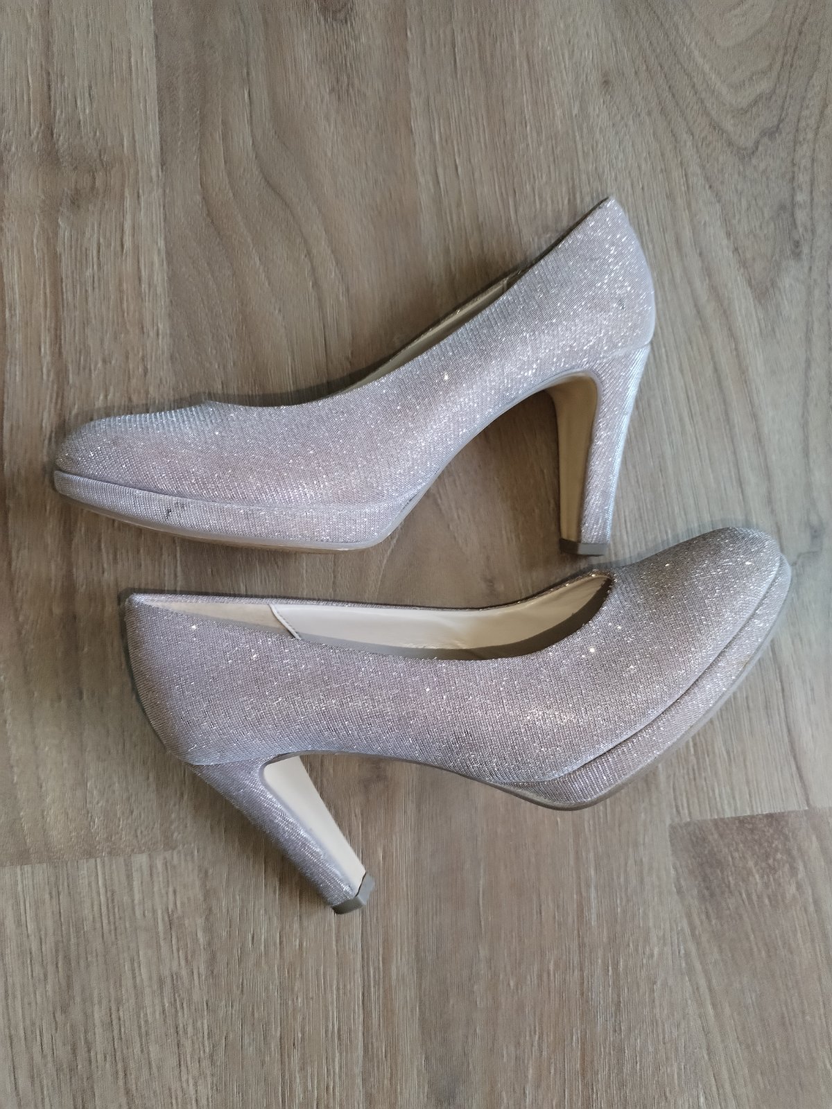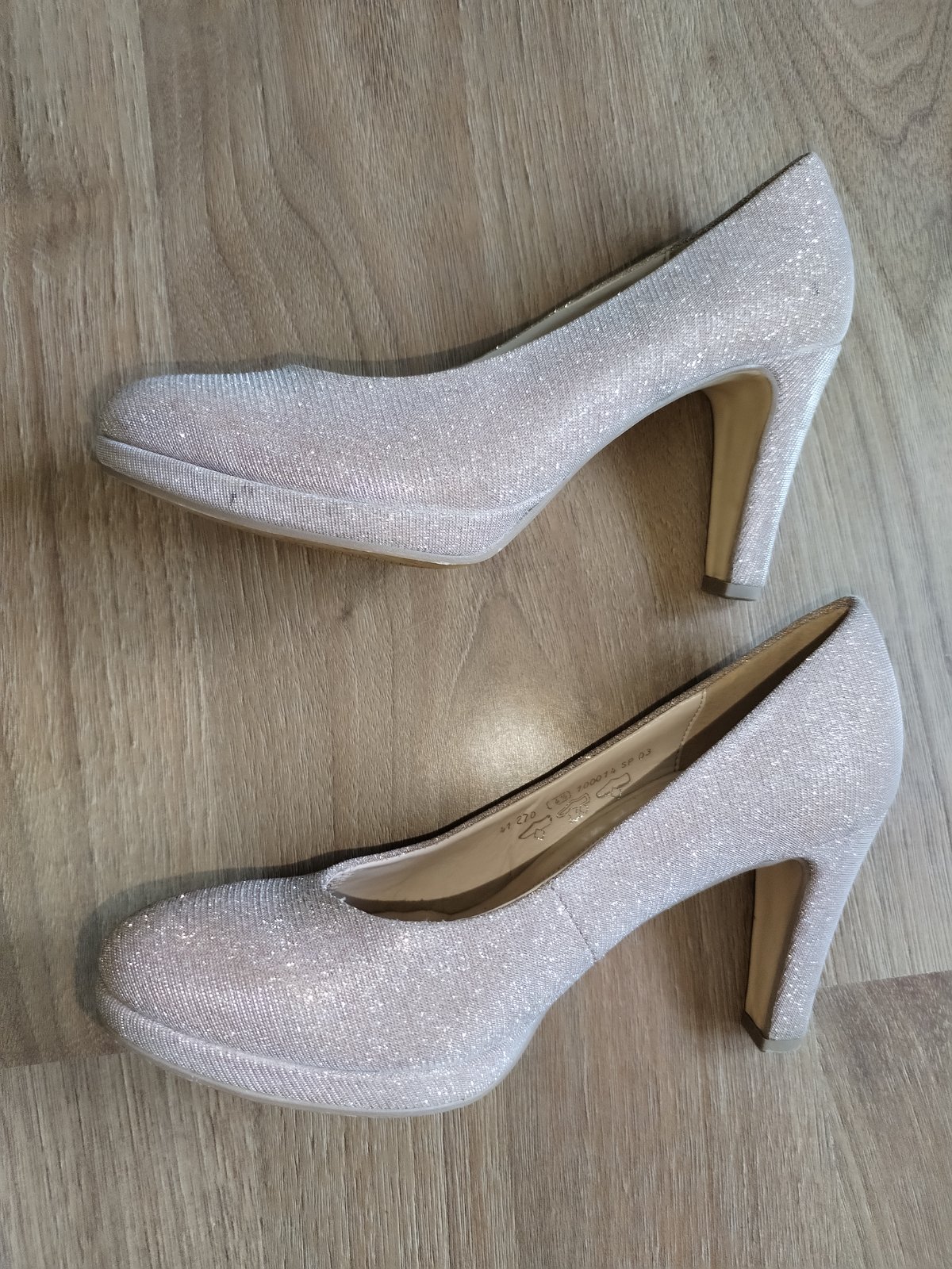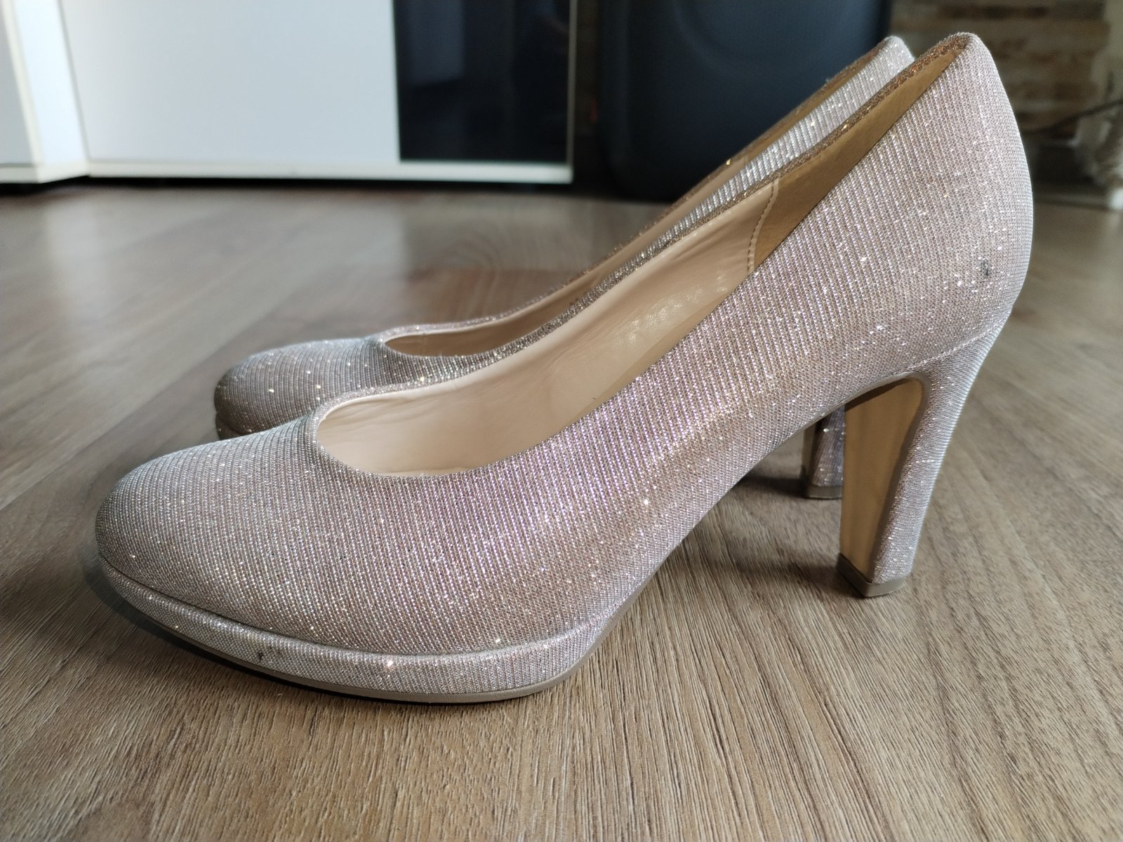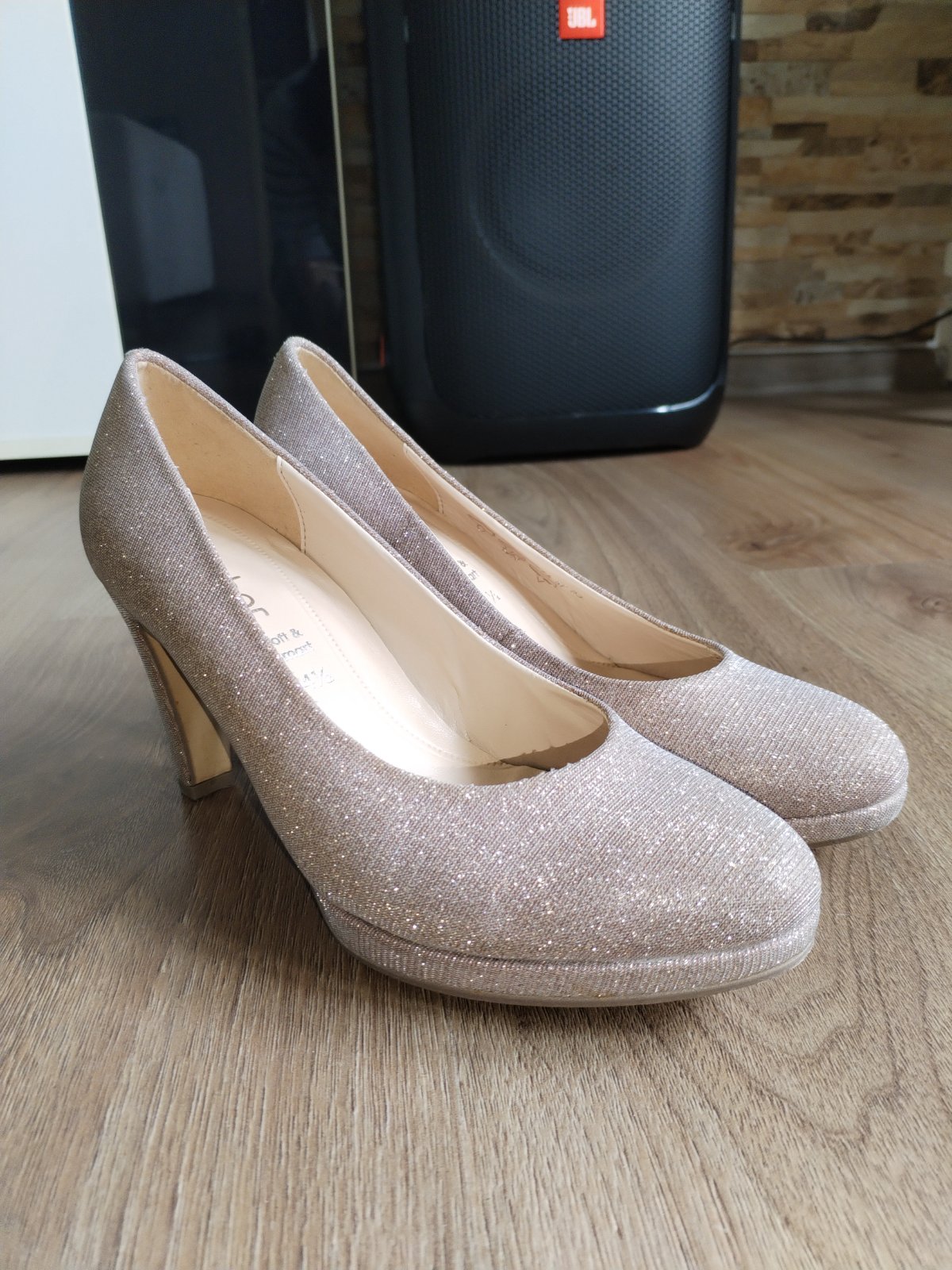 Krásné dámské kvalitní střevíčky – lodičky značky Gabor, ve velikosti 4 1/2 odpovídá velikosti 38, délka vnitřní stélky 23,5 cm, ve starorůžové barvě se stříbrným nitkováním – hází krásné odlesky, na podpatku 8,5 cm, soft and smart- velmi příjemná měkčená vložka, s uzavřenou pevnou špičkou, velmi slušivé a příjemné, na fotce tolik nevyzní, moc pěkné, klasické známky používání, neponičené, vyšší cena původní, nyní cena 350 Kč