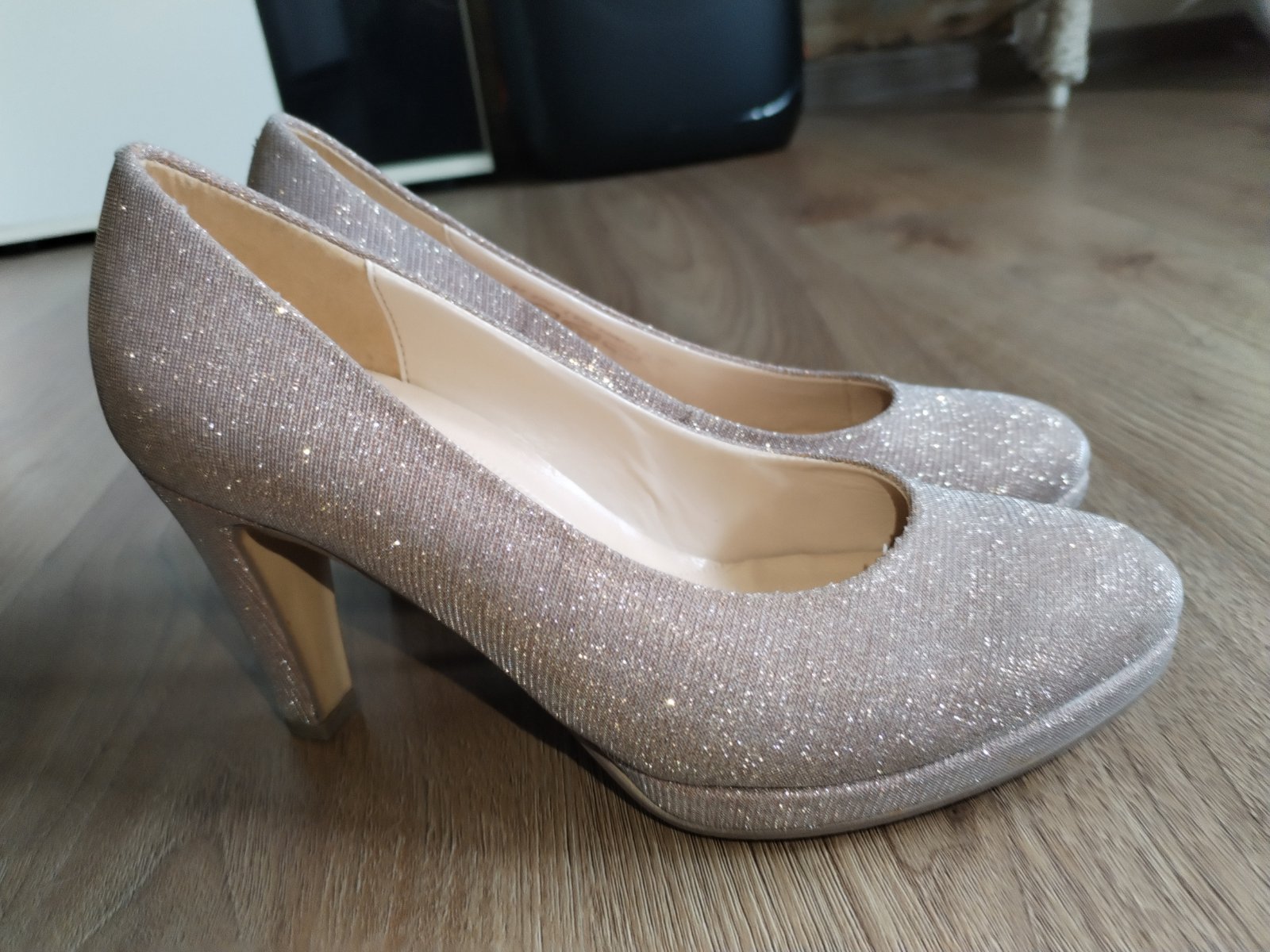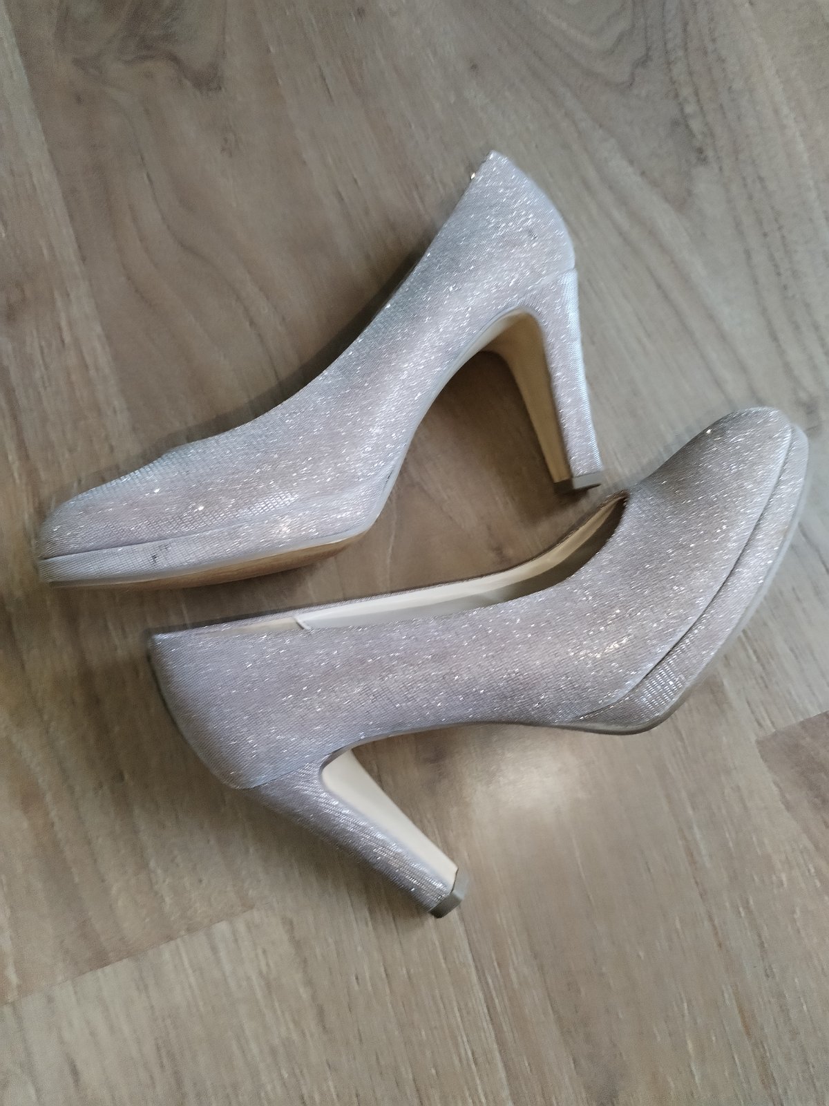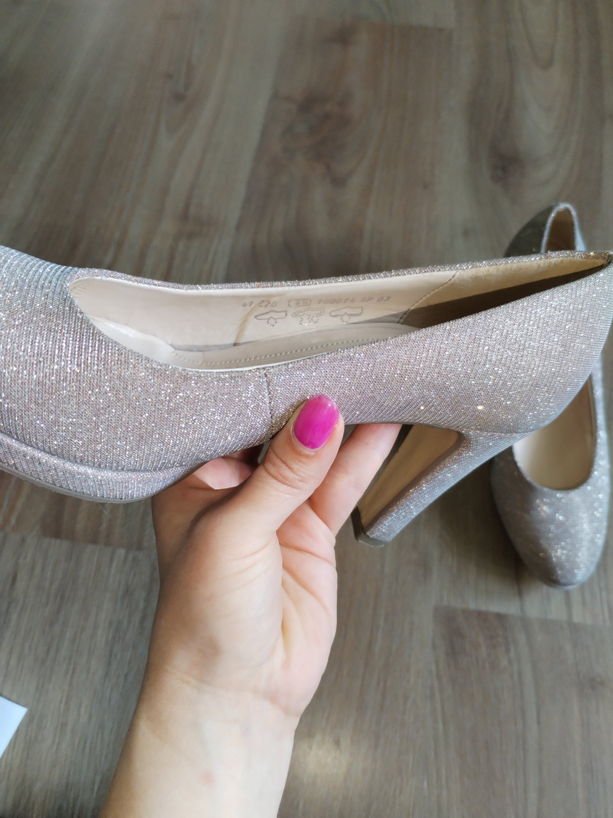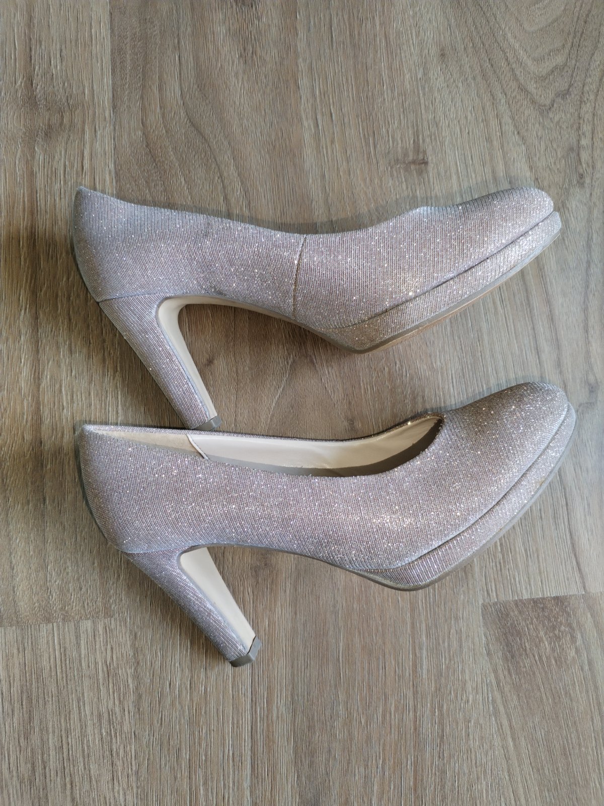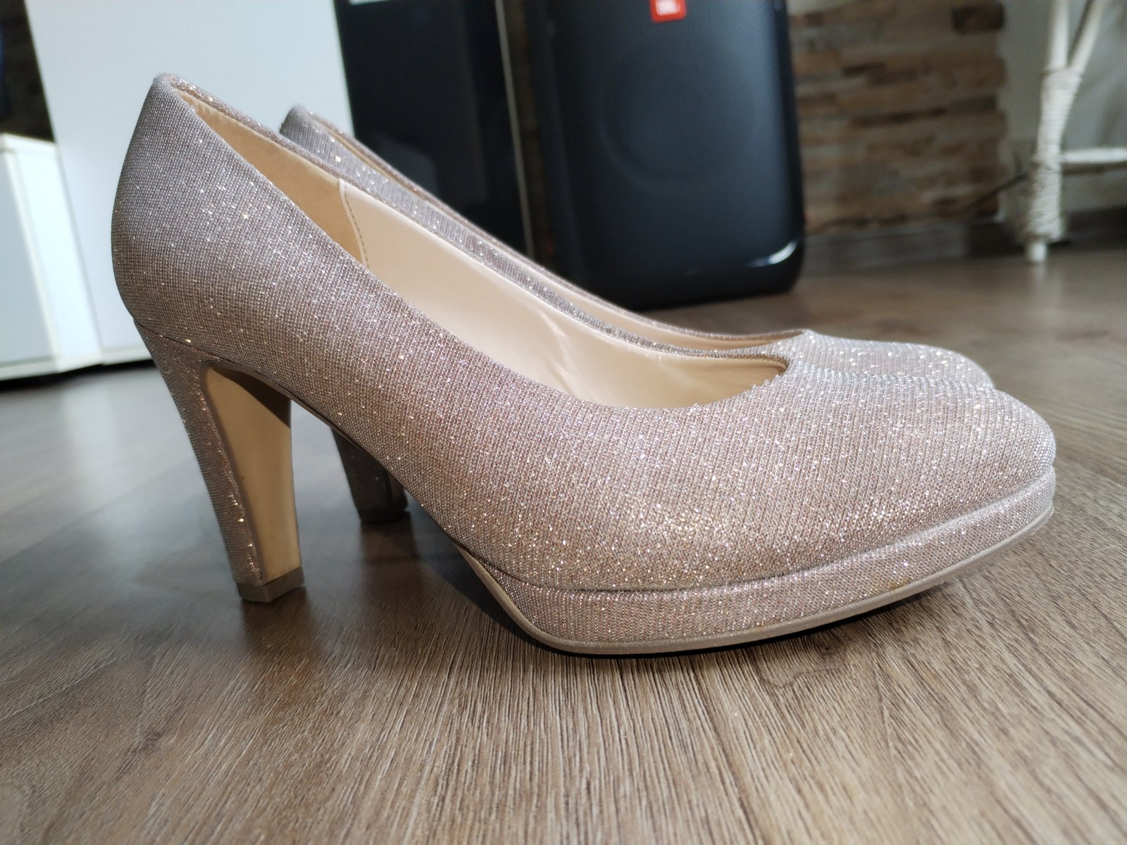 Krásné dámské kvalitní střevíčky – lodičky značky Gabor, ve velikosti 4 1/2 odpovídá velikosti 38, délka vnitřní stélky 23,5 cm, ve starorůžové barvě se stříbrným nitkováním – hází krásné odlesky, na podpatku 8,5 cm, soft and smart- velmi příjemná měkčená vložka, s uzavřenou pevnou špičkou, velmi slušivé a příjemné, na fotce tolik nevyzní, moc pěkné, klasické známky používání, neponičené, vyšší cena původní, nyní cena 350 Kč