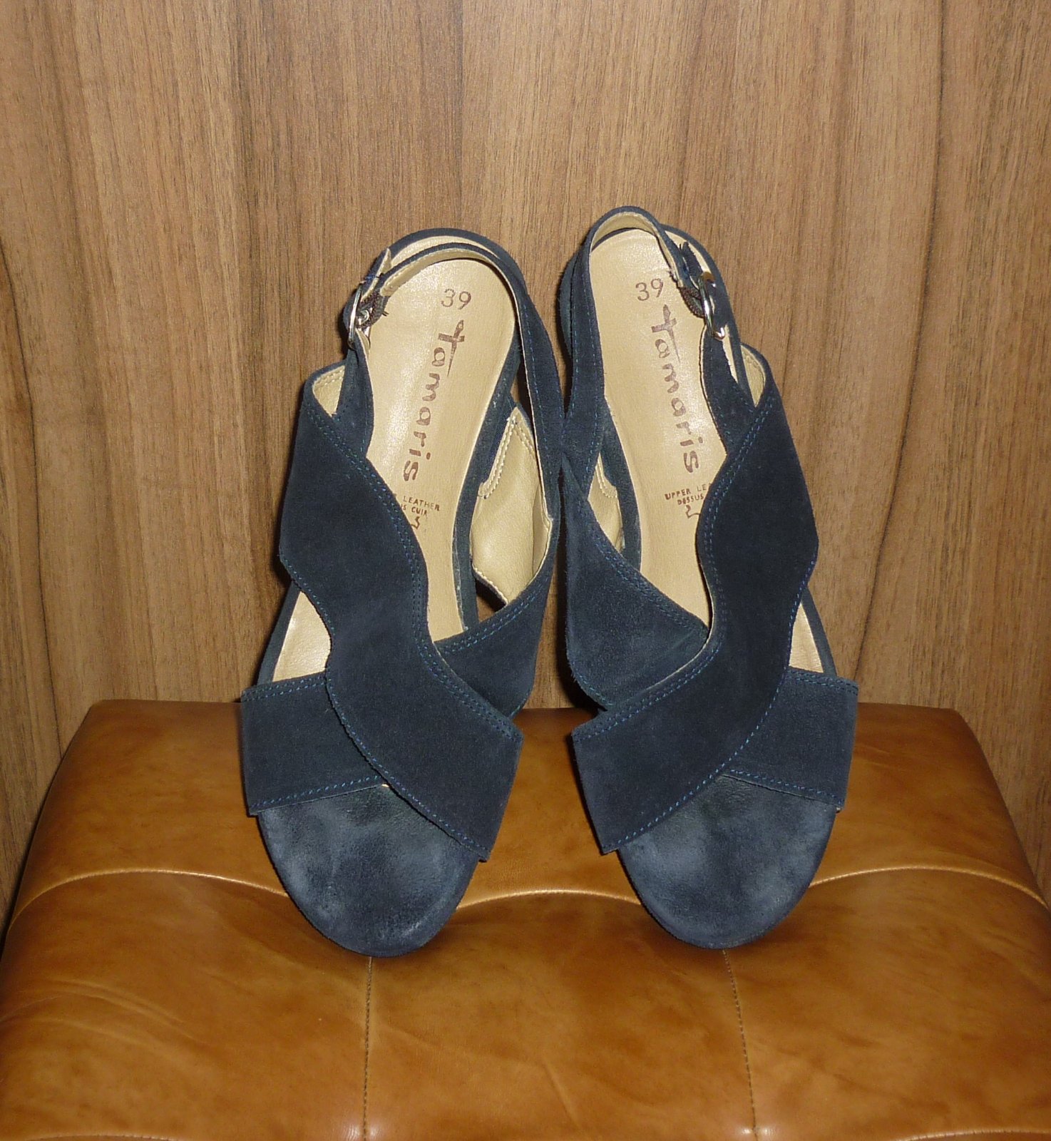 Prodám tmavě modré kožené sandály na klínku Tamaris, nošené, v dobrém stavu, běžné známky nošení. Velikost: 39, vnitřní stélka 25cm, výška podpatku vpředu 3,5cm, výška podpatku vzadu 8,5cm. Cena: 120,-Kč + poštovné. Koukněte na moje další inzeráty, třeba si něco vyberete a ušetříte na poštovném. Tel.: 728 455 567