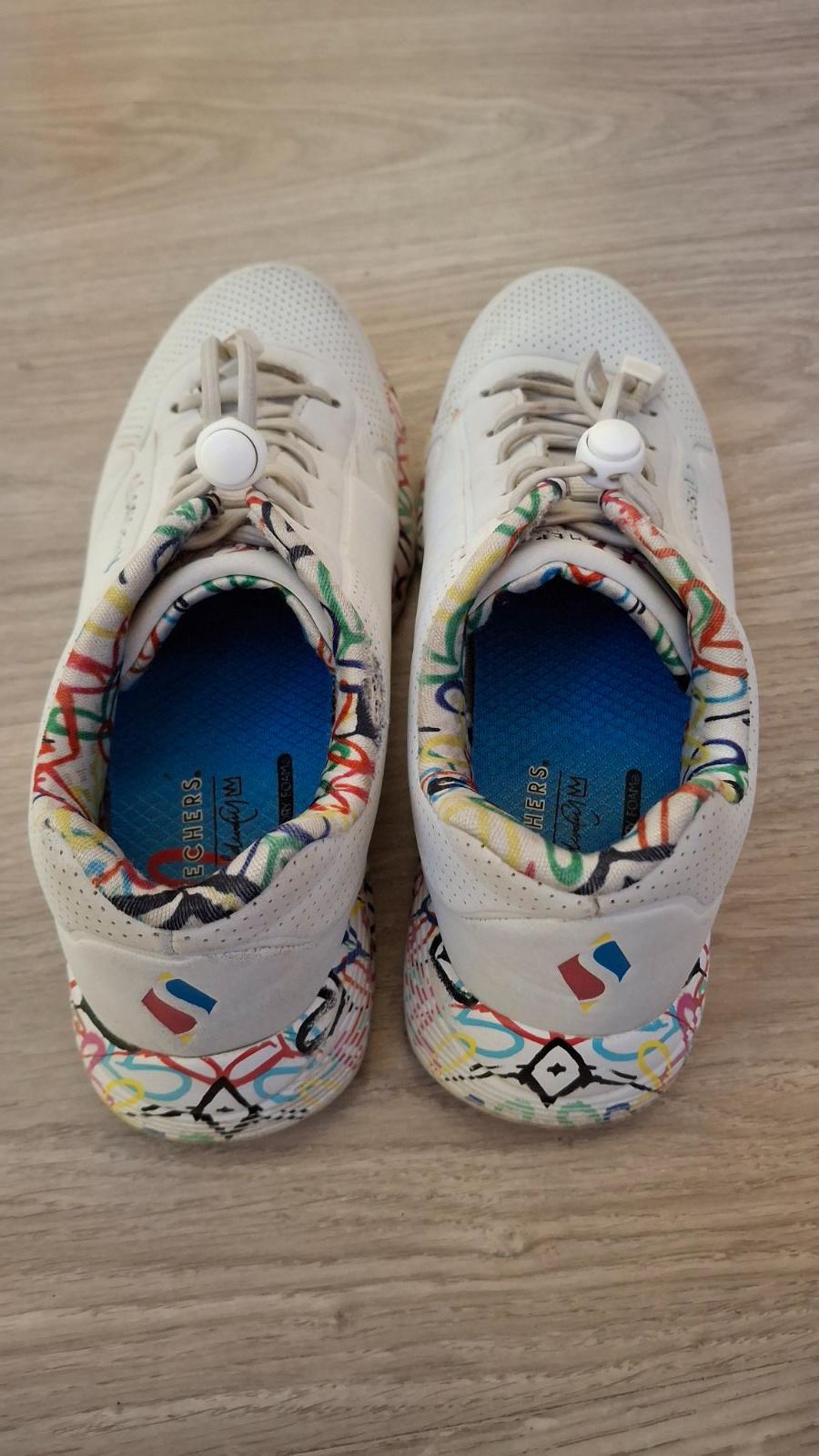 Tenisky Skechers vel36 ( stélka 23cm), navlečeny pro rychlejší obouvání rychlošňůrky, dcery nejoblíbenější boty- nošeny hodně- a je to na nich znát-viz foto, spíše na donošení