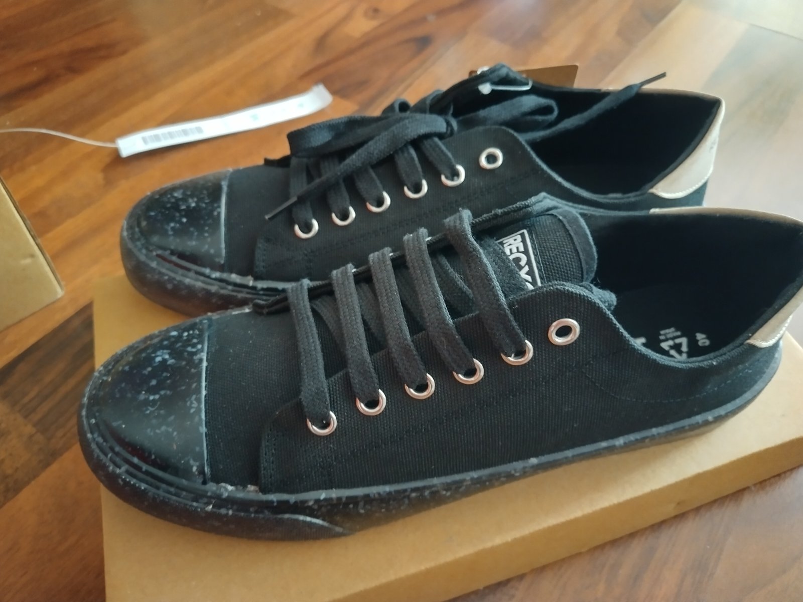 Plátěné tenisky na tkaničky. V pěkném stavu, jen na jedné straně šmlouha (viz. foto) - nezkoušela jsem čistit. Velikost 40 délka cca 25 cm