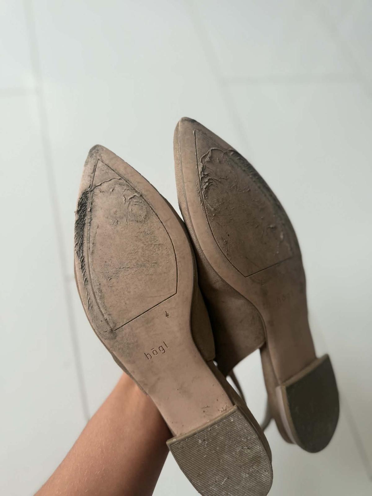 Pravá koža, nízka podrážka, ozdobný steh, zapínanie remienkom na suchý zips. Pravá špička má materiál jemne oškretý, inak sú vo veľmi dobrom stave, veľmi málo nosené. (neboli čistené pred fotením) ...