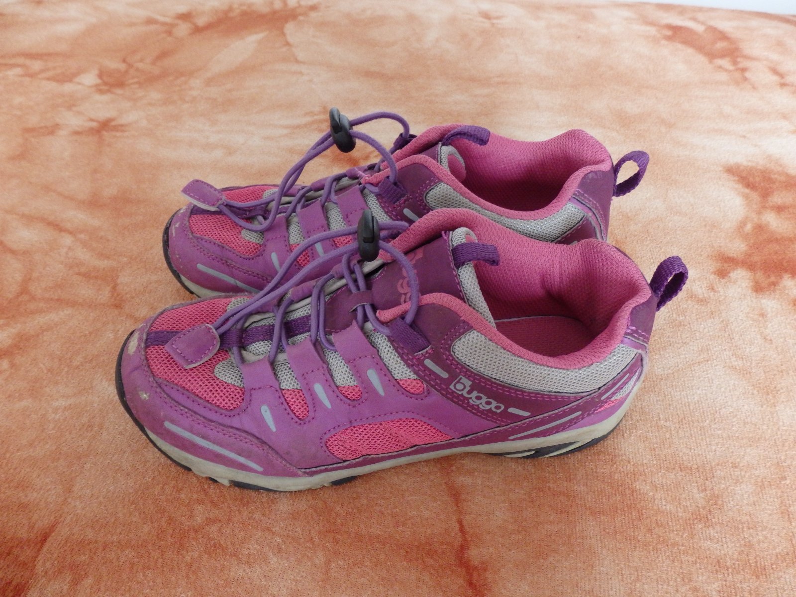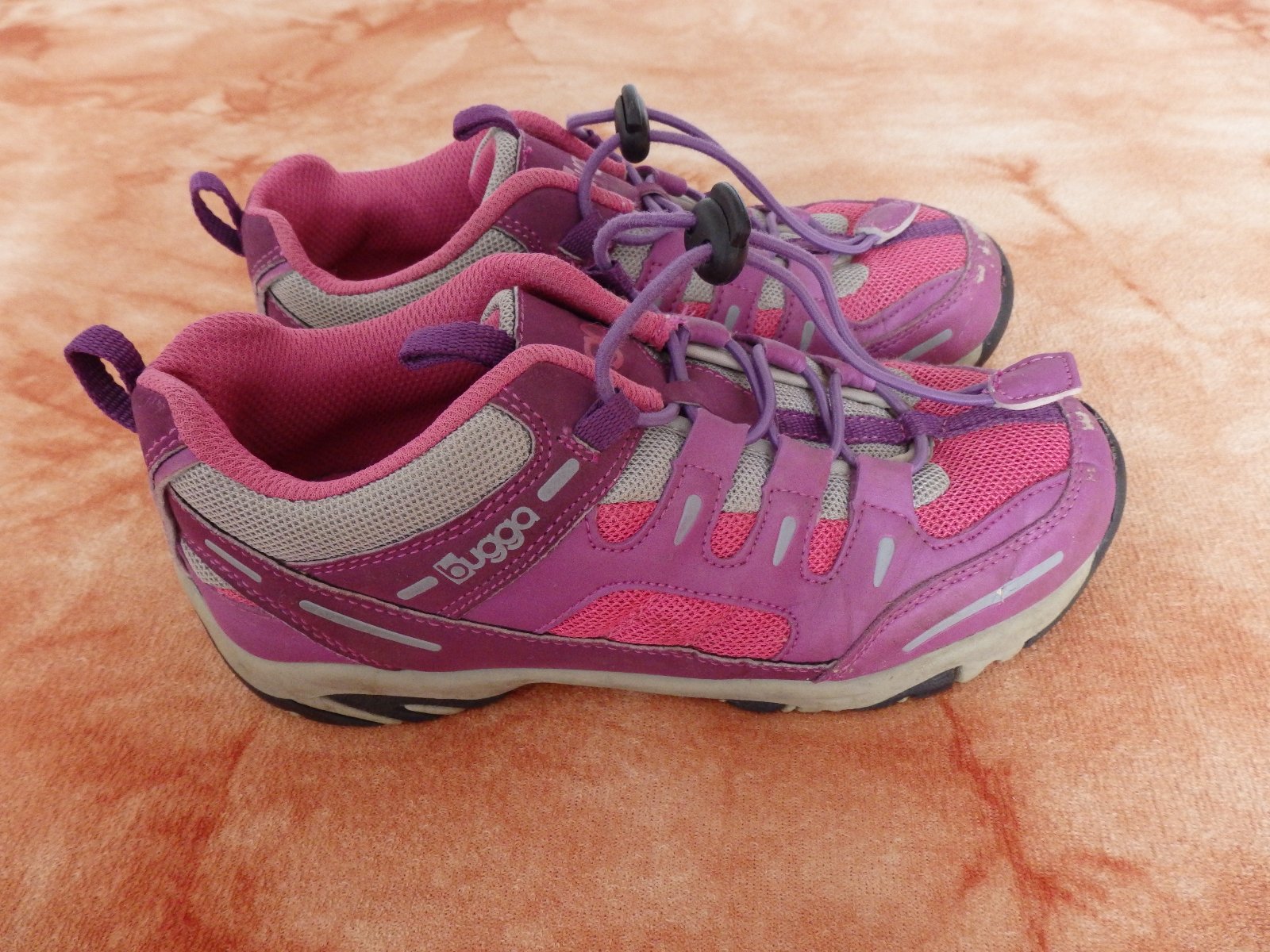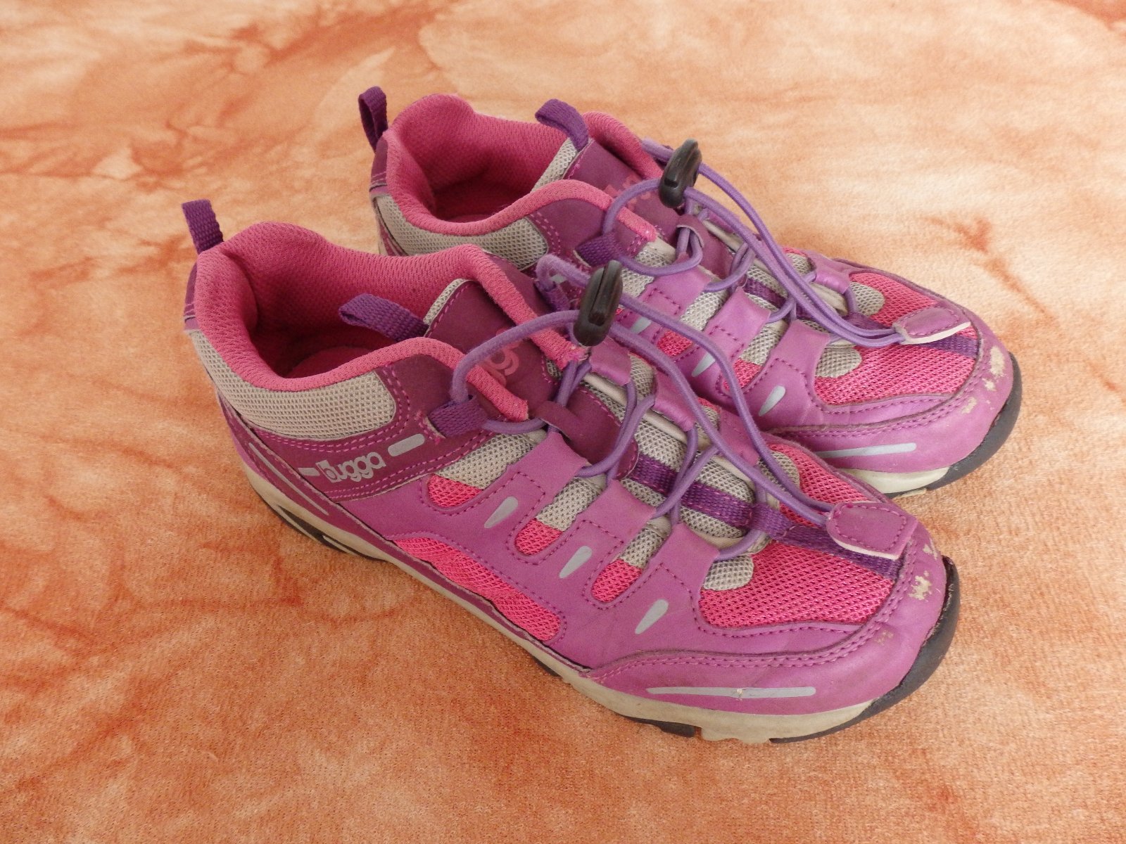 Sportovně vycházkové botičky Bugga, B035, kombinace růžové a fialové. Mají okopané špičky, ale ještě poslouží. Stélka nejde vyndat, ale dle výrobce je její délka 23,5 cm.