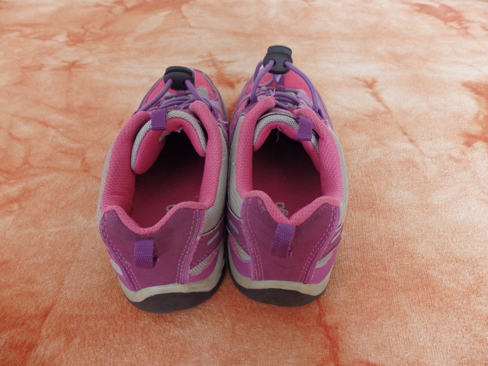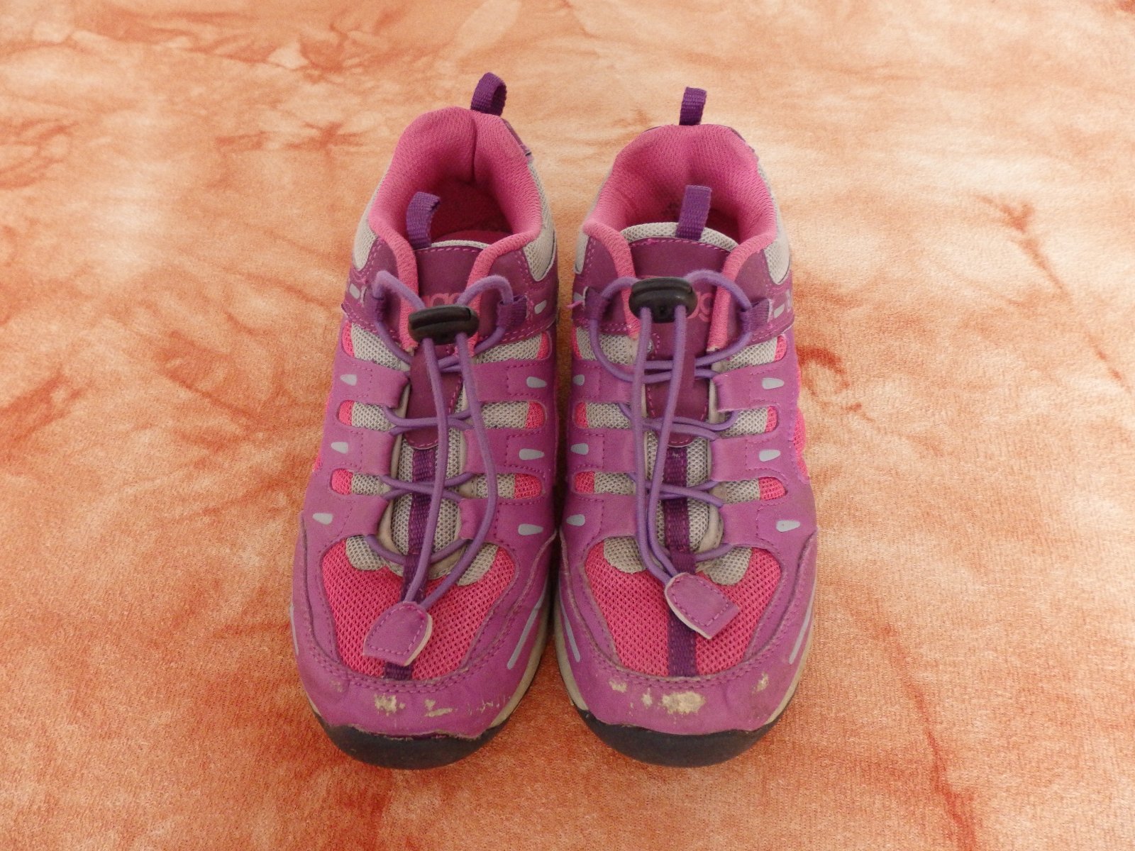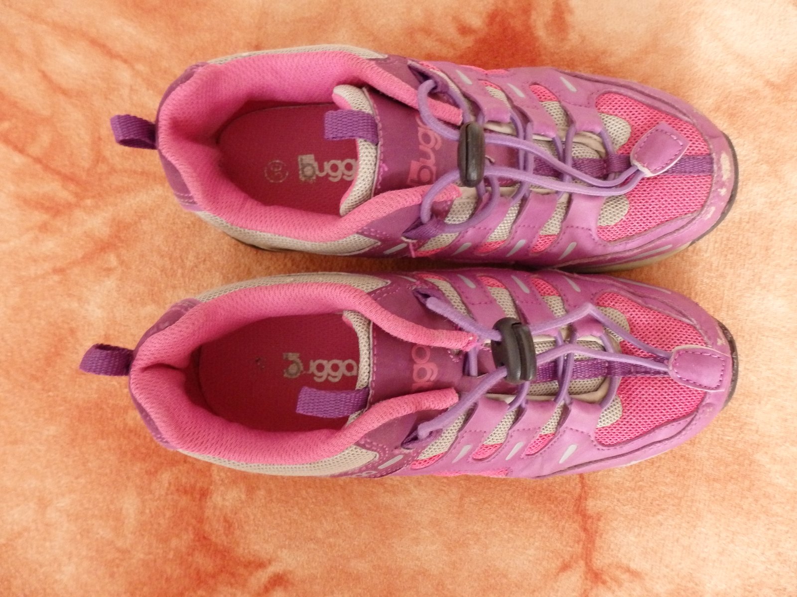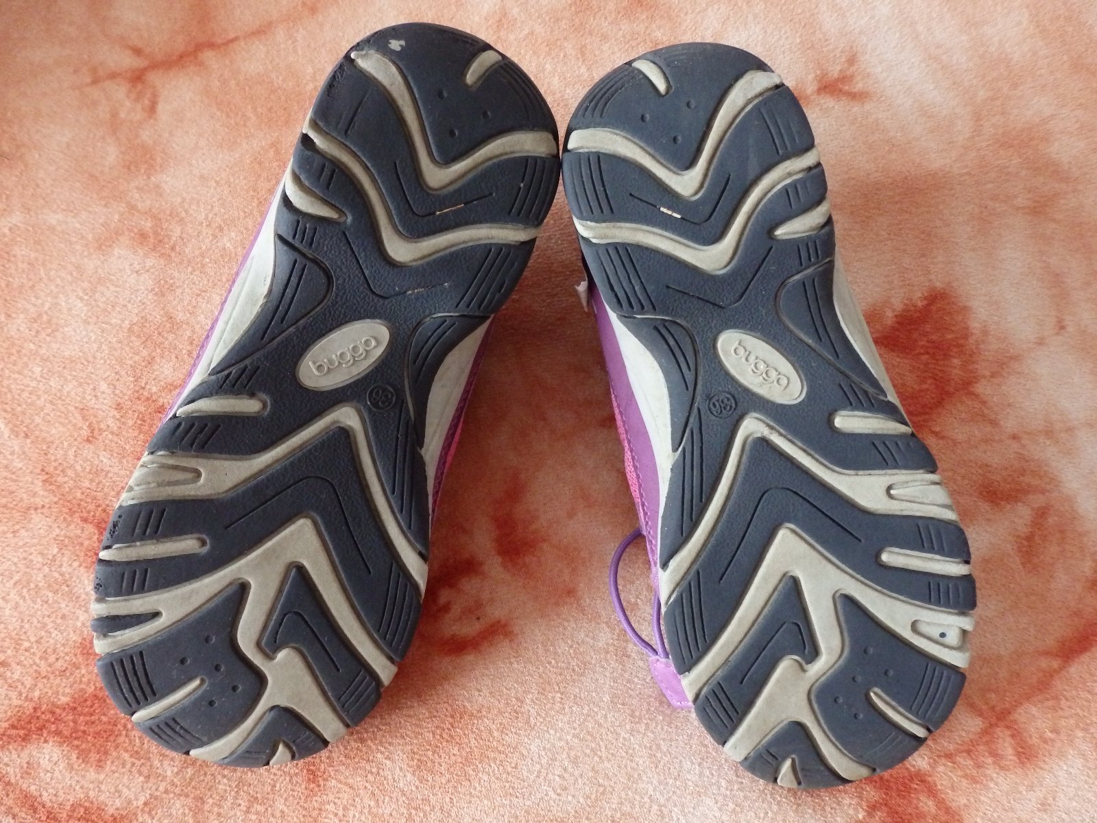 Sportovně vycházkové botičky Bugga, B035, kombinace růžové a fialové. Mají okopané špičky, ale ještě poslouží. Stélka nejde vyndat, ale dle výrobce je její délka 23,5 cm.