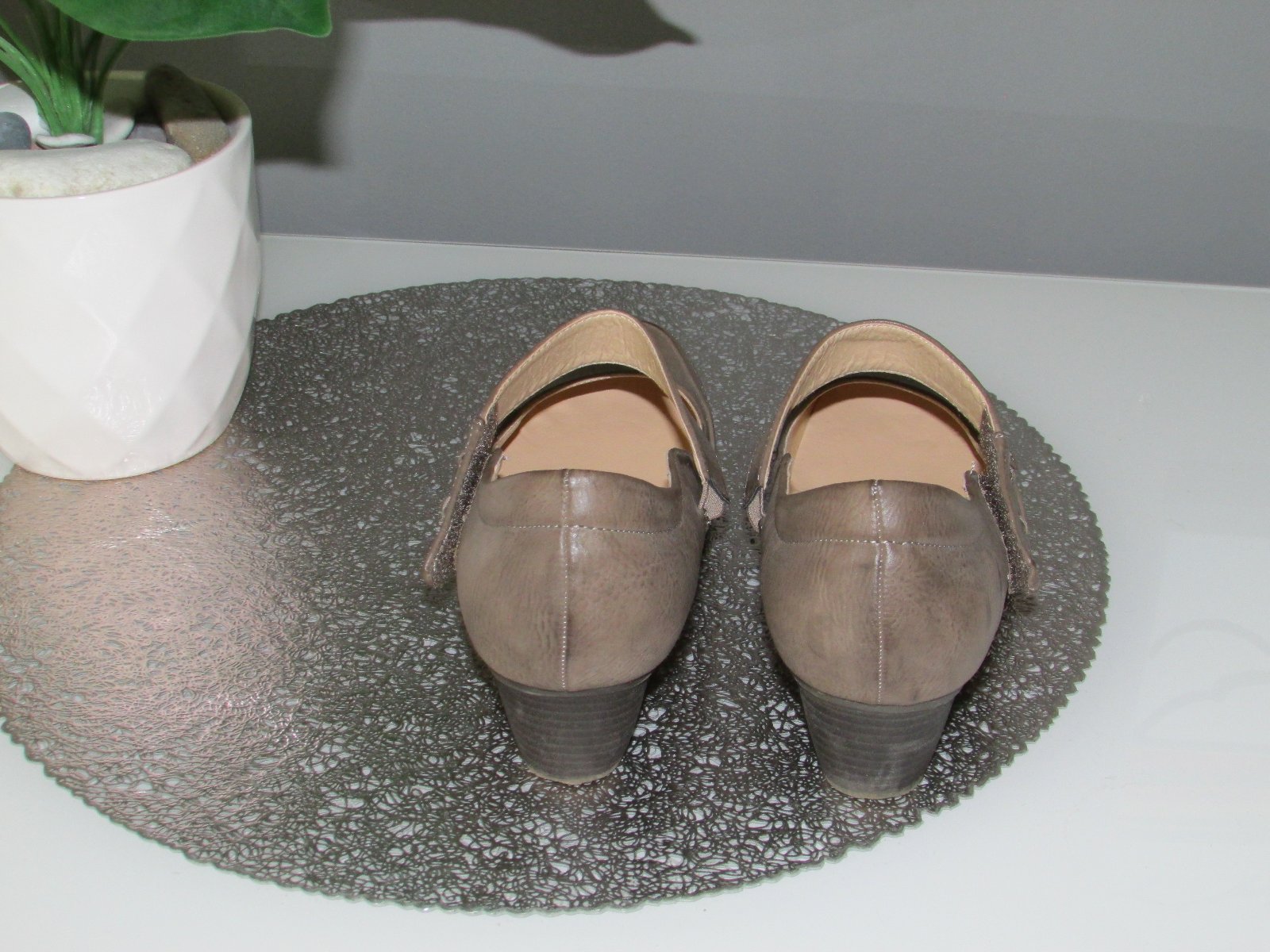 Boty na podpatku, zapínání na suchý zip. Párkrát obuté. Barva hnědo-šedá.