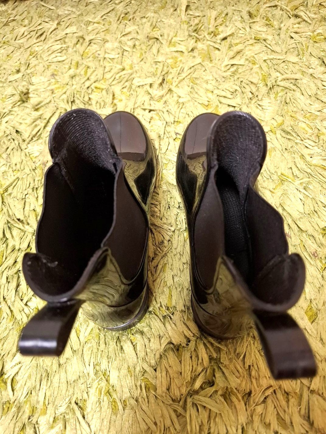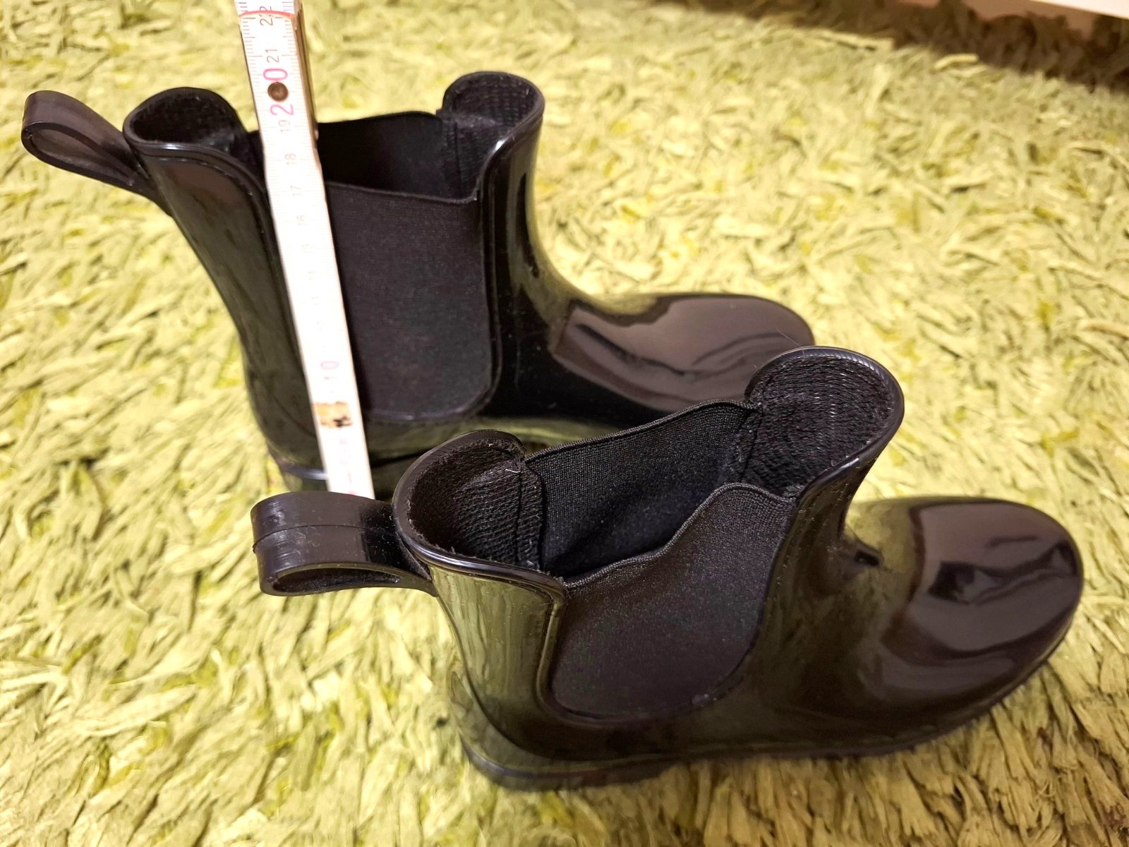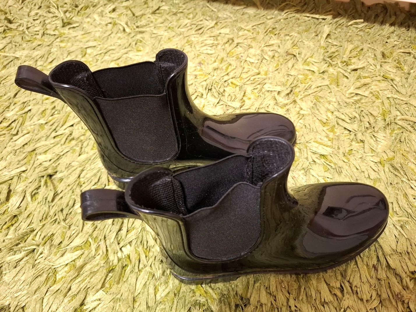 Prodám lesklé, černé holínky nad kotníky, značky Esmara, koupené v Lidlu, vyrobeno v Itálii. Velikost odpovídá č.39. Snadné obouvání díky postranní gumě a poutku vzadu. Vhodné na užší nohu. Použití jak do deště ven, tak i k elegantnímu oblečení do kanceláře za mokrého počasí. Jen párkrát nošené, ve velmi dobrém stavu. Cena: 250,- Kč. Předání osobně v Praze, platba v hotovosti.