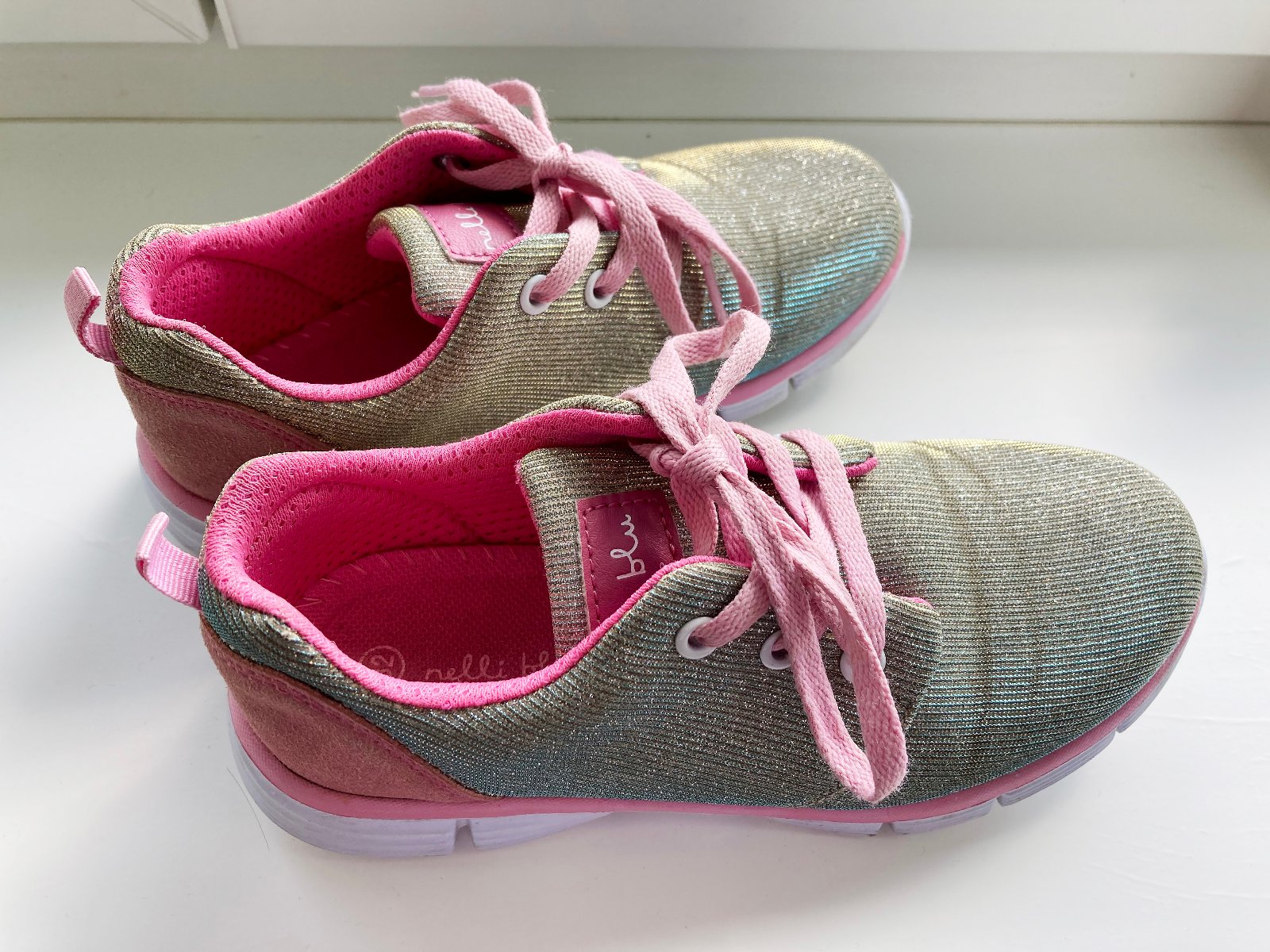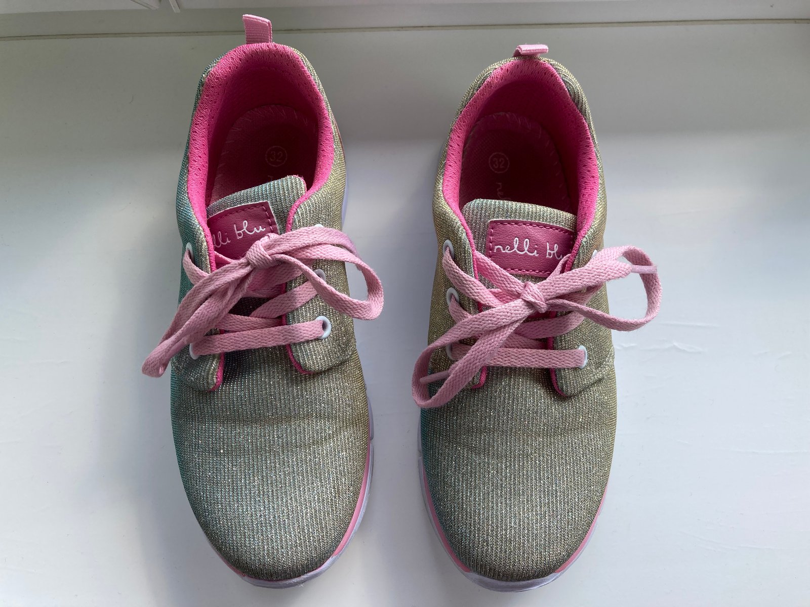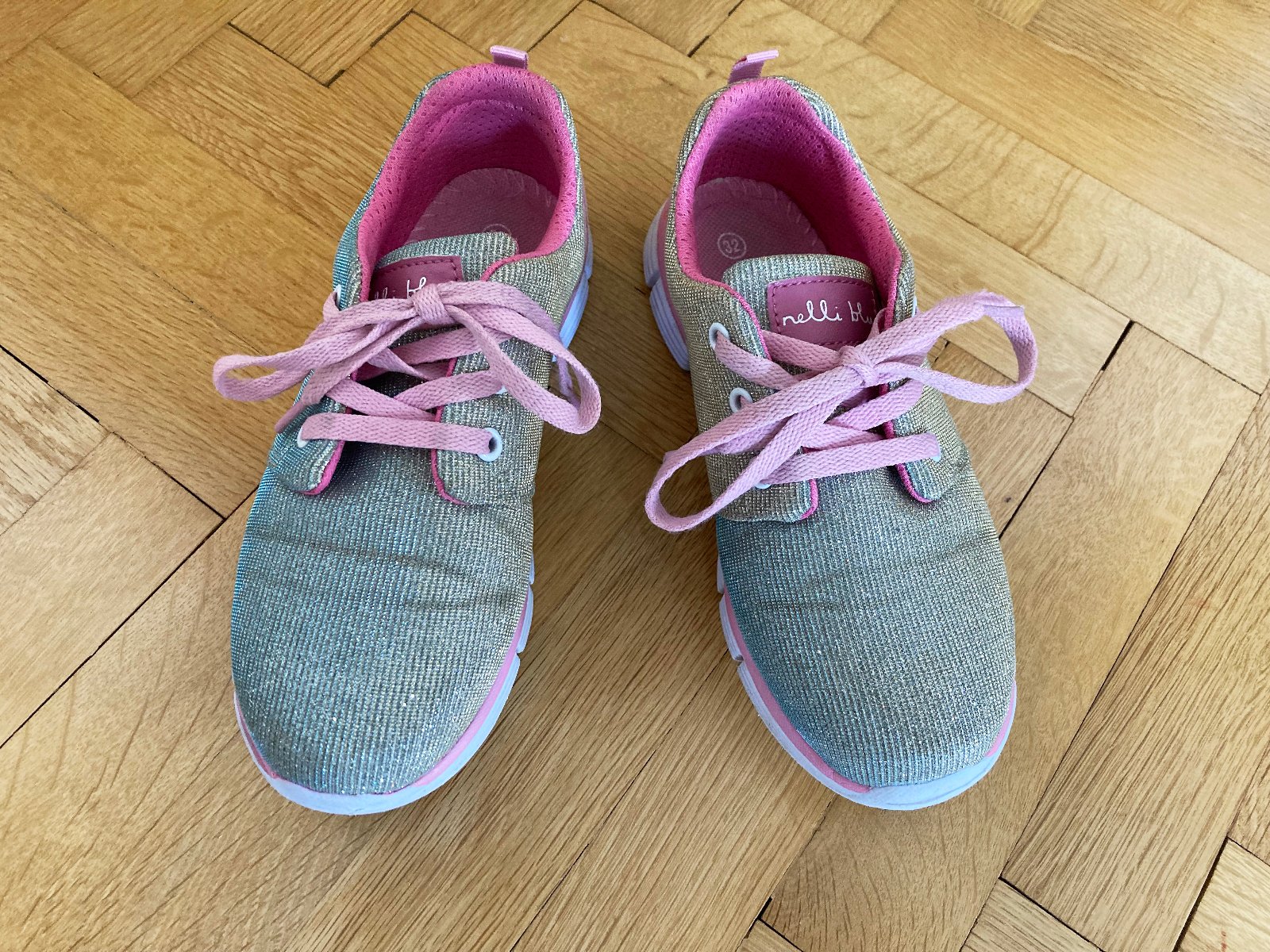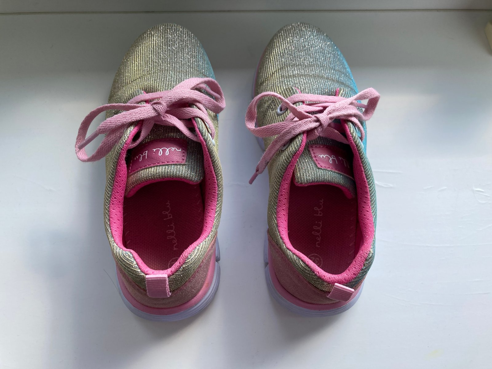 Třpytivé tenisky ve velmi pěkném stavu, stříbrné měňavé podle světla, s růžovými tkaničkami a vnitřkem, velikost 32, zn. Nelli Blue. Nošené málo, bez větších vad, bílé podrážky jsou už trošku zašlé, na vnitřním jazyku je zaškrtané podepsané jméno, tmavá skvrnka na tkaničce (asi od fixy nejde vyčistit), jinak ještě pěkné a udělají parádu, krásně se blyští na sluníčku. Pořizovací cena 599Kč, nová cena 250Kč. Lze zaslat poštou / balíkovnou / zásilkovnou (poštovné dle tarifů), nebo osobní předání Praha 6 - Hanspaulka nebo metro A Bořislavka (při osobním předání lze vyzkoušet).