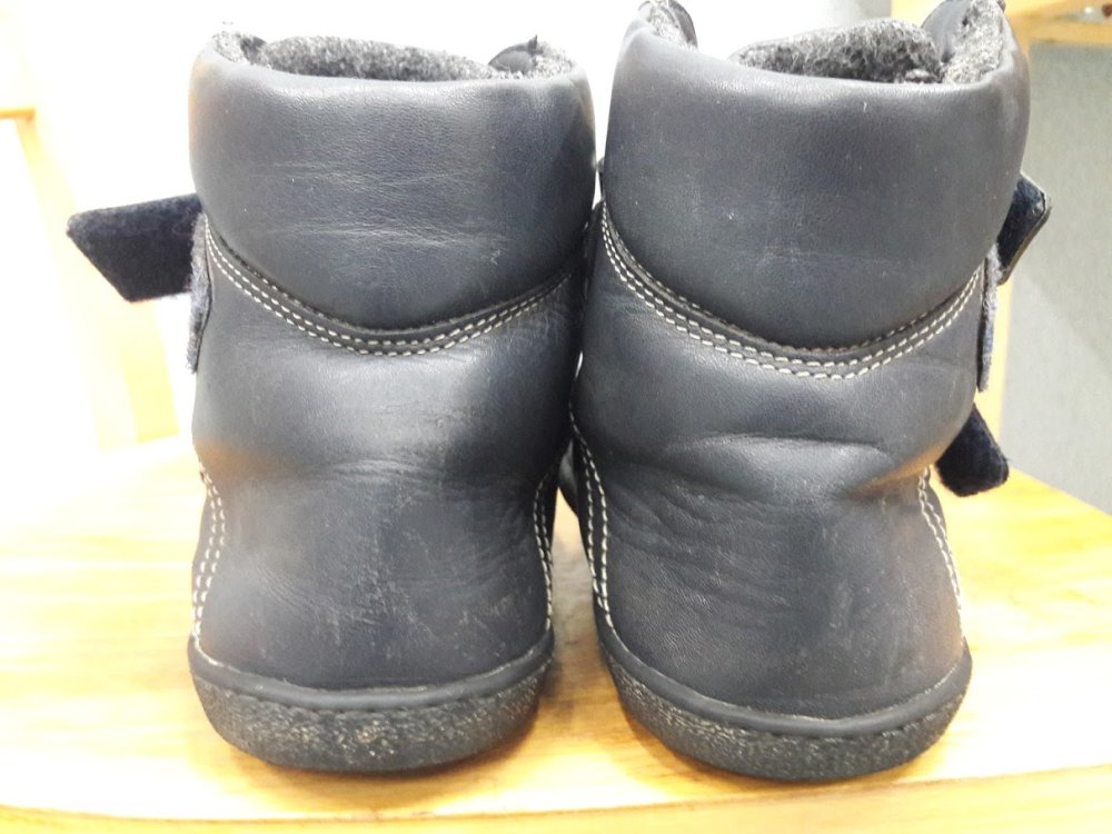Lehoučké kožené zimní botky zateplené flísem. Nošené jednu sezonu na střídačku s druhými. Podrážka téměř neochozená, naimpregnované. Uvnitř vyndavací vlněná stélka. Vhodné na ploutvičky, krásně se dají stáhnout na nízká nárt a úzkou patu.