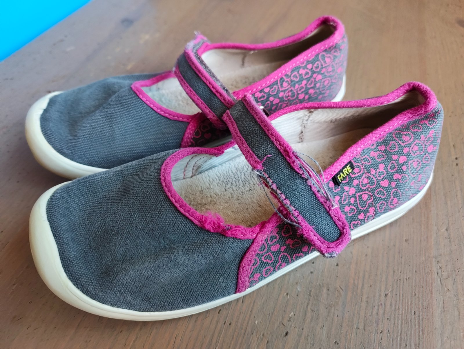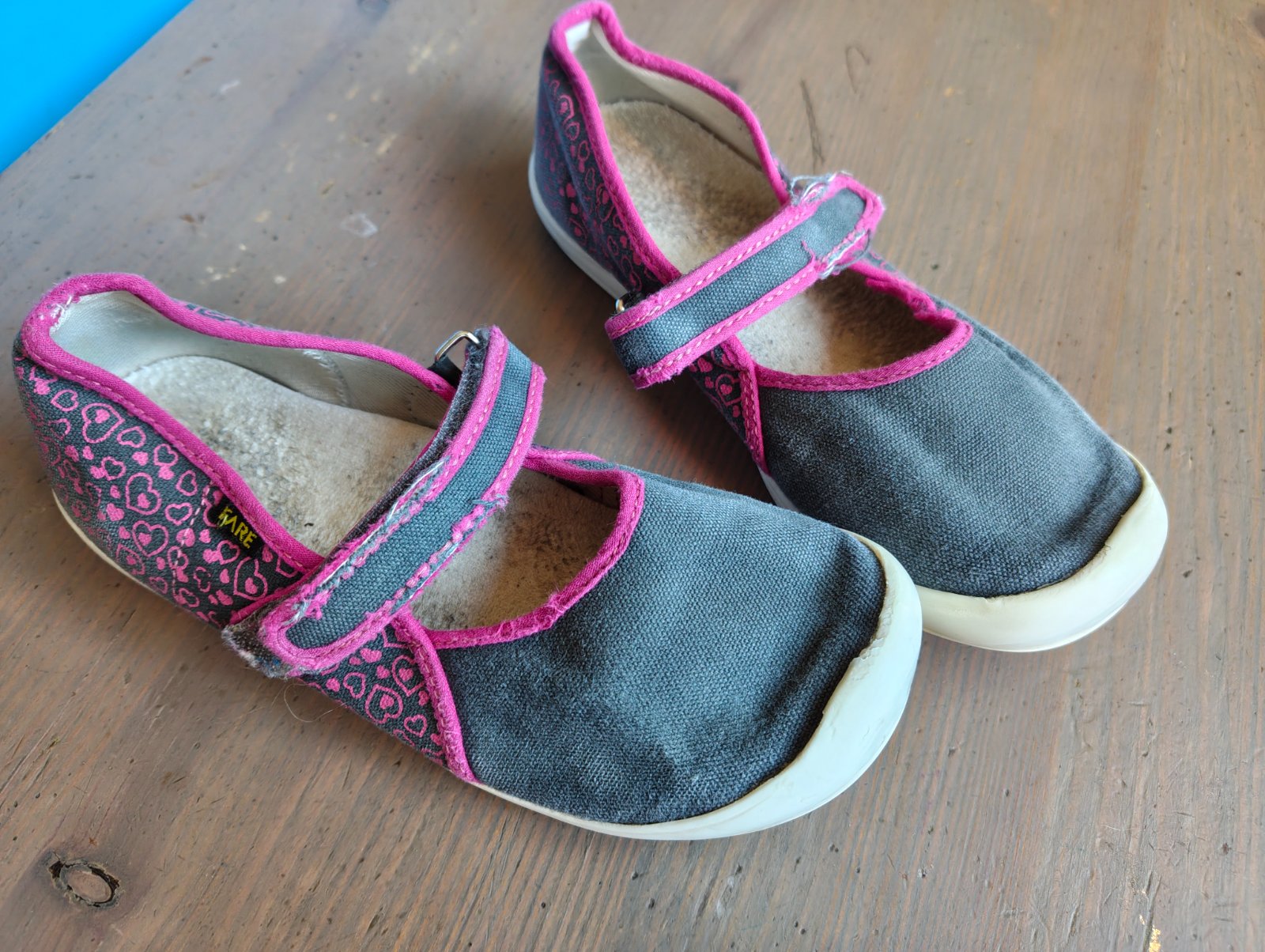 Nošené půl roku ve škole. Bez vad, jen trochu odřená barva a odlepuje se guma po stranách, podrážka v pořádku. Jsou vyprané. Cena 79Kč.