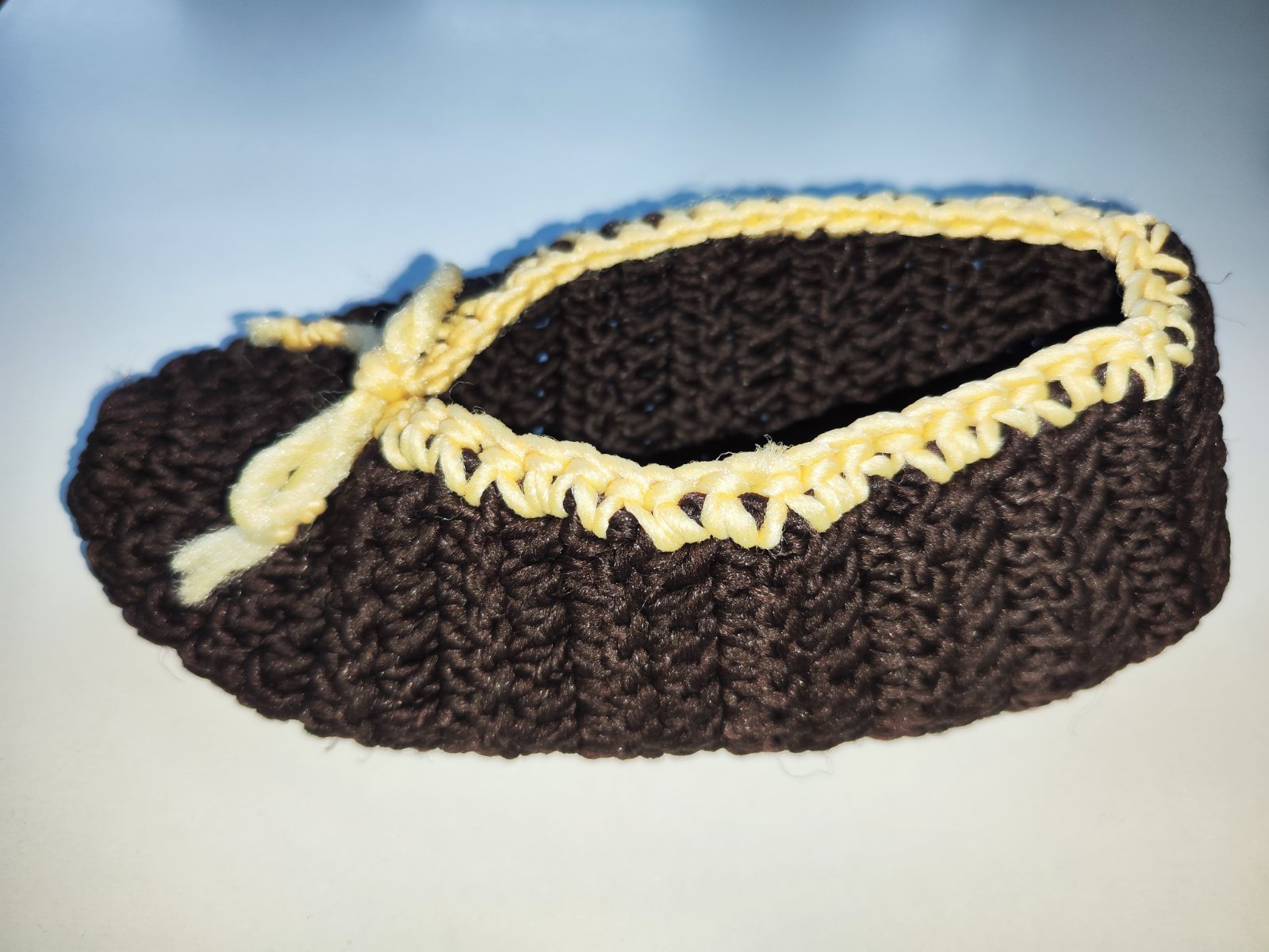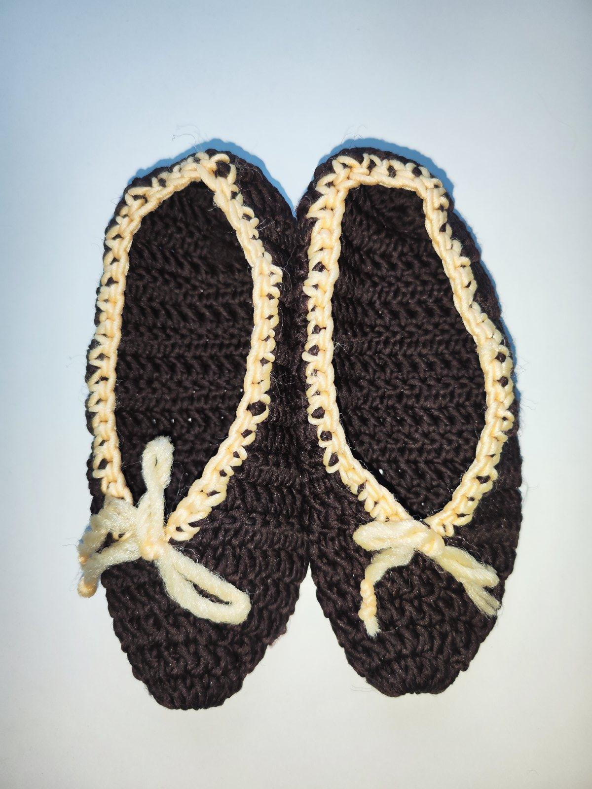 Prodám ručně háčkované papuče. Tmavě hnědé s kontrastní světlou lemovkou a dekorativní mašličkou. Bezva stav. Velikost cca 38-39 (délka podrážky je 25 cm). Cena 90 Kč, v Brně možné osobní předání.