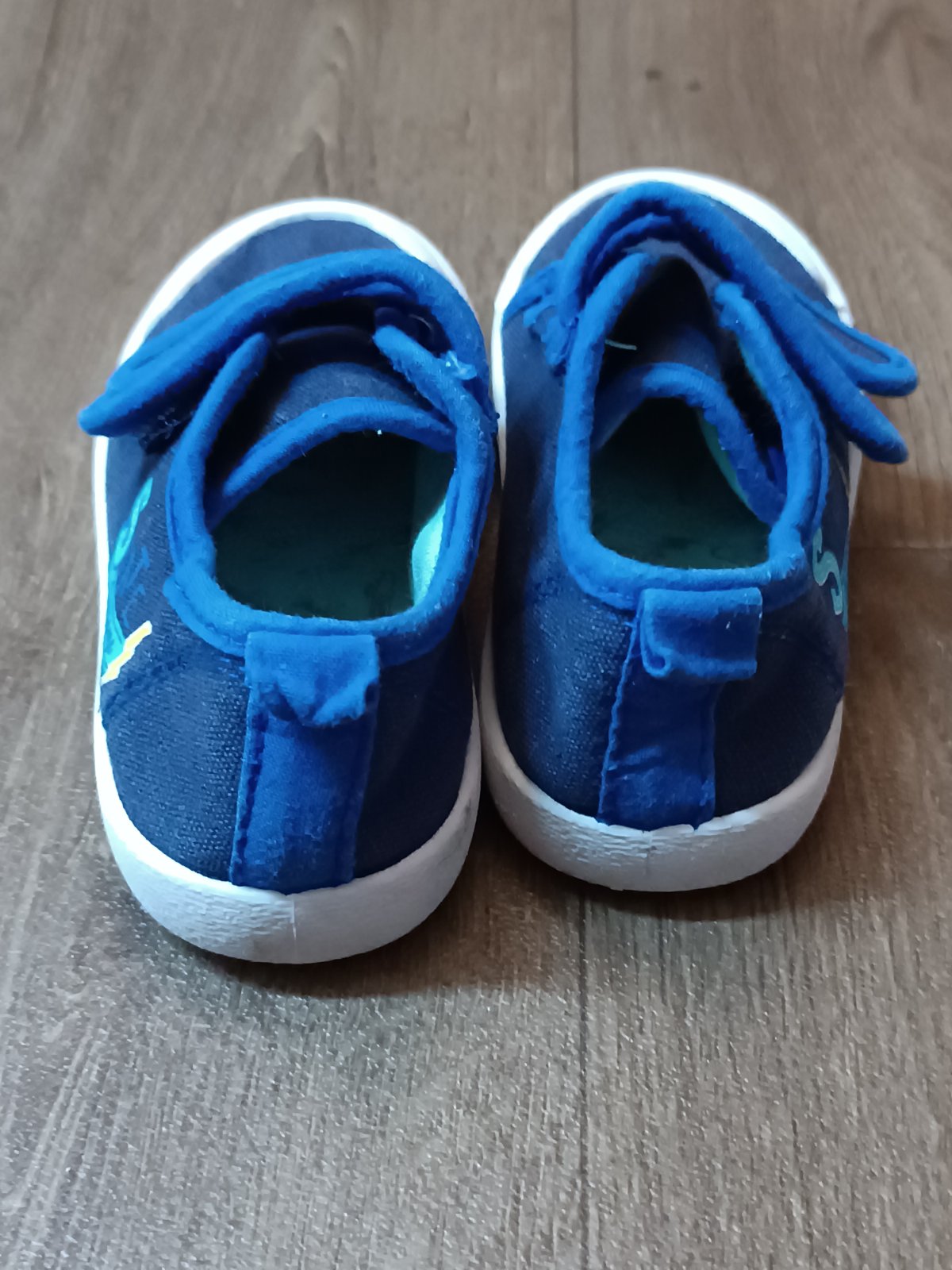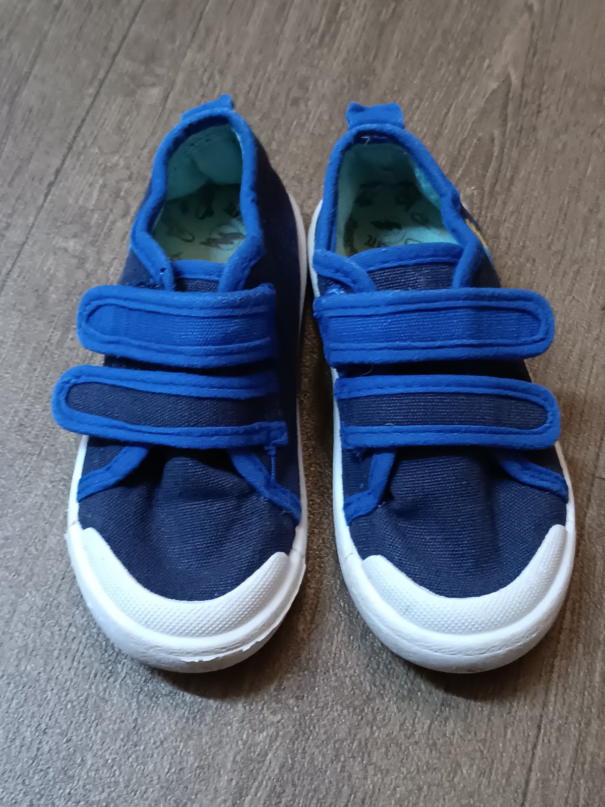 Prodám tmavě modré chlapecké plátěné tenisky, vel. 25, s bílou podrážkou a zapínání na suchý zip (Drží pevně), s nápisem "Skate awesome" a motivem blesku na boku.