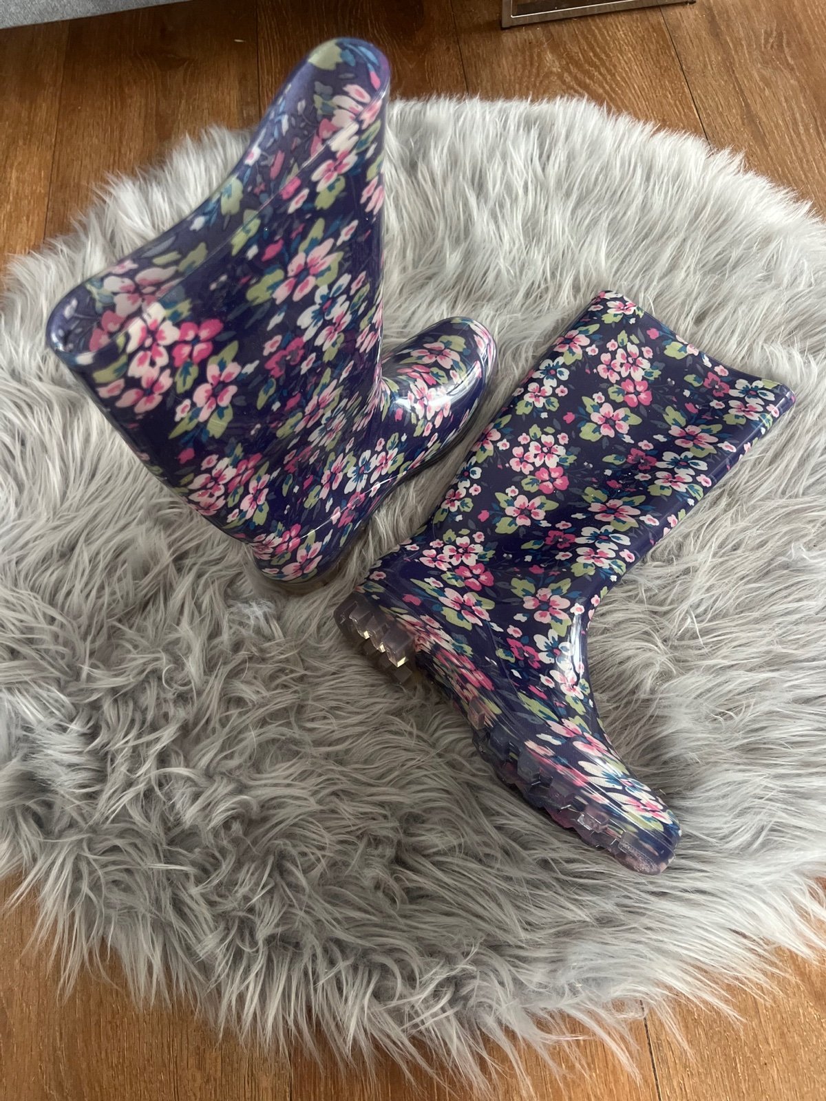 Holínky z priesvitného materiálu s vnútornou vzorovanou vrstvou, šedo-ružová farebná kombinácia. Protišmyková podrážka, vnútorná dĺžka - cca 21 cm. Vo výbornom stave. (&)