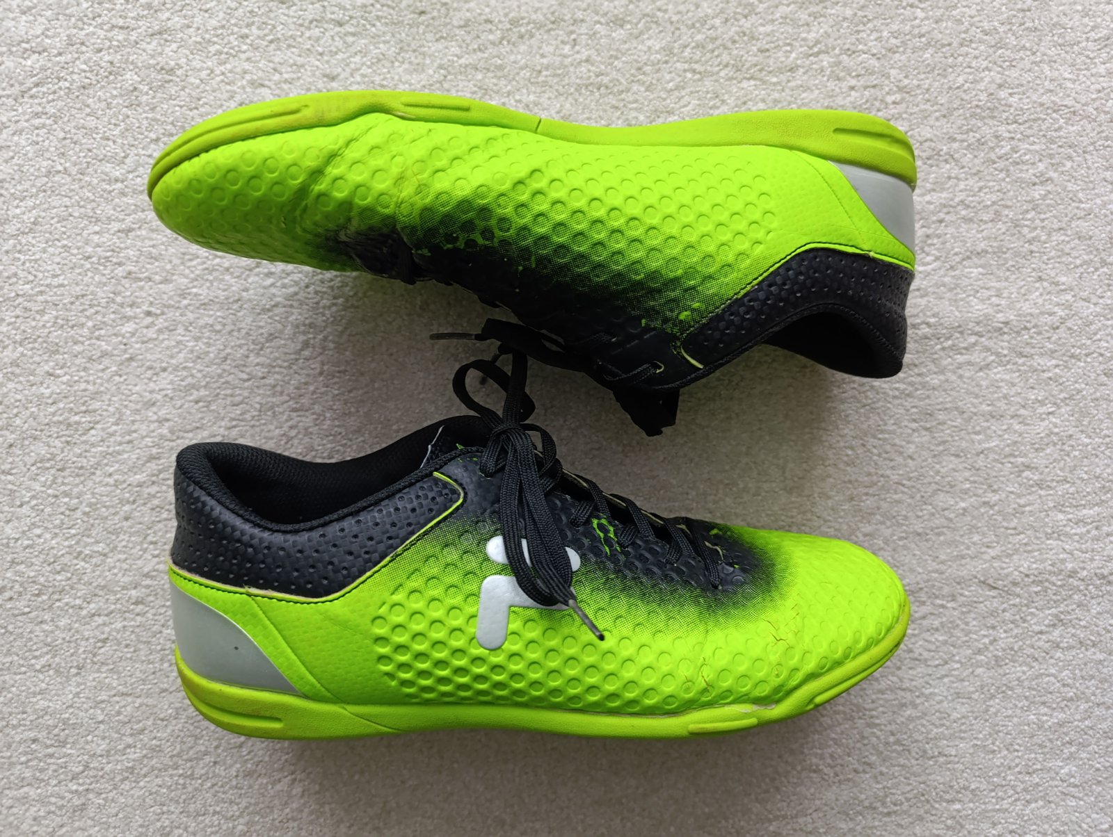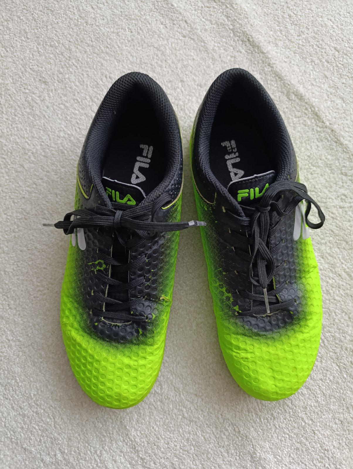Neonově zelené sálovky Fila vel. 39, stélka ca 25 cm. Trošku praskliny v materiálu na přední části bot viz foto (vyfoceno to nejhorší, nic dramatického, pro pořádek uvádím), jinak v pořádku s běžnými známkami nošení.