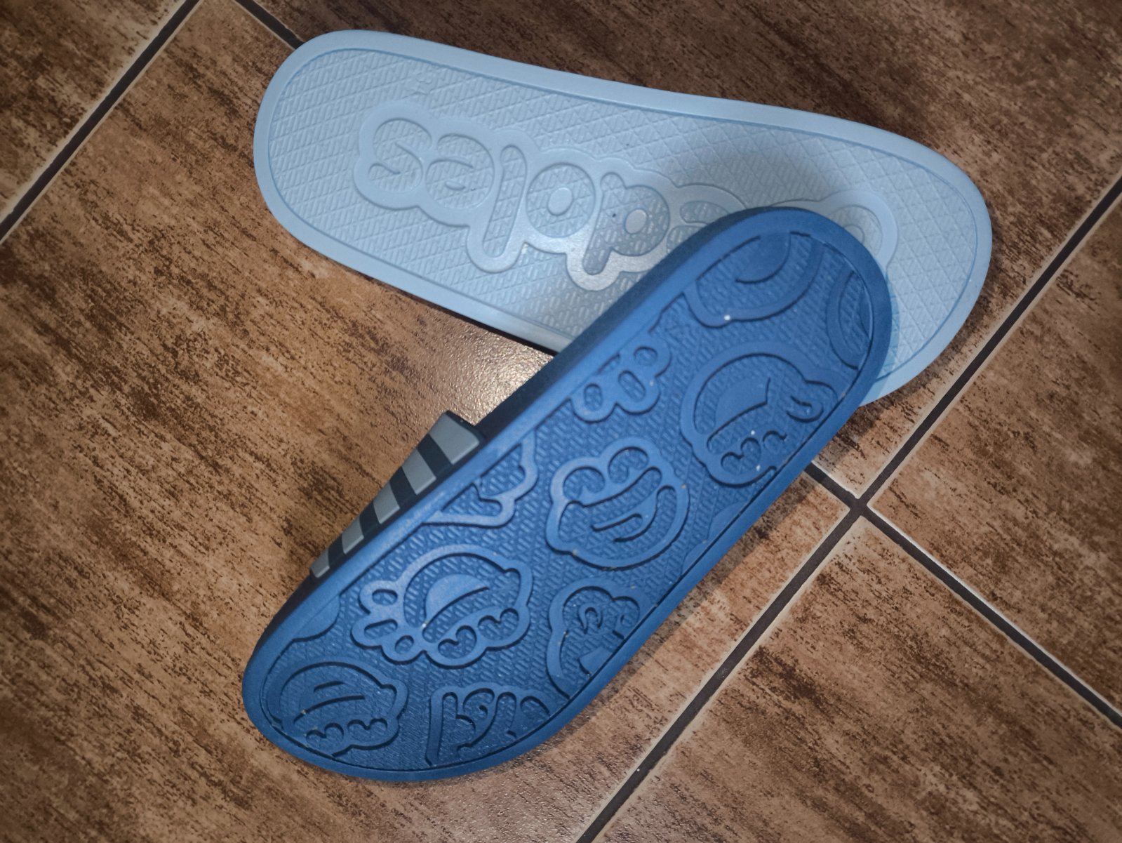Pantofle jsou v dobrém stavu, podrážka jen mírně ochozená. Na levé botě chybí pásek, který patří za patu. Není ale třeba. Pantofle drží na noze dobře i bez něj. Délka stélky 20 cm.