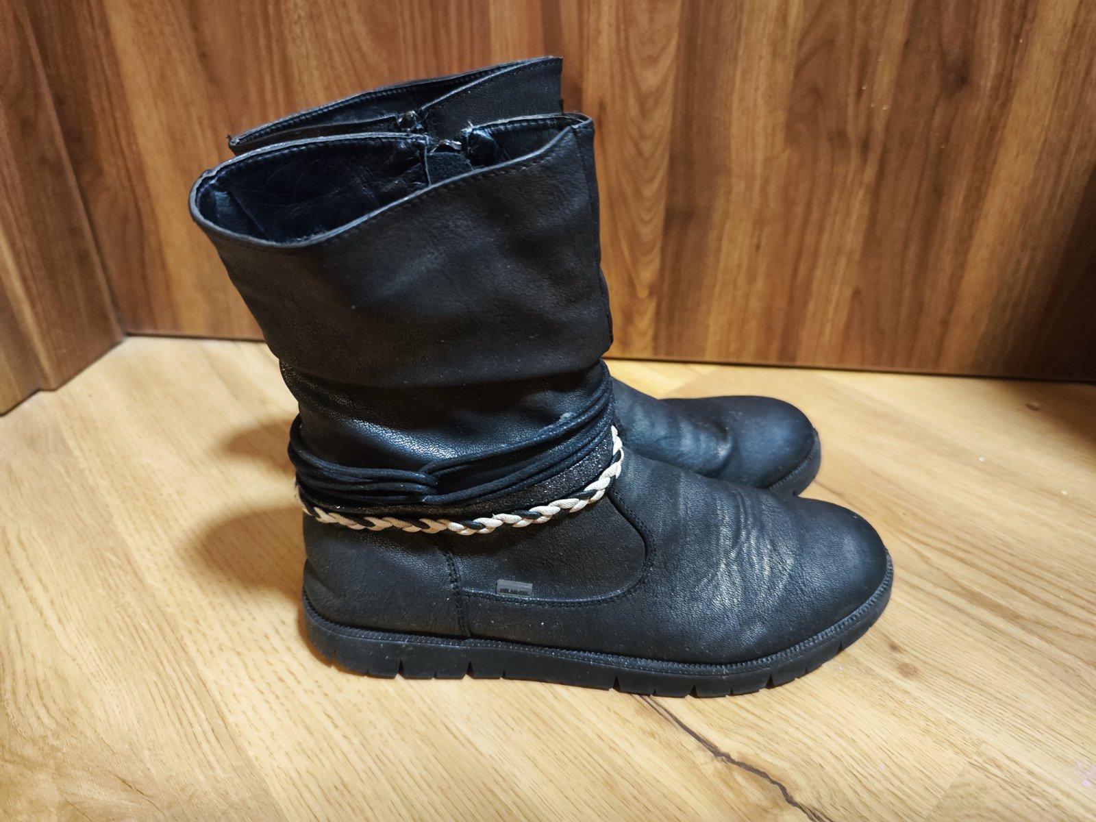 Prodám černé kozačky s bočním zipem a dekorativním opleteným páskem kolem kotníku. Velikost 39. Vhodné na zimu/jaro/podzim. Materiál Polar-tex. Cena 100 Kč, v Brně možné osobní předání.