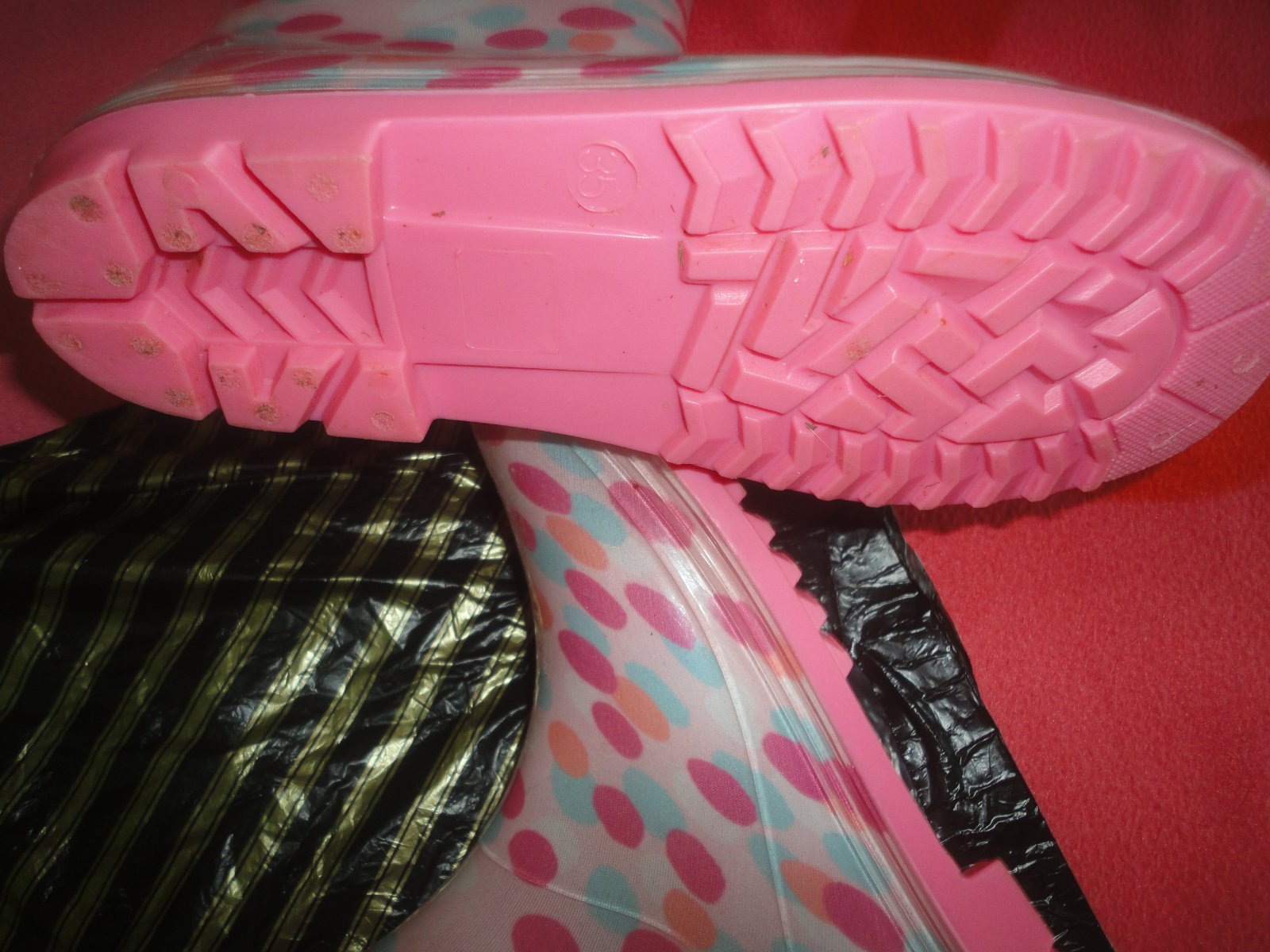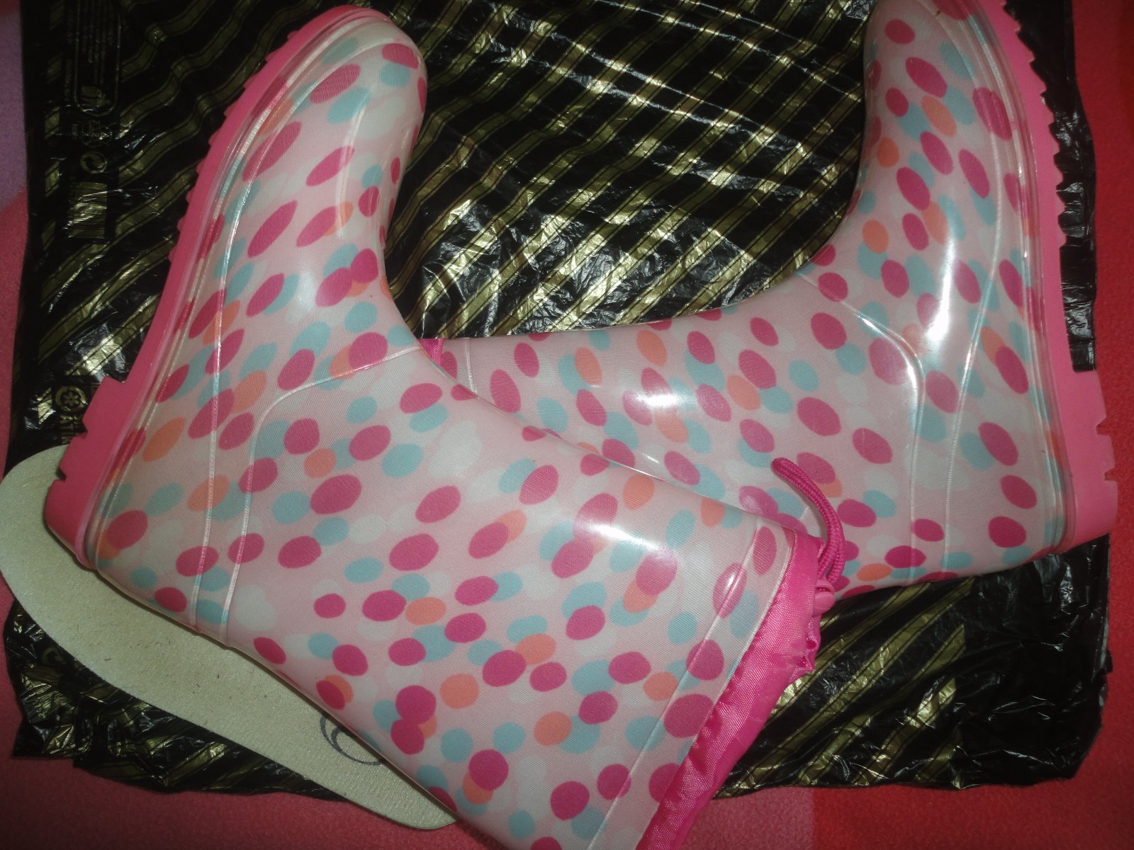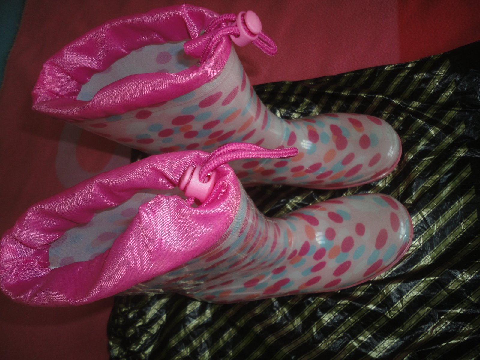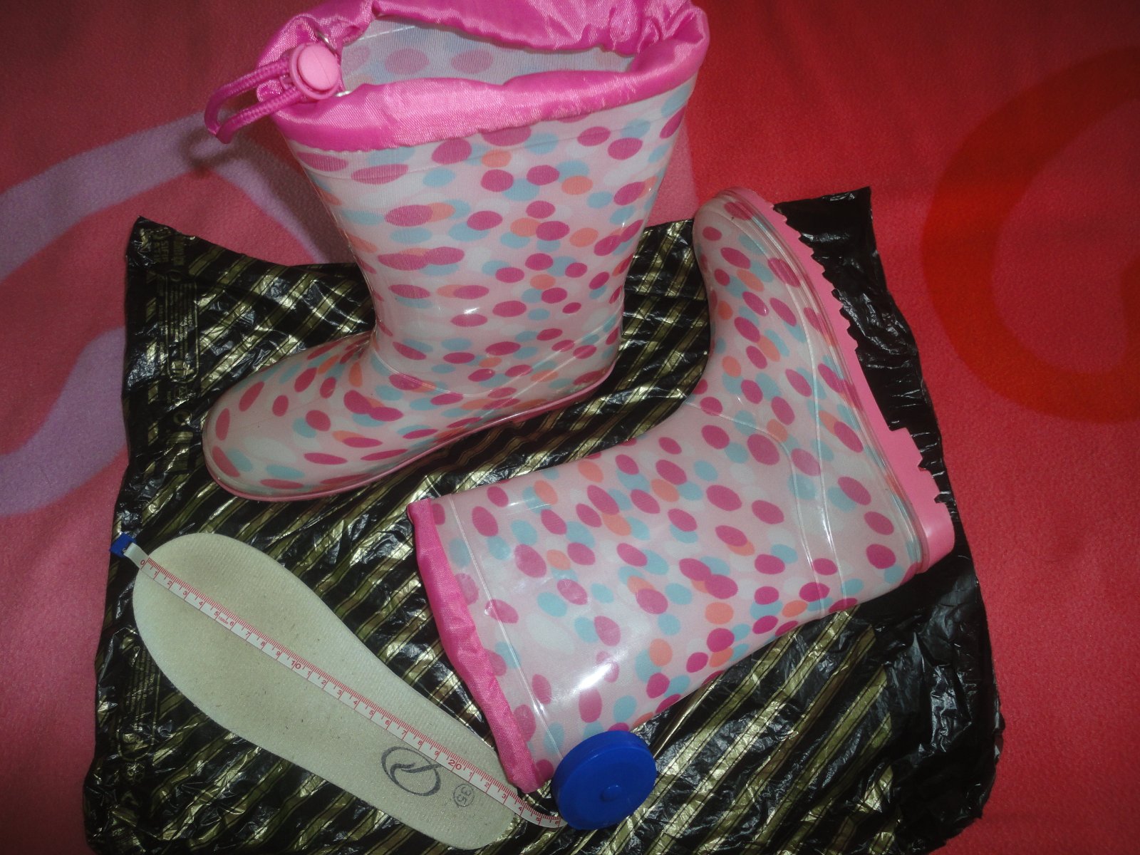 Kupované na školu v přírodě, jako nové, nesešlapané vyšší dívčí holínky, vyjímatelná vnitřní vložka, její d. je 23,5cm, výška 25cm k šusťáku s tunýlkem na stažení obvodu