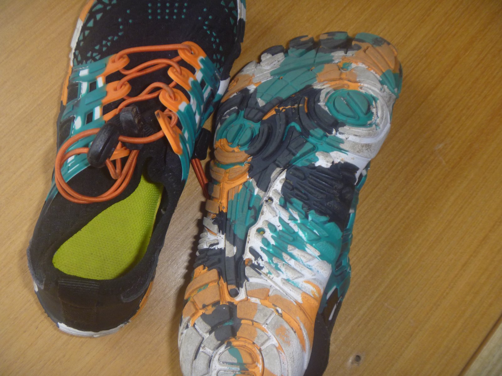 1/ černozelené s oranžovým šněrováním, podrážka stejně barevná