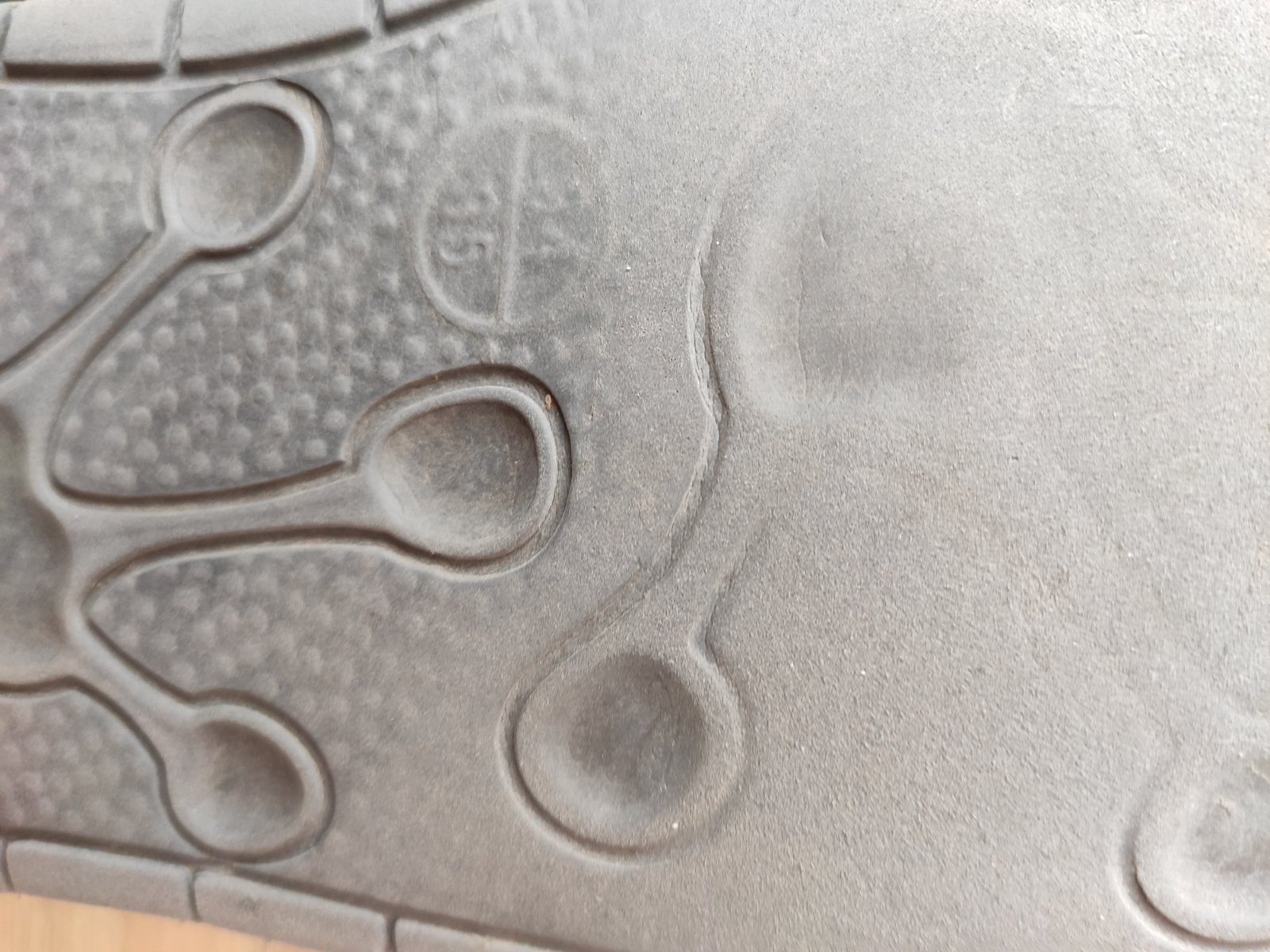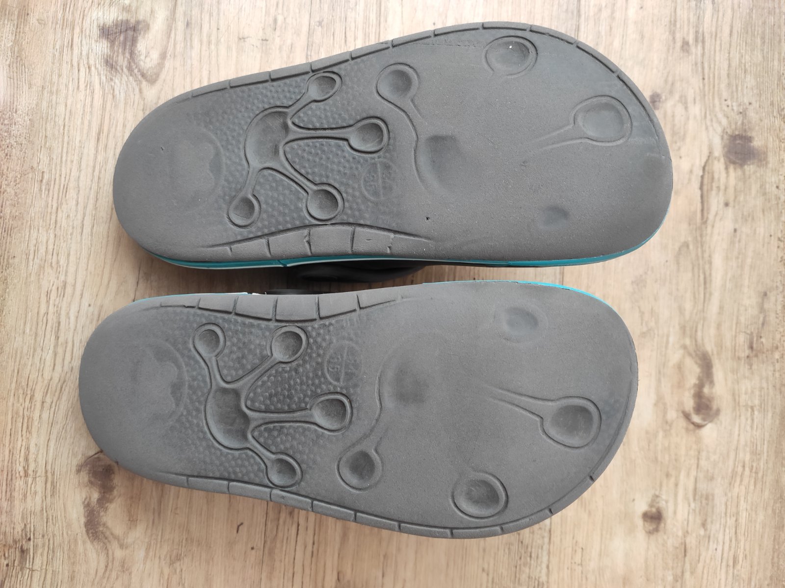 Pantofle jsou v dobrém stavu, podrážka jen mírně ochozená. Na levé botě chybí pásek, který patří za patu. Není ale třeba. Pantofle drží na noze dobře i bez něj. Délka stélky 20 cm.