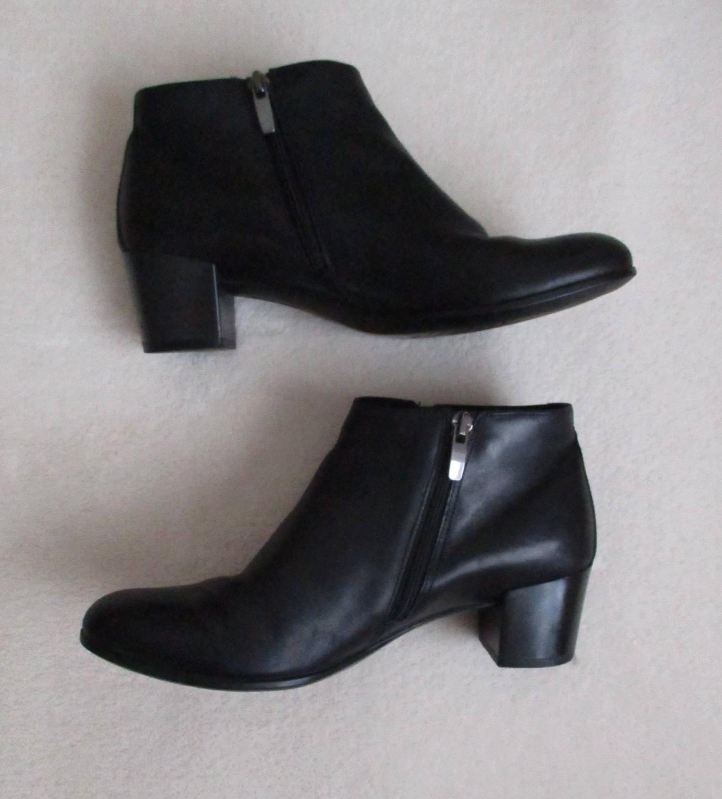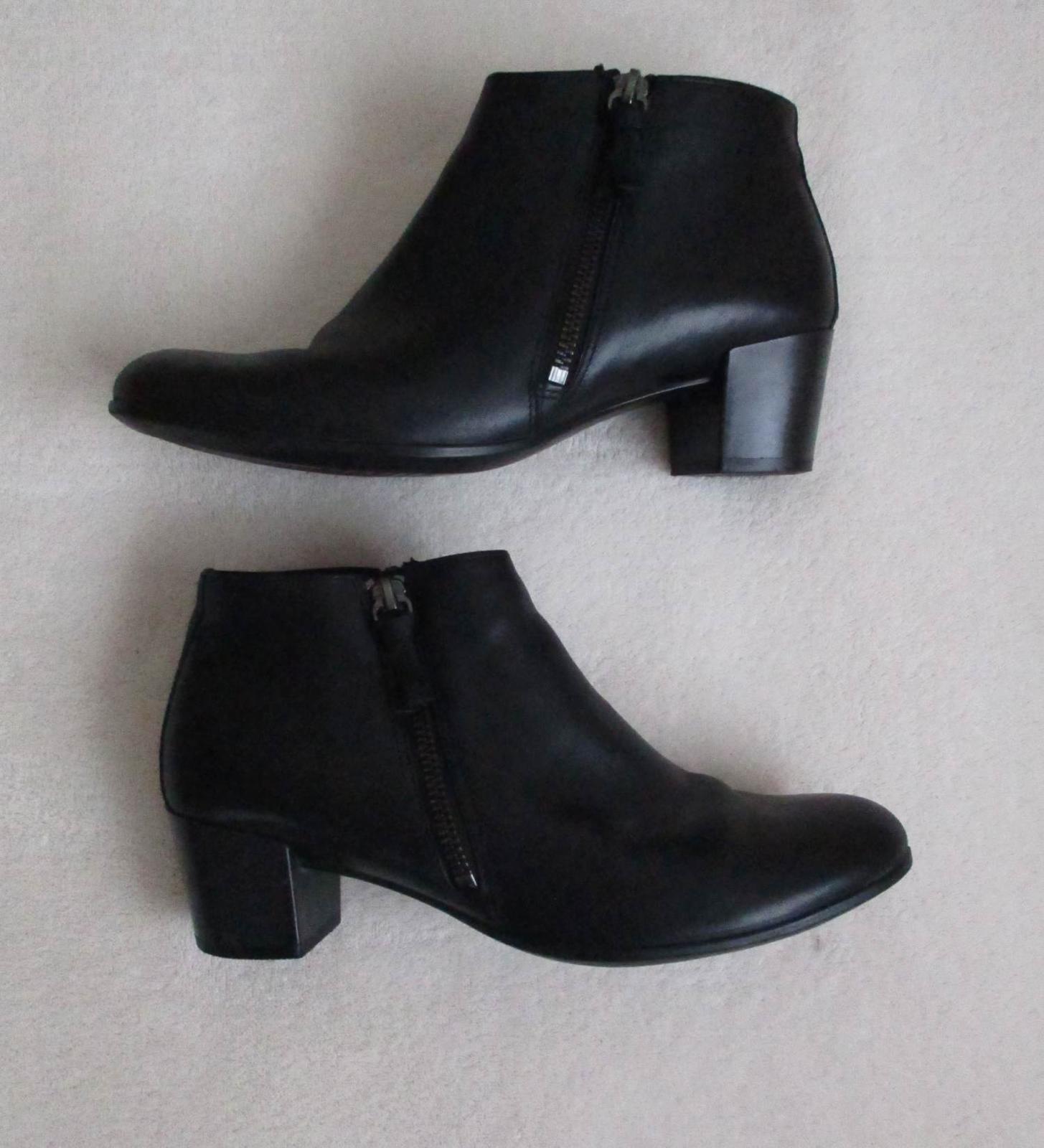 Nabízím dámské kotníkové boty zn. Ecco vel. 38, nošené krátce, trochu škrábnuté podpatky a levá špička. Jinak bez vad. Barva černá. Materiál kůže, dva funkční zipy, uvnitř nevyteplené. Vhodné na jaro/podzim. Výška podpatku 5 cm, ručně naměřená délka stélky cca 25,2 cm (cca 24,5 cm po místo ohybu).