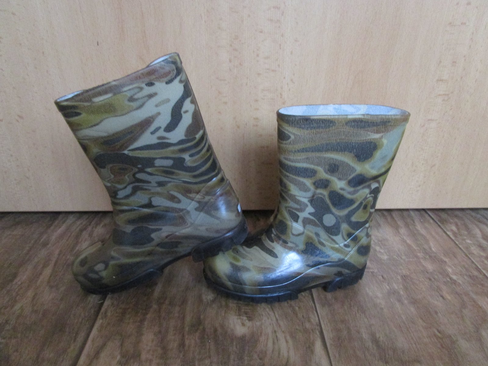 Pěkné maskáčové gumovky, č. 24/25, vnitřní stélka cca 16 cm, cena jen 49 Kč, zn. Demar.