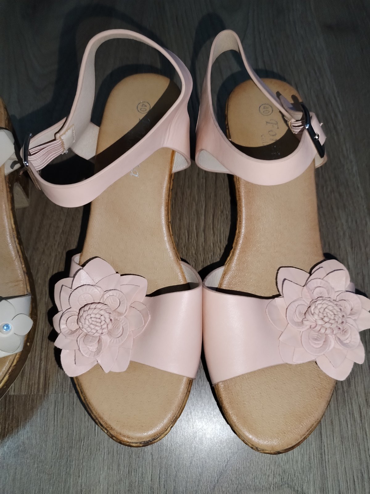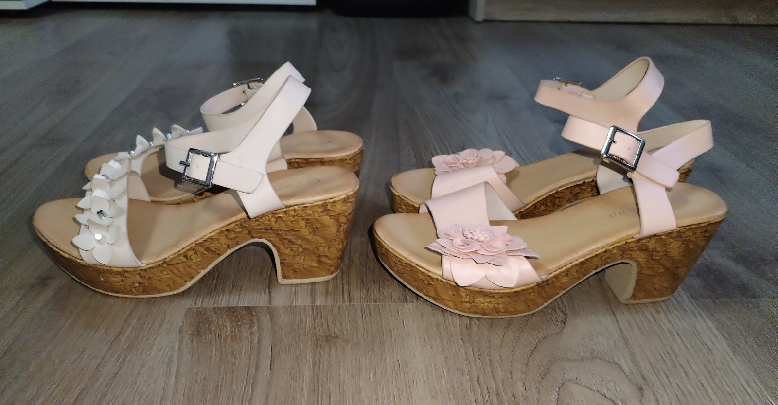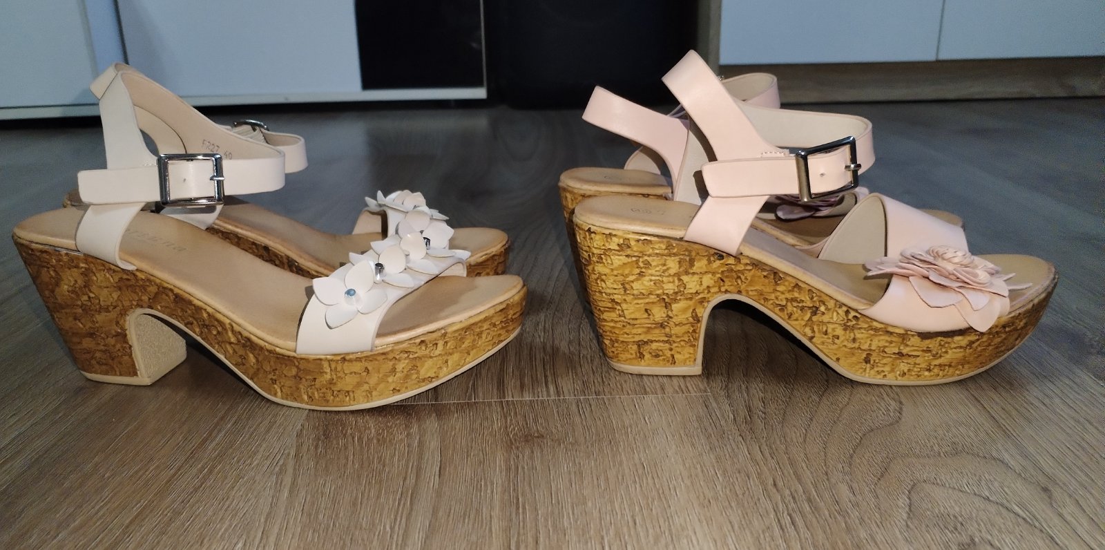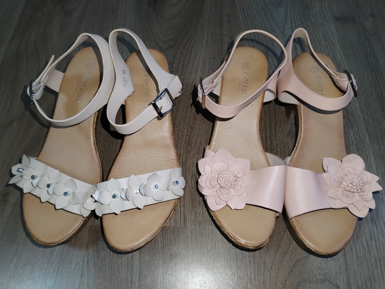 Nabízím krásné dámské letní střevíčky, 2 páry, značky Fortuna Calzatore, ve velikosti 40, délka vnitřní stélky 25 cm. Růžové s květinou a béžové s kytičkami a kamínkovou aplikací. Na lehkém korkovém podpatku o výšce 8,5 cm, se zapínáním kolem kotníku a na lehoučké korkové platformě. Moc hezké, slušivé, originální a příjemné. Vhodné i jako dárek. Na noze každý pár pouze hodinu na nafocení, tudíž stav zánovních botek – ve skvělém funkčním a vzhledovém stavu bez vad. Z čisté nekuřácké domácnosti.