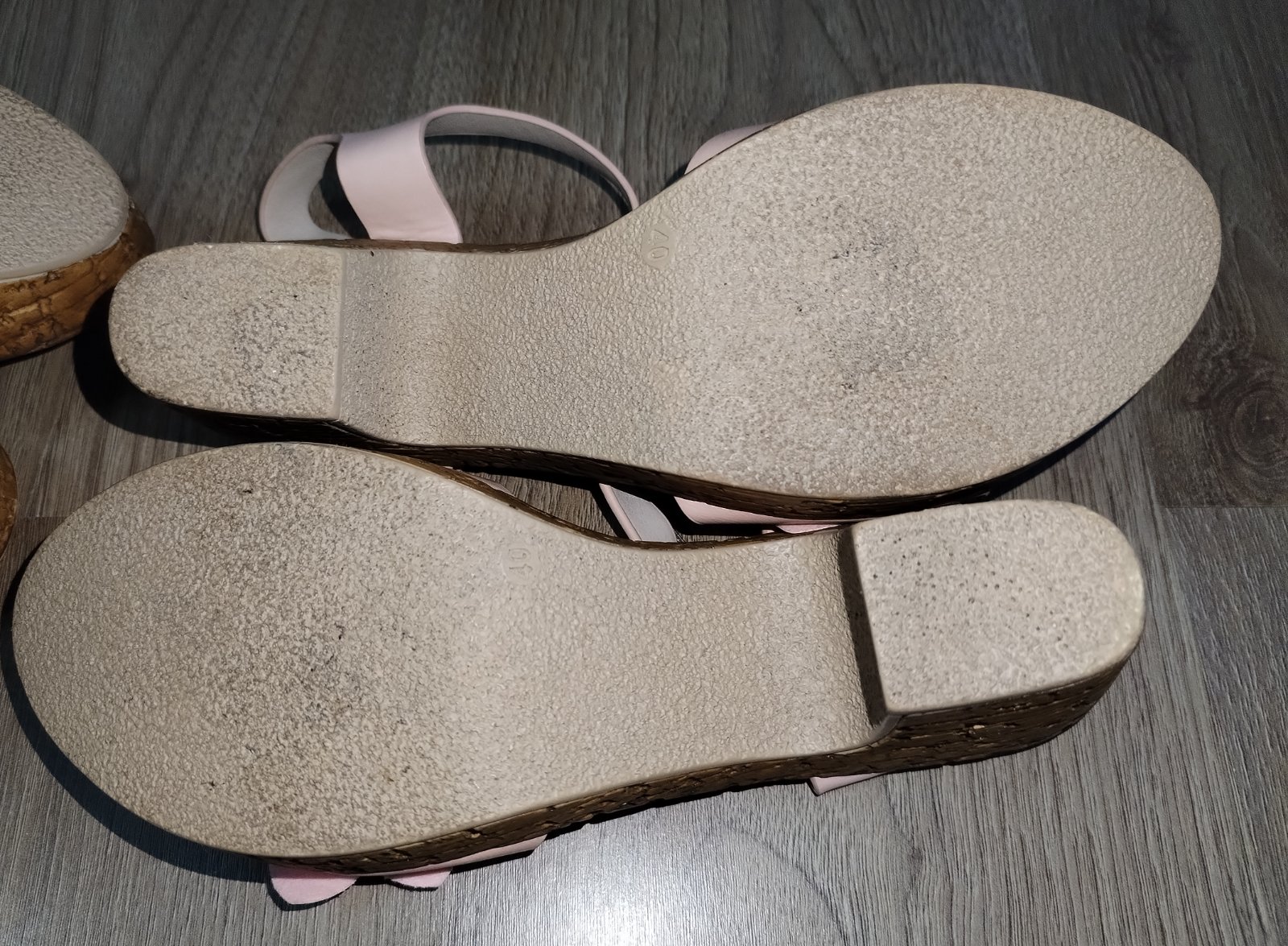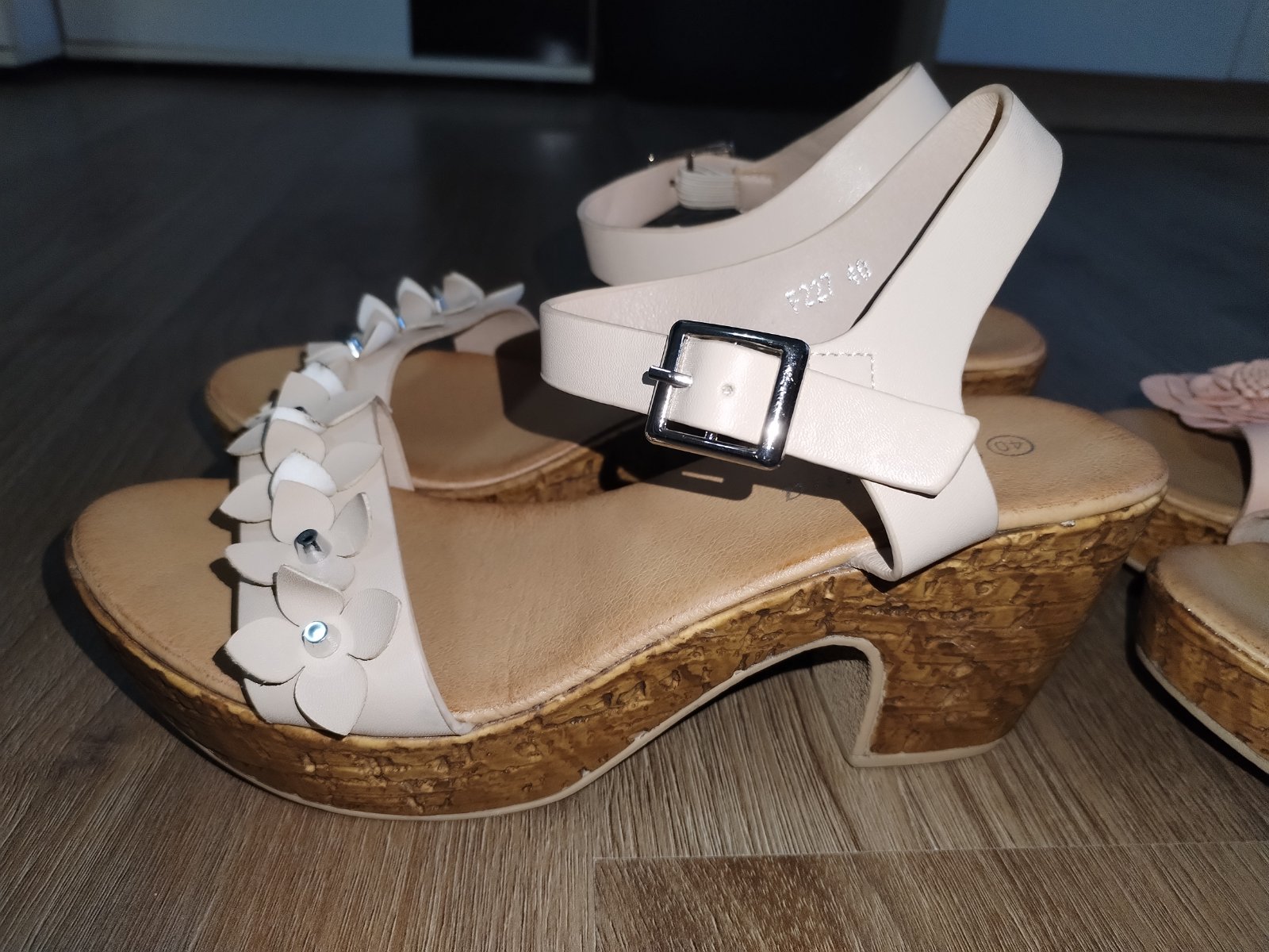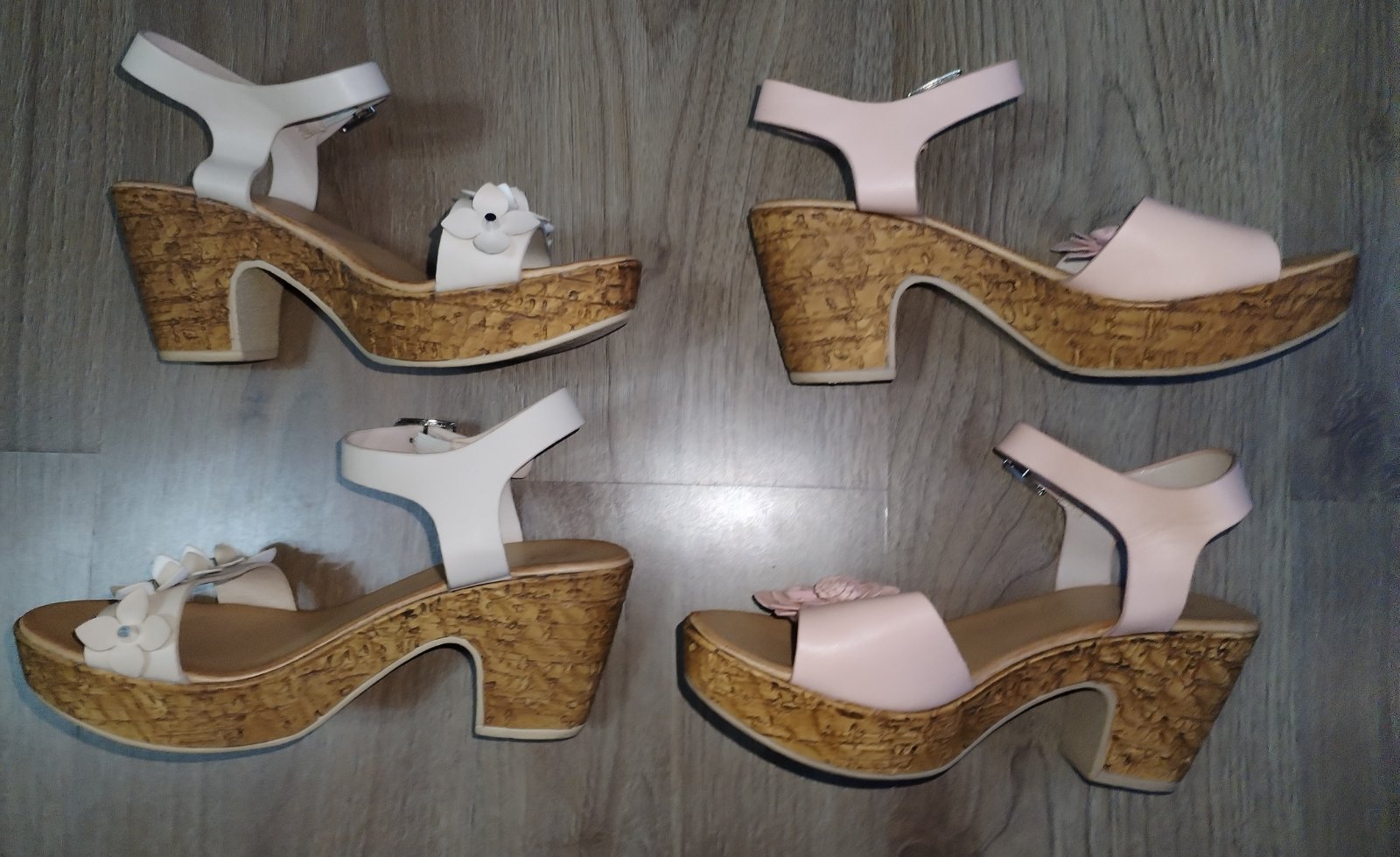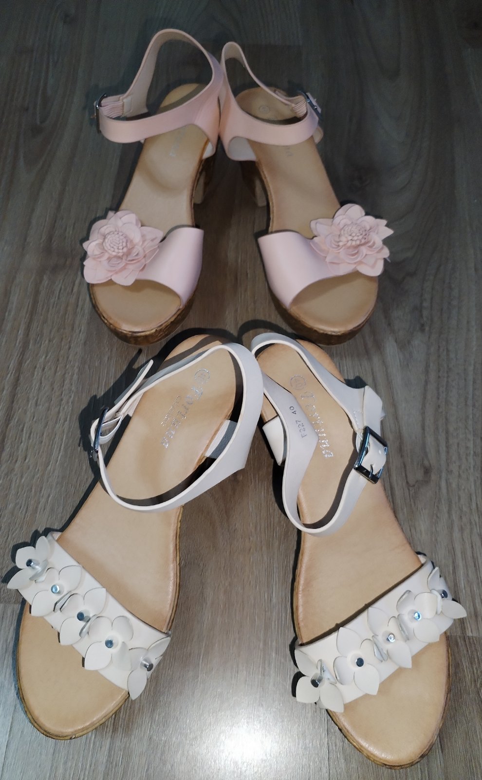 Nabízím krásné dámské letní střevíčky, 2 páry, značky Fortuna Calzatore, ve velikosti 40, délka vnitřní stélky 25 cm. Růžové s květinou a béžové s kytičkami a kamínkovou aplikací. Na lehkém korkovém podpatku o výšce 8,5 cm, se zapínáním kolem kotníku a na lehoučké korkové platformě. Moc hezké, slušivé, originální a příjemné. Vhodné i jako dárek. Na noze každý pár pouze hodinu na nafocení, tudíž stav zánovních botek – ve skvělém funkčním a vzhledovém stavu bez vad. Z čisté nekuřácké domácnosti.