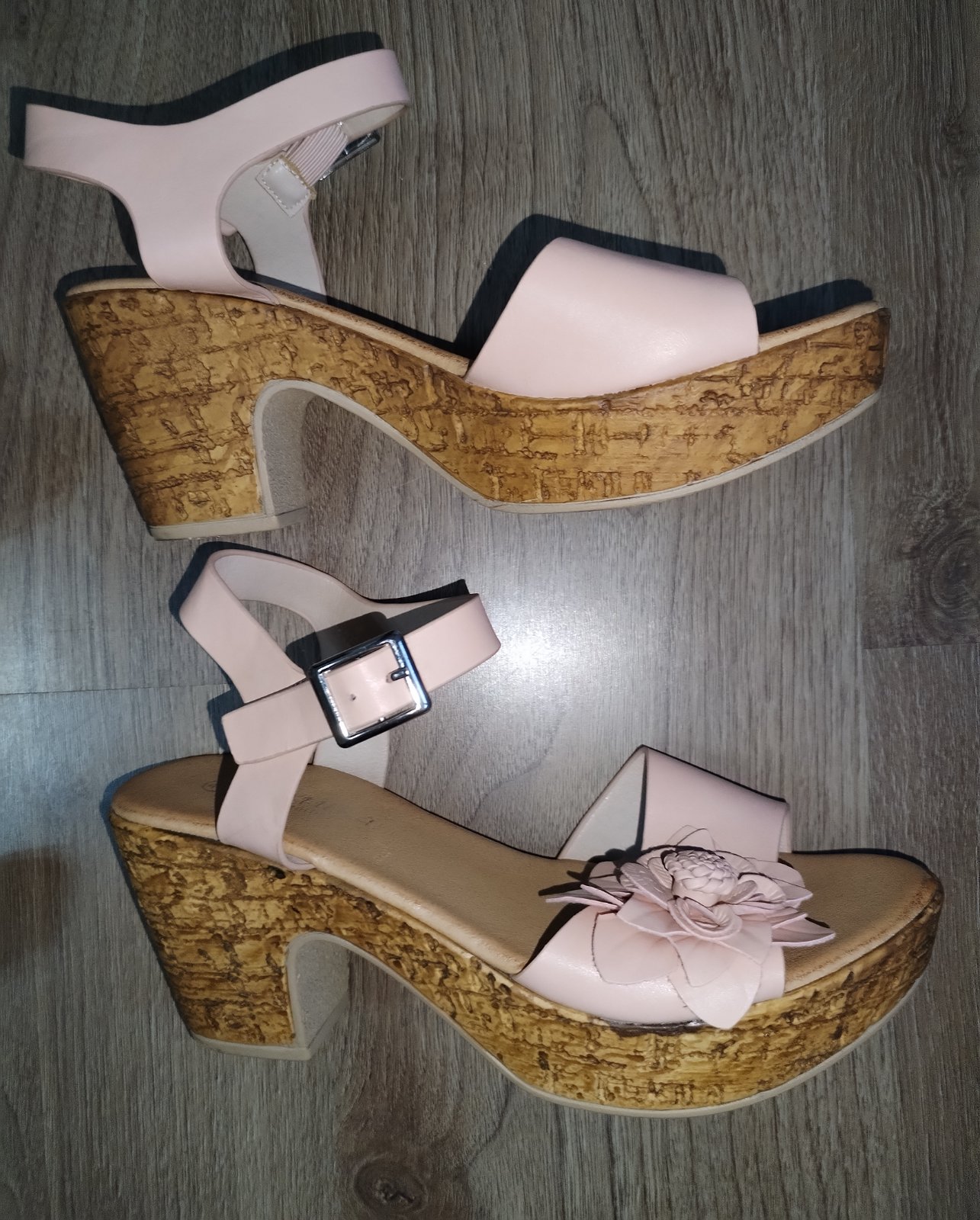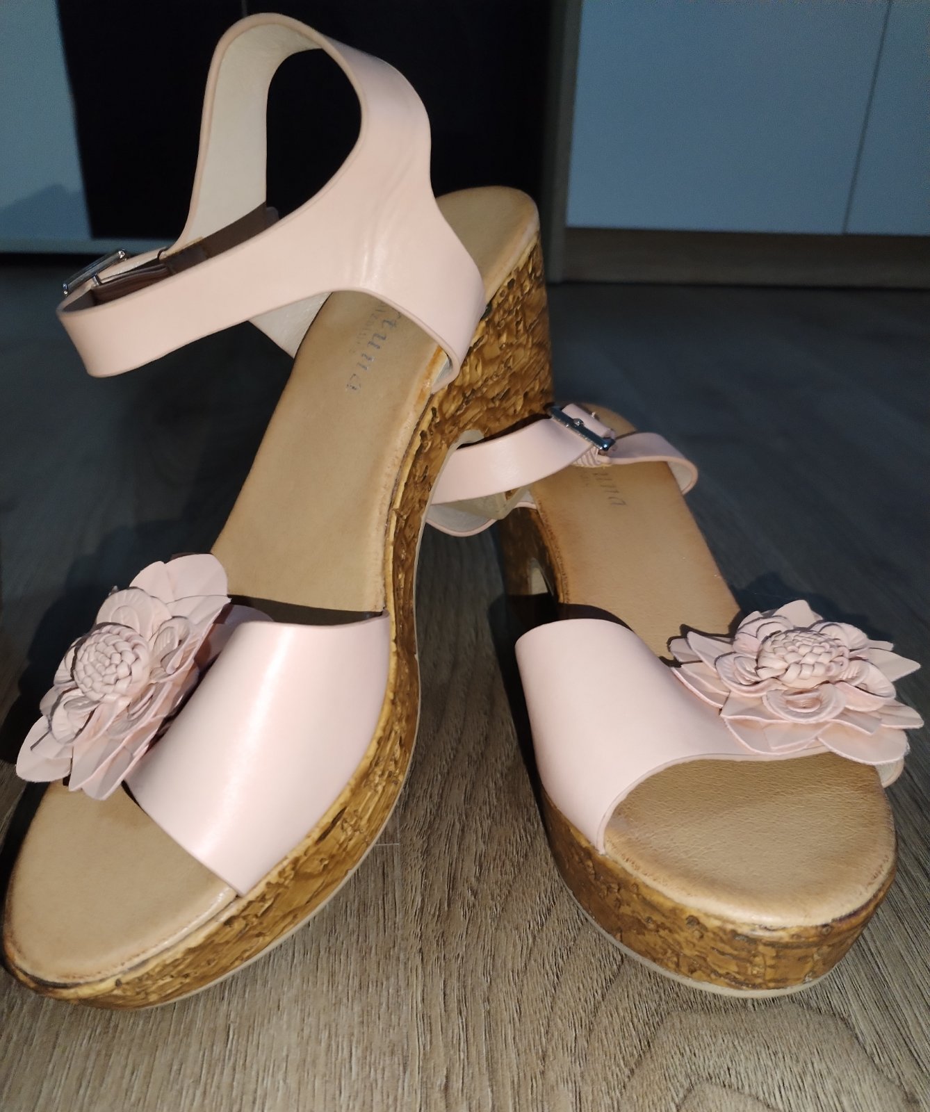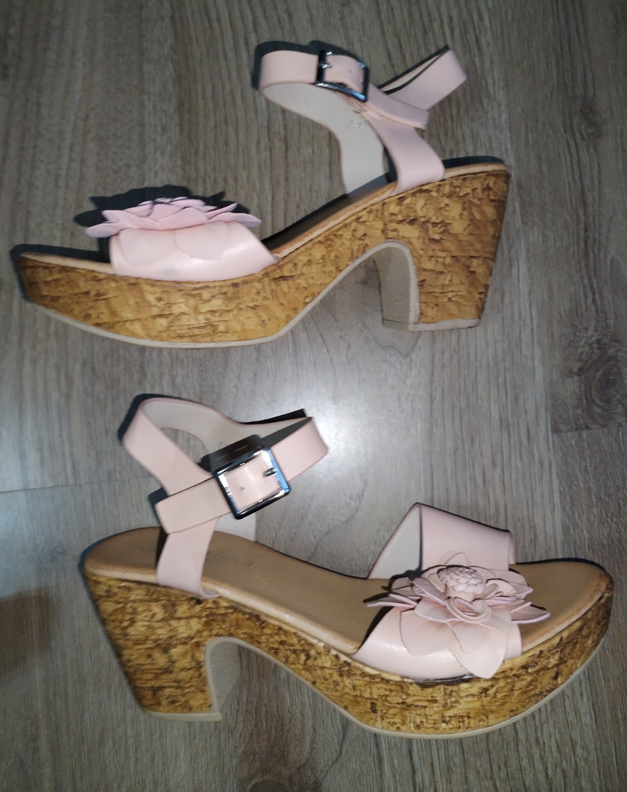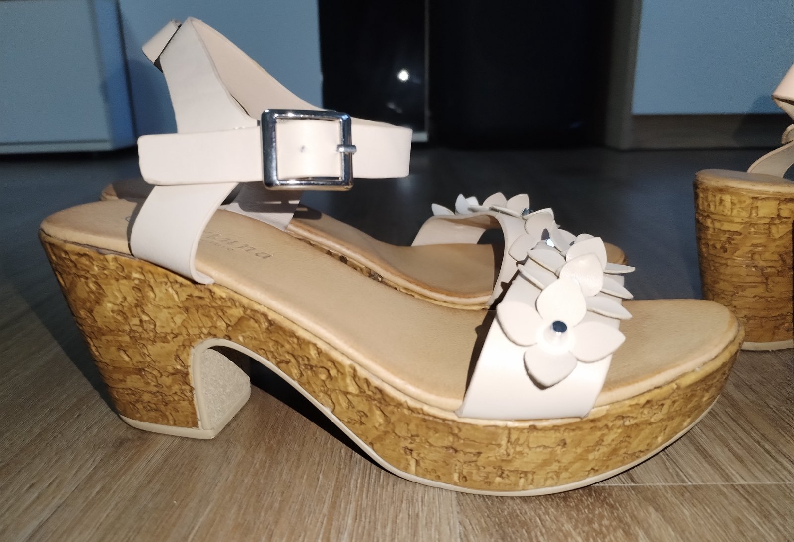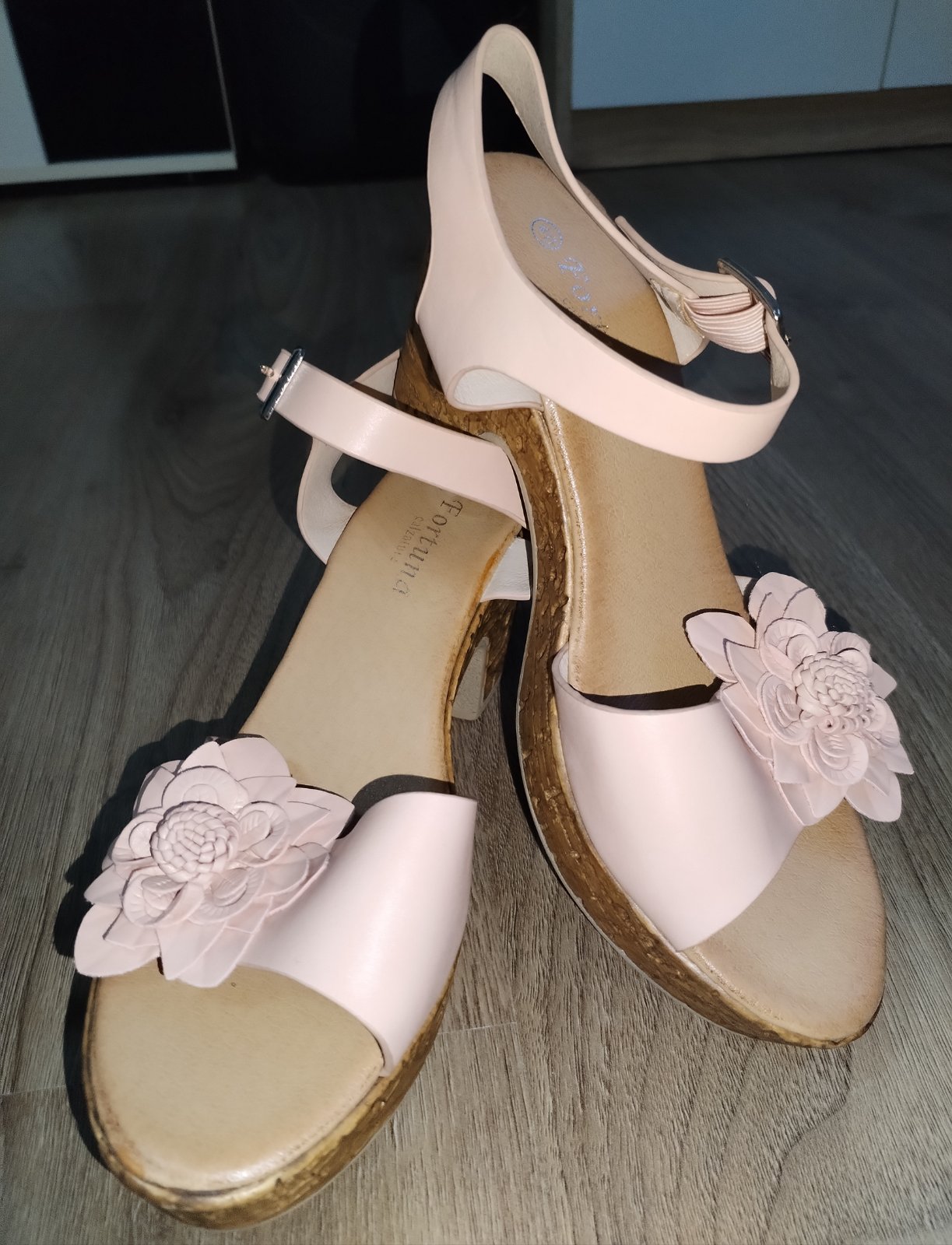 Nabízím krásné dámské letní střevíčky, 2 páry, značky Fortuna Calzatore, ve velikosti 40, délka vnitřní stélky 25 cm. Růžové s květinou a béžové s kytičkami a kamínkovou aplikací. Na lehkém korkovém podpatku o výšce 8,5 cm, se zapínáním kolem kotníku a na lehoučké korkové platformě. Moc hezké, slušivé, originální a příjemné. Vhodné i jako dárek. Na noze každý pár pouze hodinu na nafocení, tudíž stav zánovních botek – ve skvělém funkčním a vzhledovém stavu bez vad. Z čisté nekuřácké domácnosti.