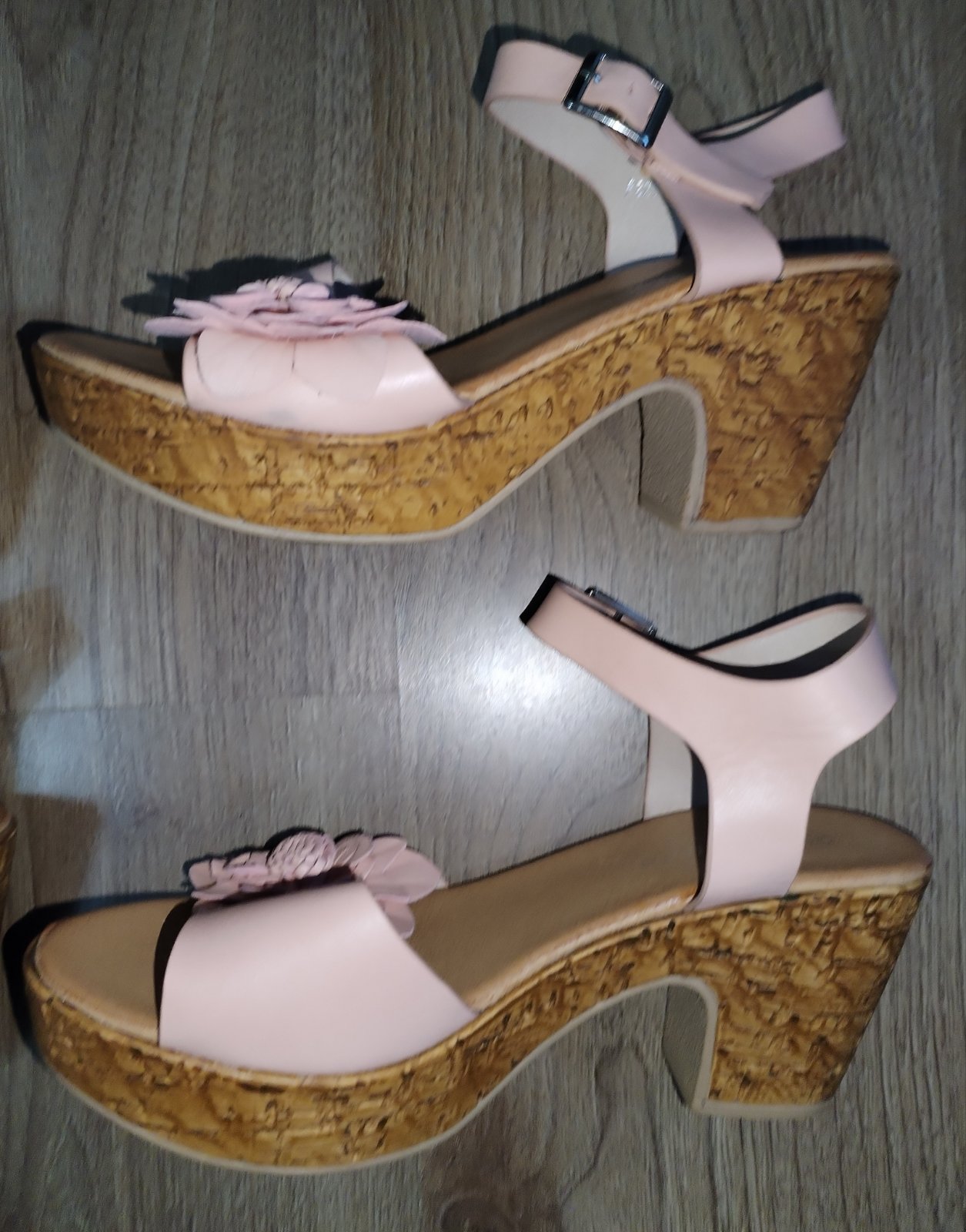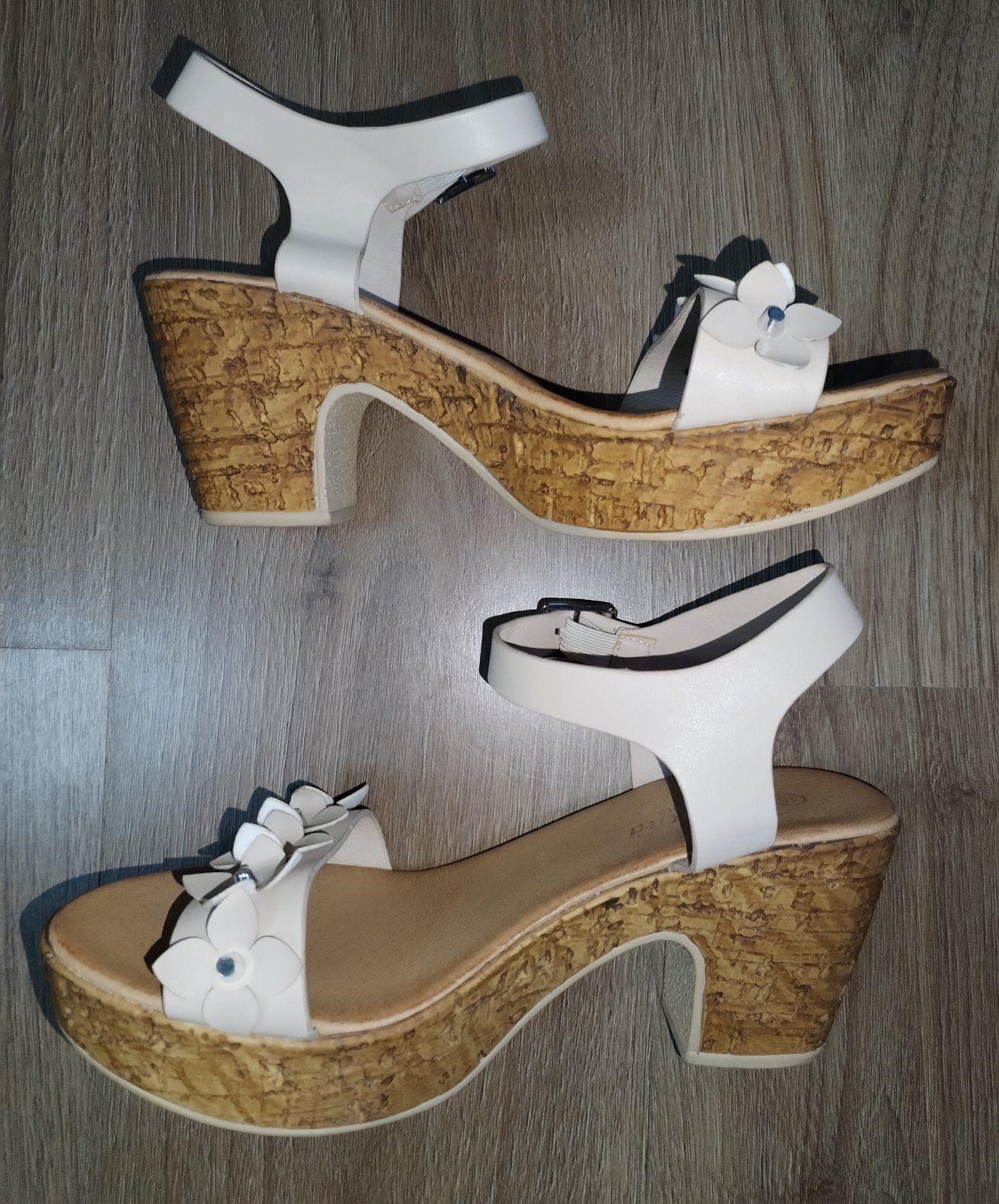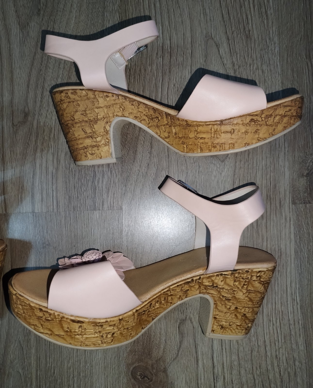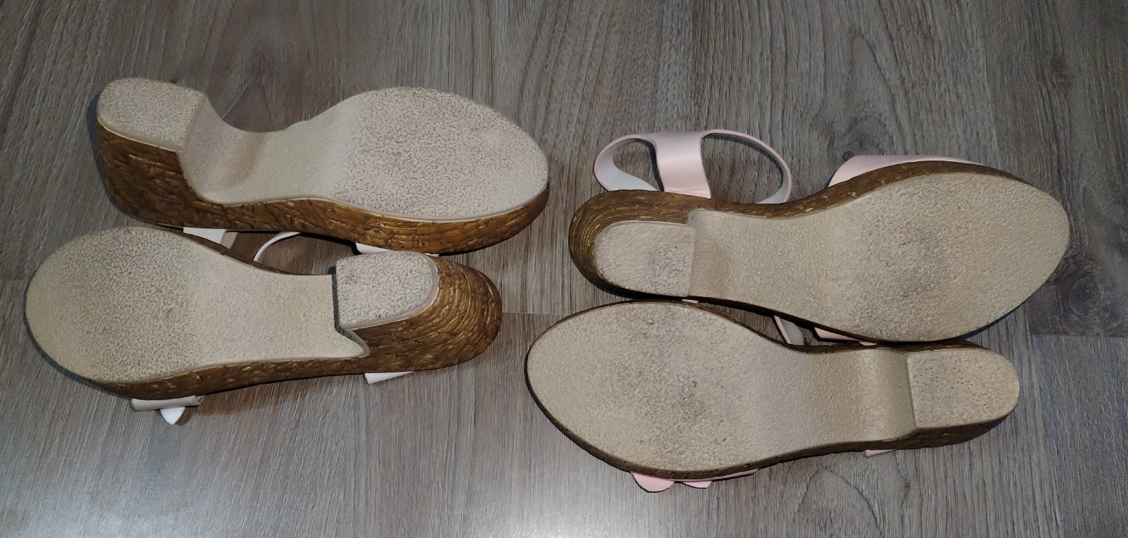 Nabízím krásné dámské letní střevíčky, 2 páry, značky Fortuna Calzatore, ve velikosti 40, délka vnitřní stélky 25 cm. Růžové s květinou a béžové s kytičkami a kamínkovou aplikací. Na lehkém korkovém podpatku o výšce 8,5 cm, se zapínáním kolem kotníku a na lehoučké korkové platformě. Moc hezké, slušivé, originální a příjemné. Vhodné i jako dárek. Na noze každý pár pouze hodinu na nafocení, tudíž stav zánovních botek – ve skvělém funkčním a vzhledovém stavu bez vad. Z čisté nekuřácké domácnosti.