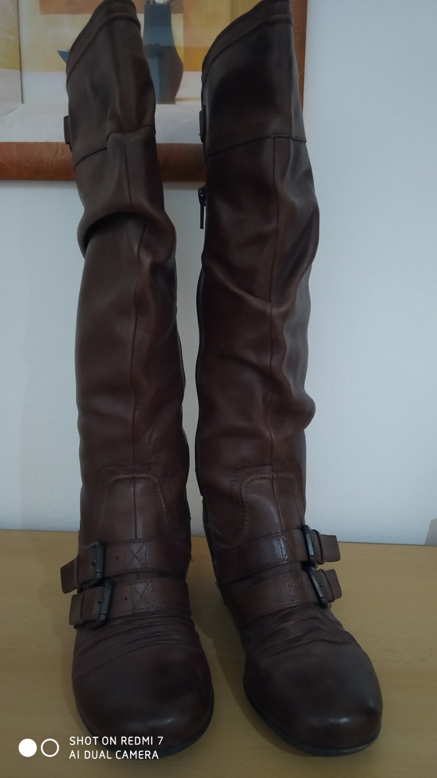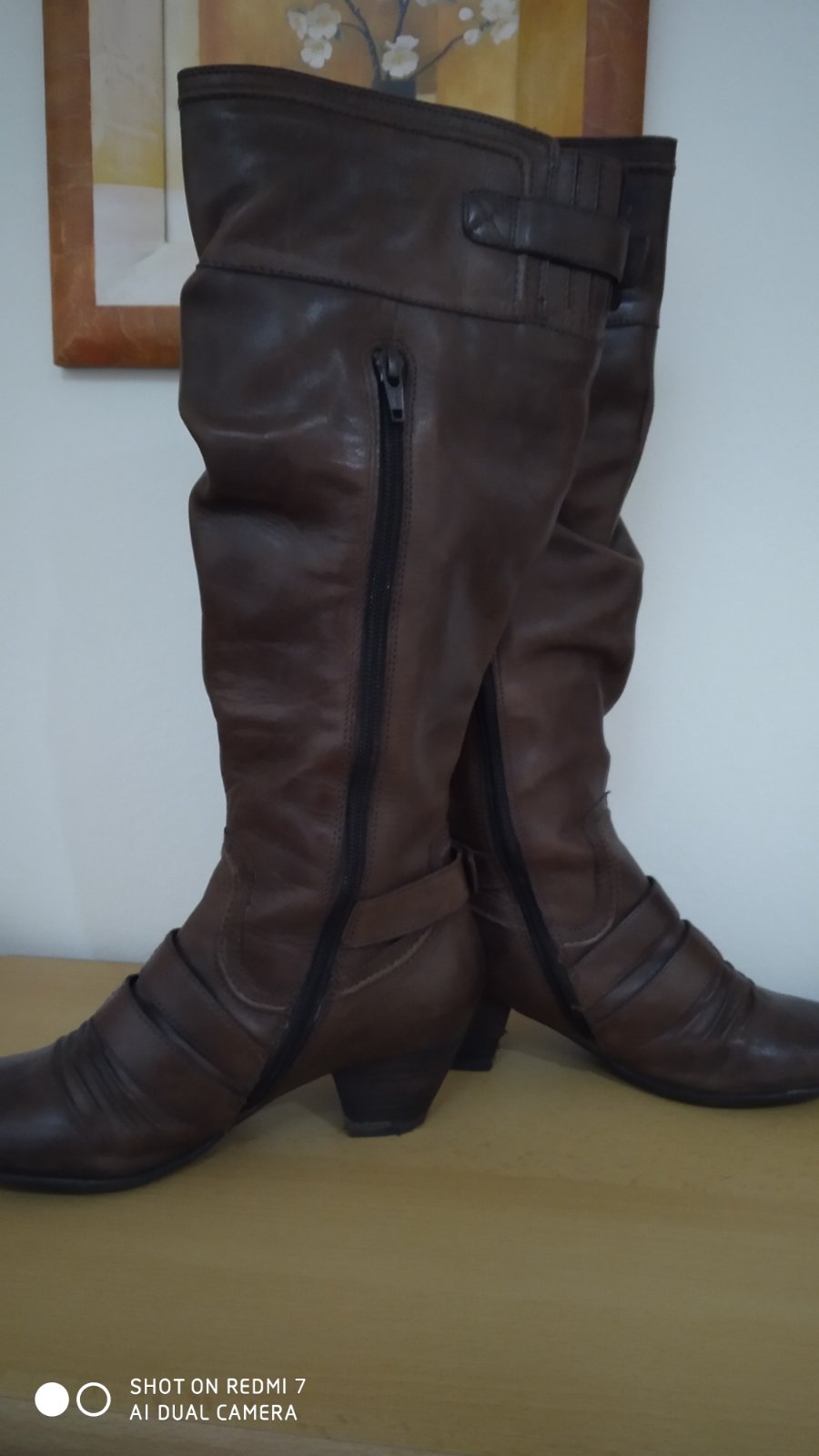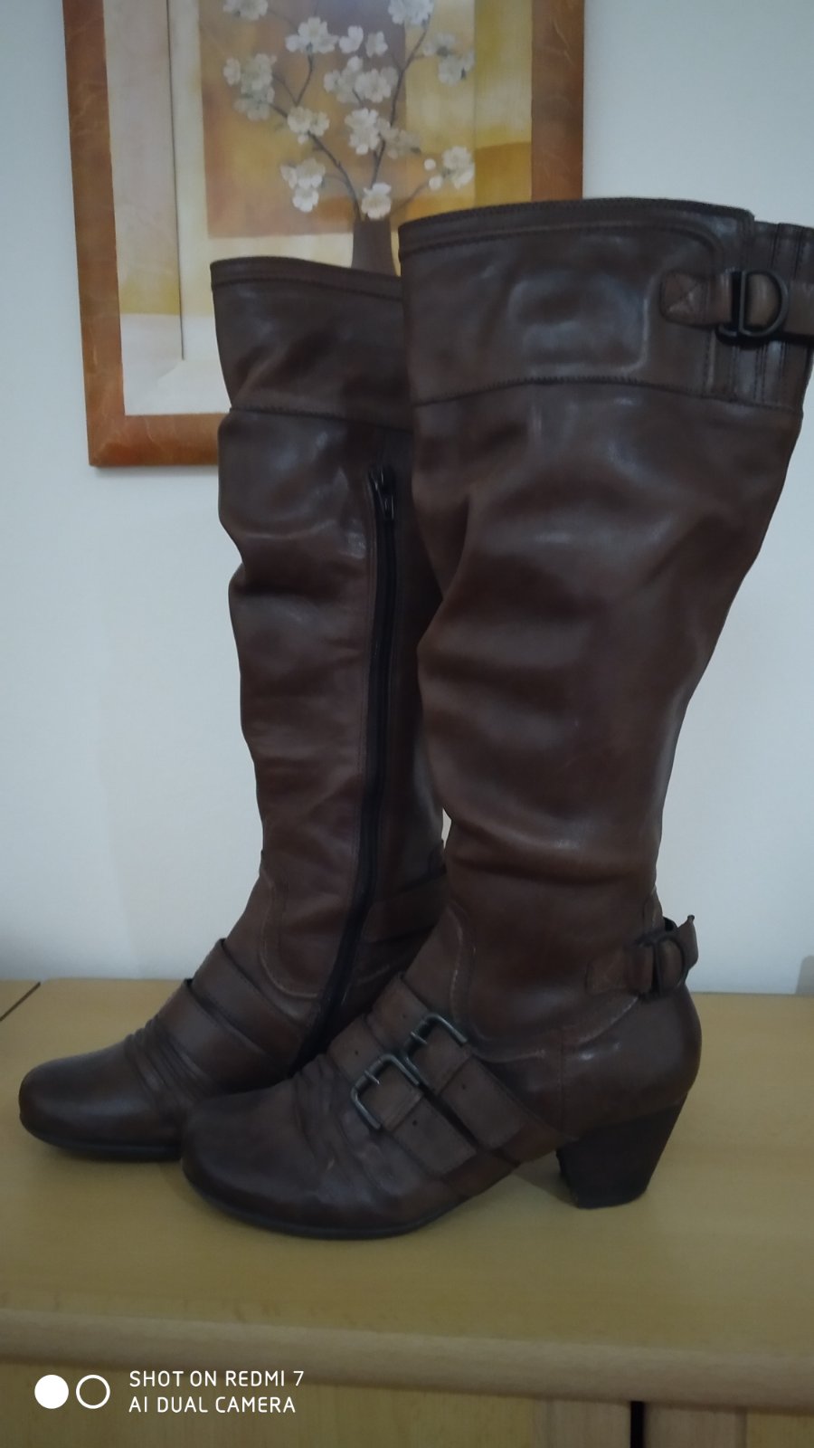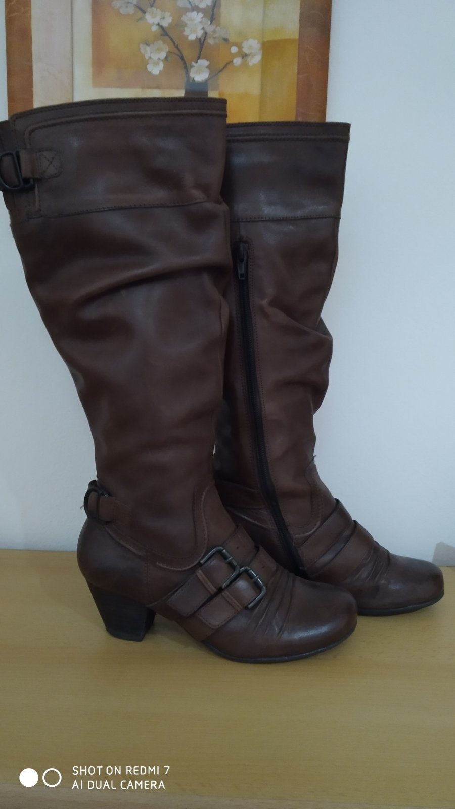Hnědé kožené kozačky, zateplené fleecem. Perfektní stav. Krátký zip pro snadné nazouvání. Míry: horní obvod 34cm,mírně ještě povolí v horní části kombinované s gumou, stélka jde bohužel dost špatně změřit,ale odpovídá 23,5-24cm. zn. Janet D. PC 2.199,-