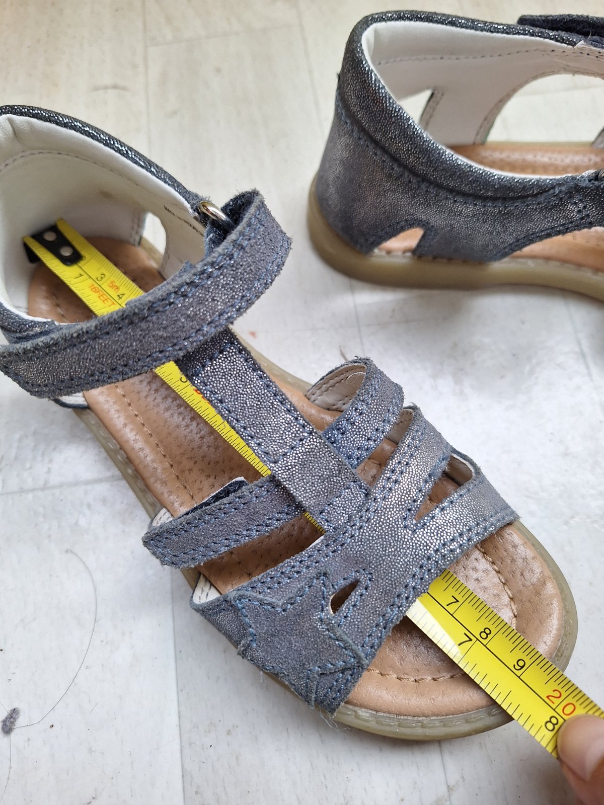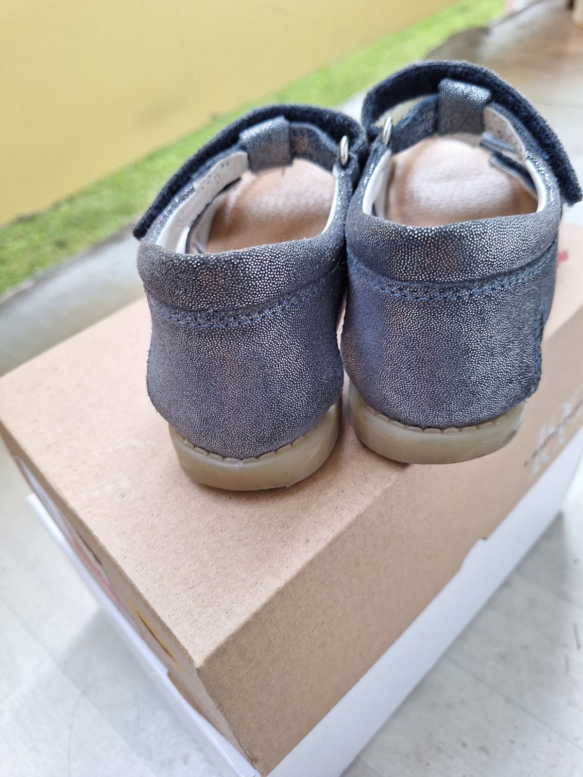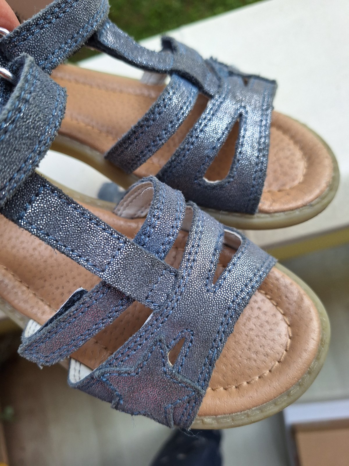 Kožené sandálky Baťa, třpytivě modré, vel. 31. Nošeny jen jednu sezonu. Zapínají se na suchý zip. Suchým zipem se dá regulovat i velikost kolem nártu. Zipy jsou funkční. Sandálky mají pevnou patu.