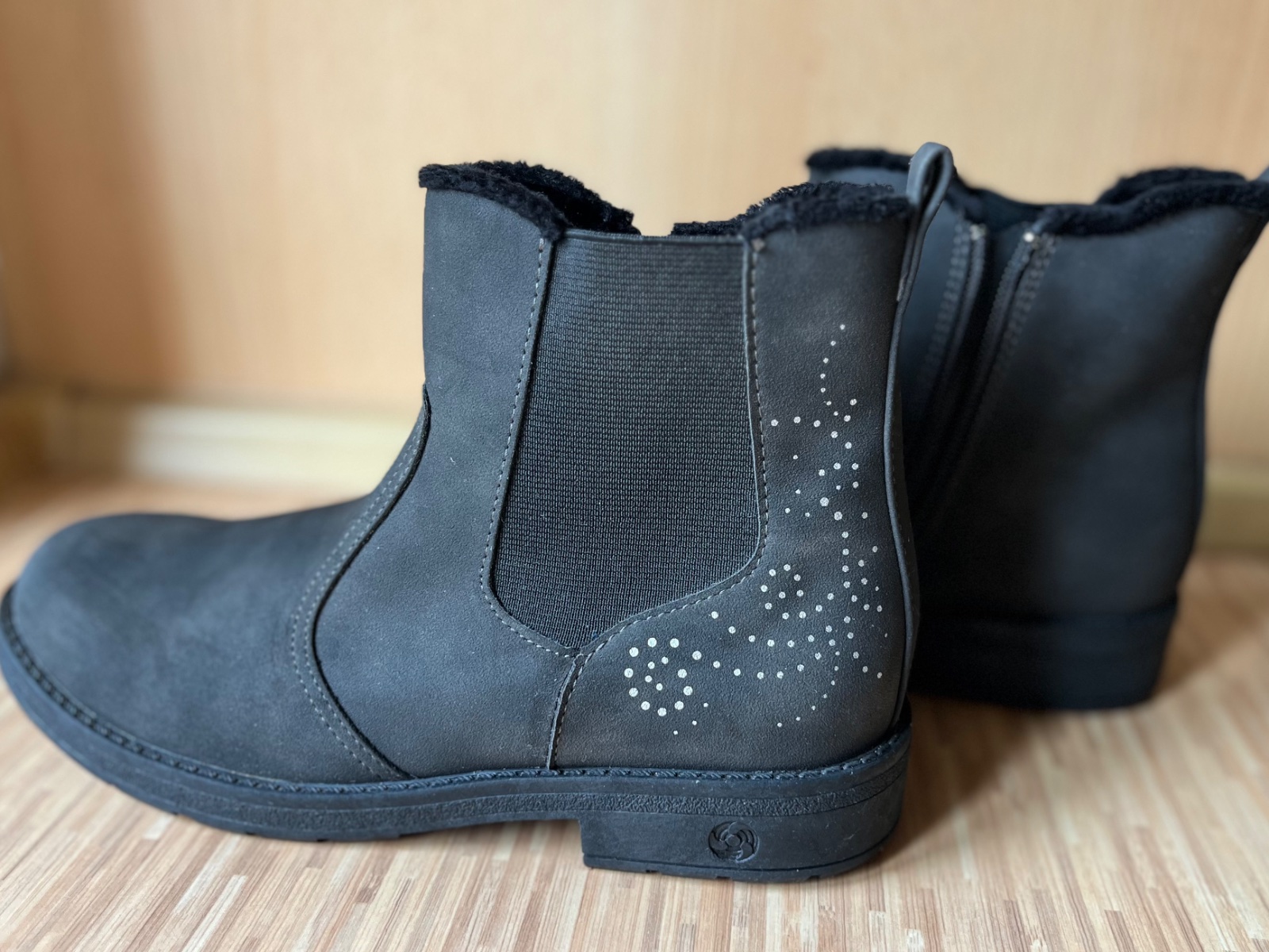 Hezké černé polokozačky z boku na zip H&M, nošené dcerou, oblíbené, je to na nich znát, kosmetické chybky mají, jedna pata prošouplá, ale určitě na dotahání ještě poslouží, kdyby dcerce byly, určit...