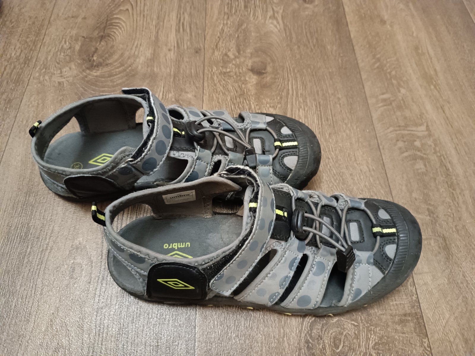 Prodám chlapecké sandály Umbro, vel. 38. Nošené na střídačku s jinými boty, pěkný stav, pouze podrážka u jedné z bot je povrchově sedřena - viz detailně v posledním fotu.